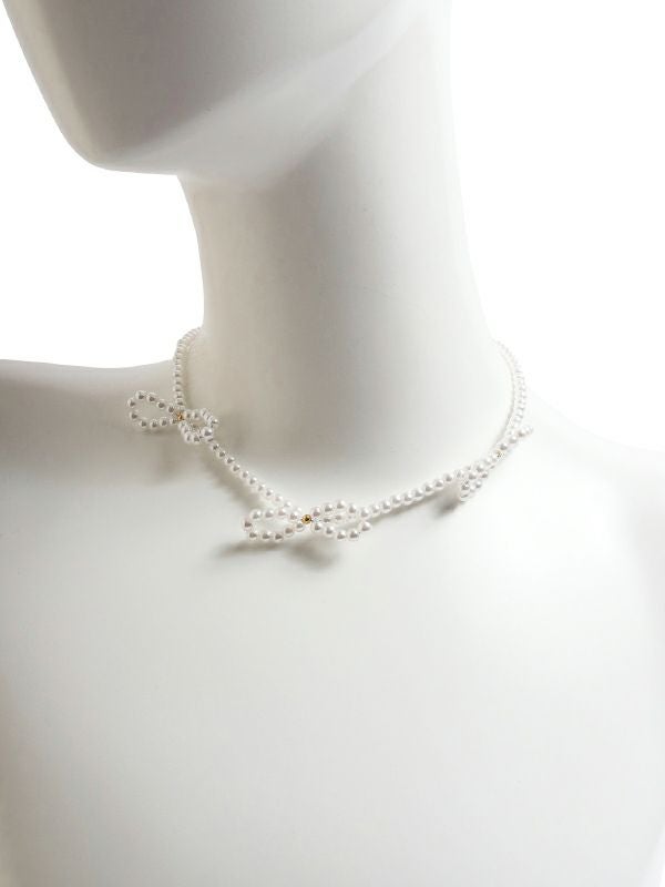 リボンモチーフが印象的なネックレスです。立体的なビーズ使いが首周りを可愛らしく演出。普段のコーディネートにプラスワンでスタイリングのポイントになるひと品です。