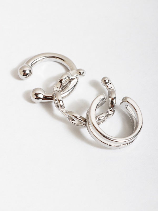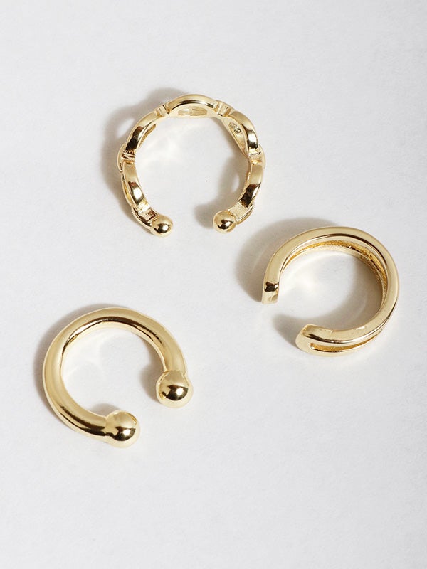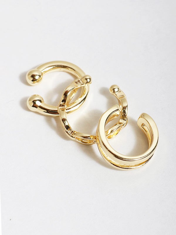 シンプルながら表情が異なる3種類のデザインがセットになったイヤカフ。小ぶりなデザインで使いやすくお持ちのピアスやイヤカフとの重ね付けもおすすめ。ピアスホールがない方でもお楽しみいただける万能デザインです。