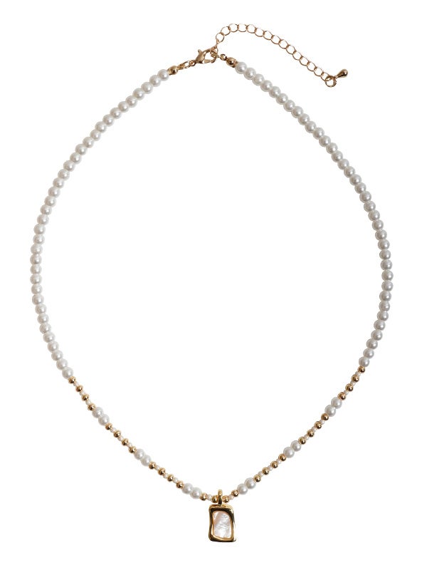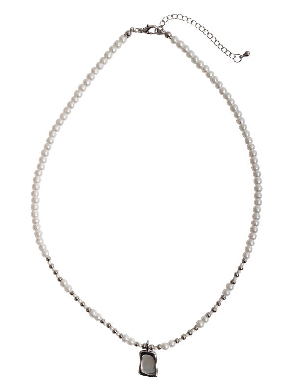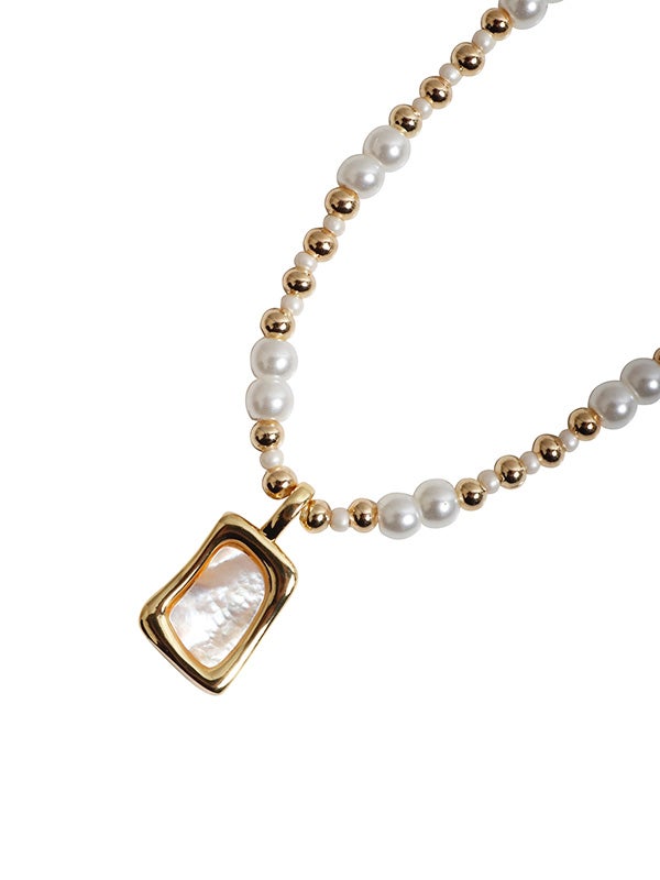 パール調ビーズとシルバー・ゴールドビーズが交互に並ぶ、華やかなデザインのネックレス。中央にはシェルのようなチャームがアクセントとなり、周りのフレームはゴールドまたはシルバーで上品な輝きをプラス。エレガントでありながらも、日常使いにもぴったりなアイテムです。