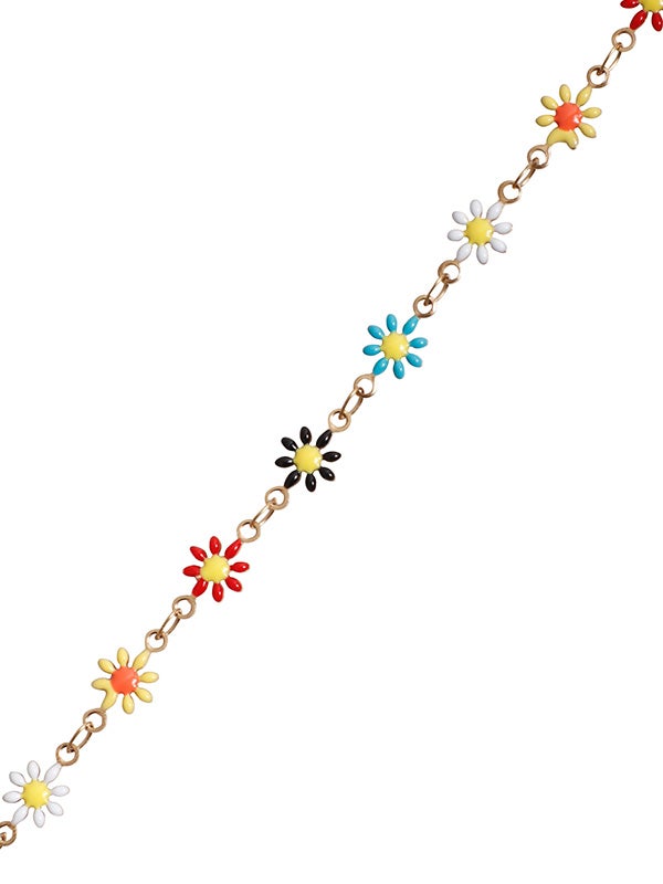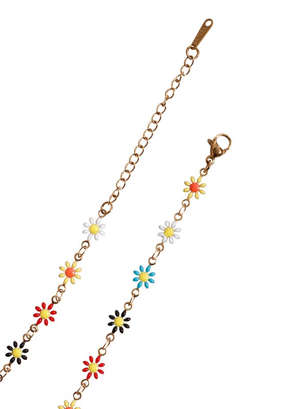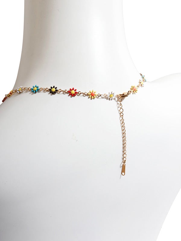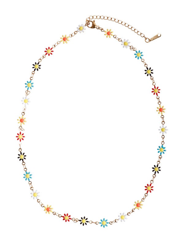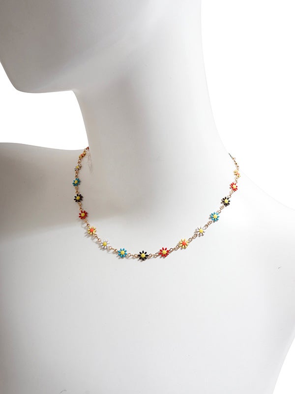 明るくぱっきりとしたカラートーンで、小ぶりな花が連なる可愛らしいネックレス。シンプルながらも華やかな印象を与え、カジュアルスタイルにぴったり。春や夏のコーディネートにぴったりのアイテムです。
