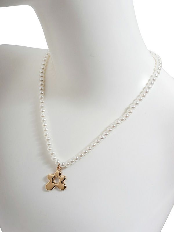 パールビーズが連なるネックレスは、胸元に華やかさを添えます。ゴールドカラーのフラワーモチーフが程よい存在感を放ち、デイリーユースからちょっとしたお出かけまで活躍するひと品です。