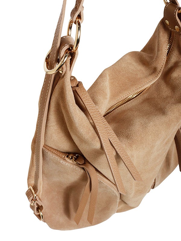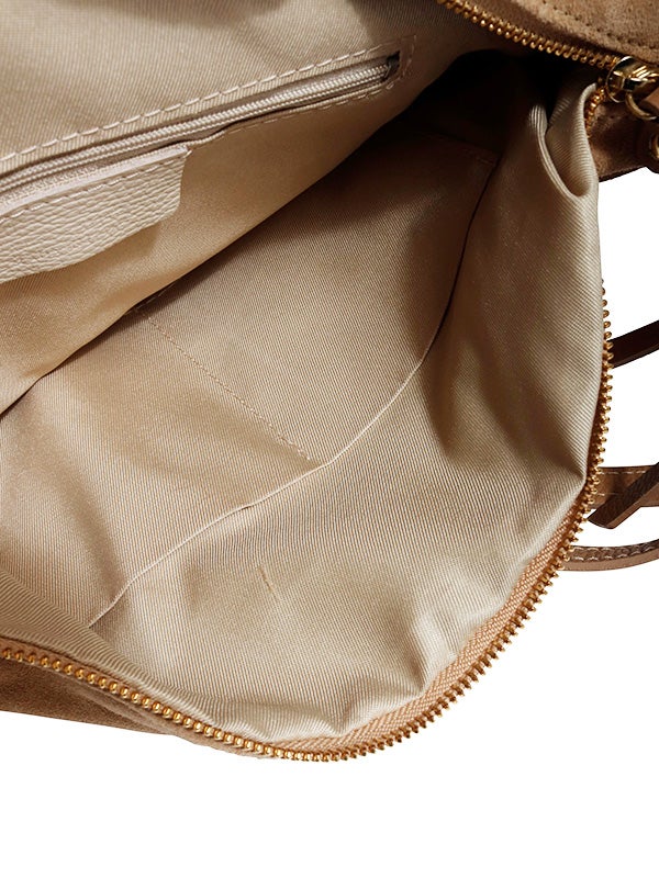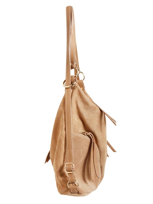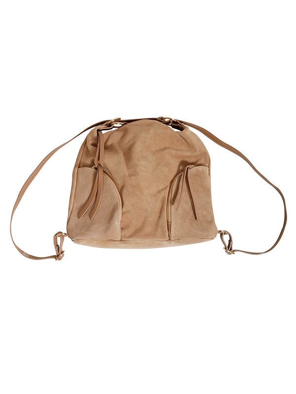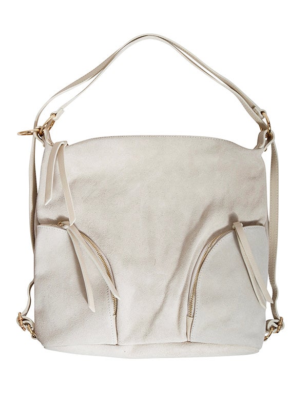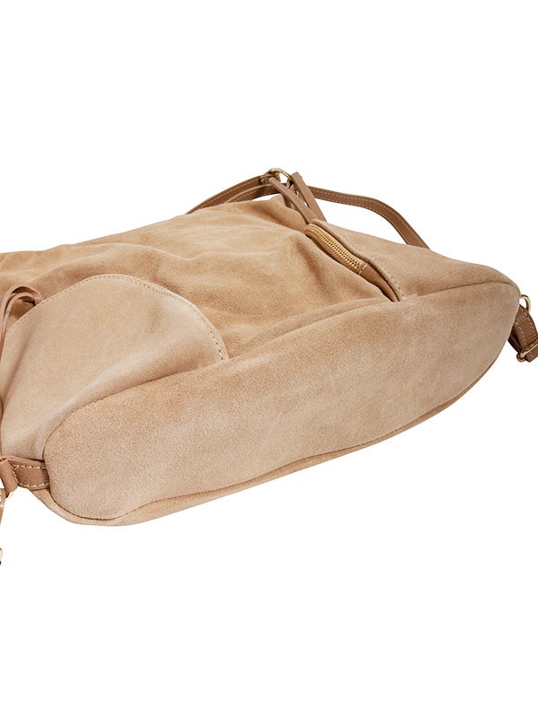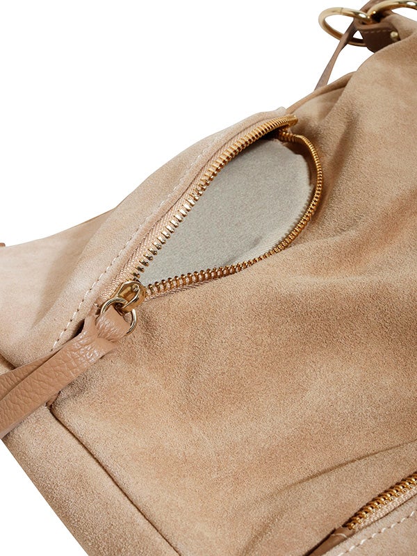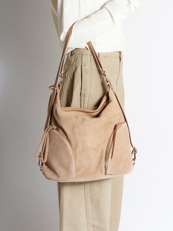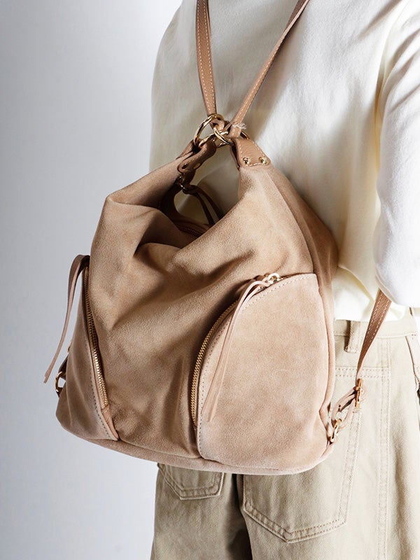 注目素材のスウェードを用いたショルダーバッグ。スウェードとレザーの異なる風合いの組み合わせと、丸みのあるシルエットがコーディネートにアクセントを加えてくれます。ショルダーバッグ、リュックサックとしても使える2wayデザインです。コーディネートに取り入れやすいアイボリーとベージュの2色展開。