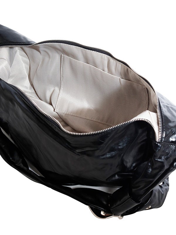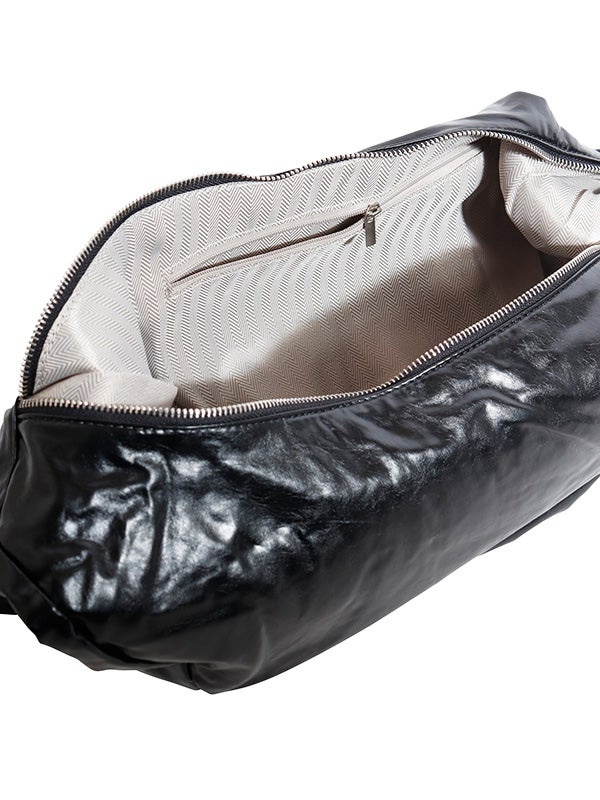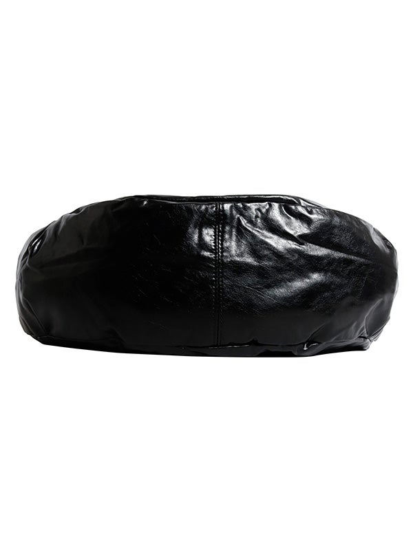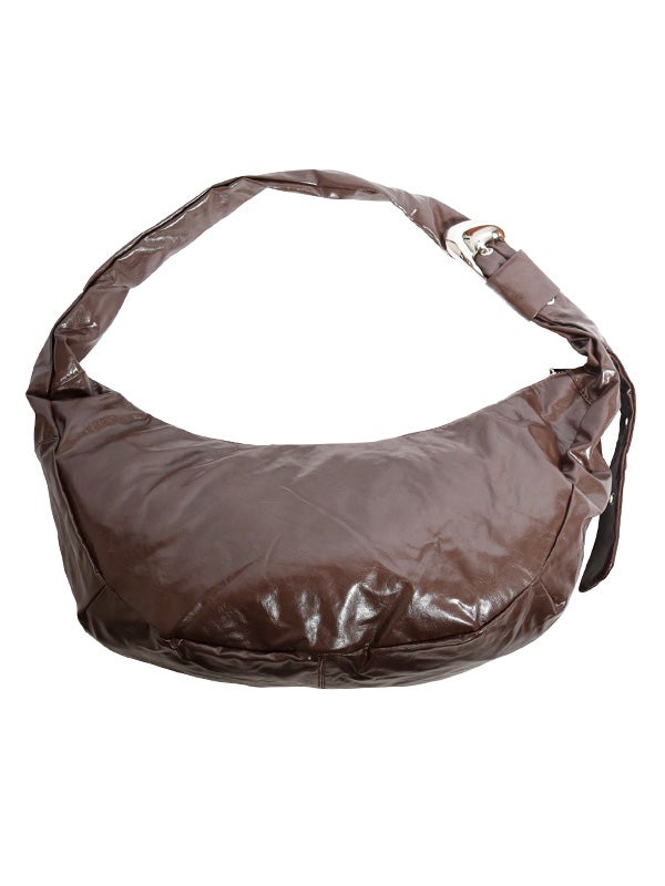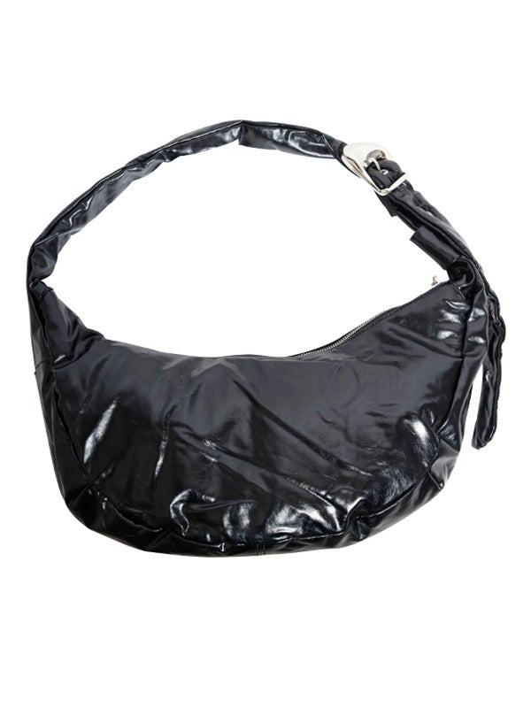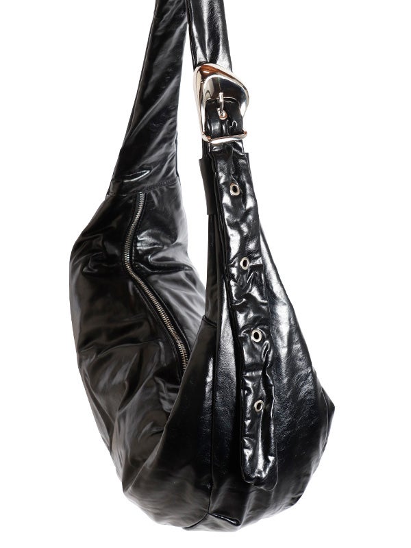 ミニマルなデザインと機能性を兼ね備えた、ボディバッグ。大きめのバックルと光沢感のあるレザー調の質感が目を惹くひと品です。シンプルなムーン型フォルムでスタイルを選ばず使いやすく、長さ調節が可能なショルダーベルトでフィット感を自由に調整できます。ショルダーバッグ、クロスボディの2WAY仕様で、シーンに応じた使い方が可能です。