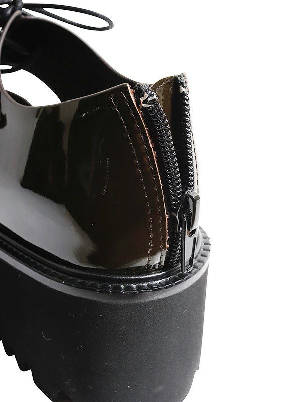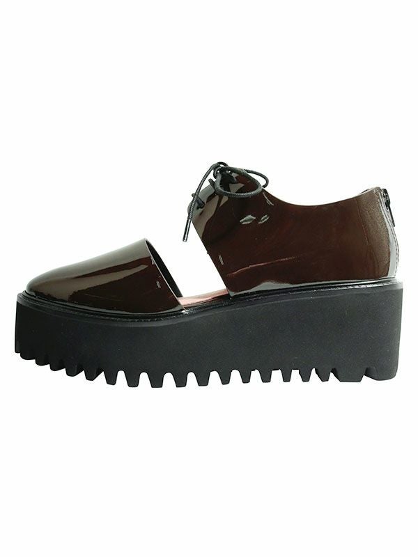 セパレートデザインのアッパーに施したレースアップディテールが印象的な表情を持つエナメルのレザーシューズ。クラシカルな雰囲気もありながら6.5cmの厚底のラバーソールが今の気分を感じさせる仕上がりです。足元に抜け感を出したいシーンや、甘さをプラスしたいモードなスタイリングにも活躍。ソックスとのレイヤードで遊びを加えるのもおすすめです。片手で穿けるバックジップデザインも魅力です。
