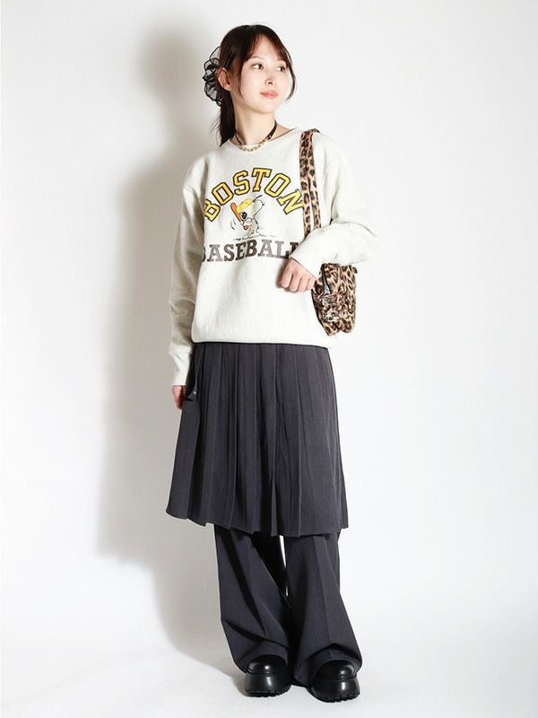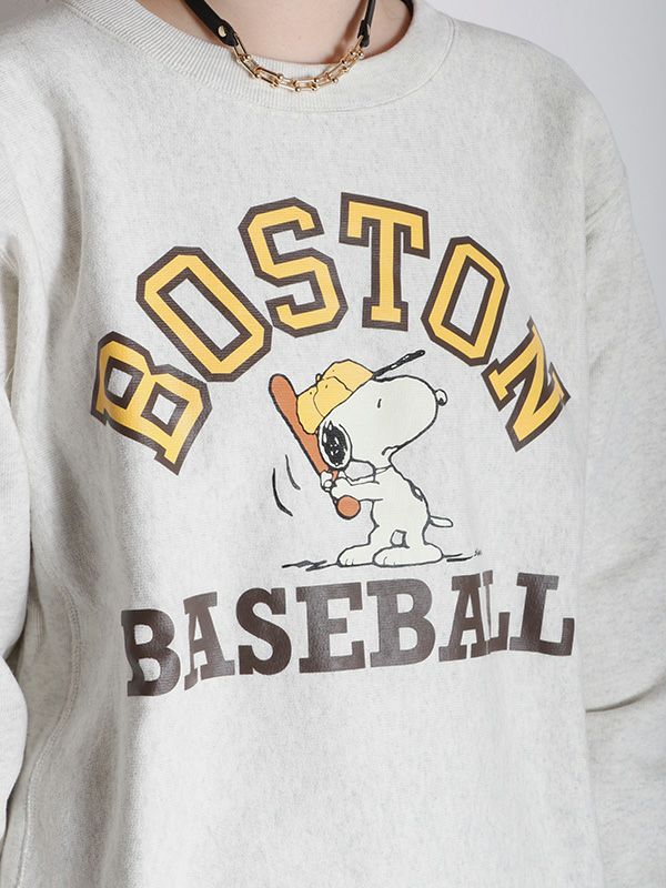 世界中の多くのファンに愛されてる、チャンピオンを代表する製法の「REVERSE WEAVE(R)」を用いたスウェット。洗うほどにタフになり、着こむほどに独特の風合いや味が出る裏起毛素材を使用したクルーネックスウェットシャツです。本来は縦方向に使われる生地を横方向に使用する「REVERSE WEAVE(R)」製法によって縦の生地の縮みを防ぐと同時に、両脇に「EXPANSION GUSSET」を付けることで横の縮みへの影響を少なくし、動きやすさに配慮しています。SNOOPY(スヌーピー)で知られるPEANUTS(ピーナッツ)のチャンピオンオリジナルアイテムで、胸にベースボールをモチーフにしたグラフィックを入れています。