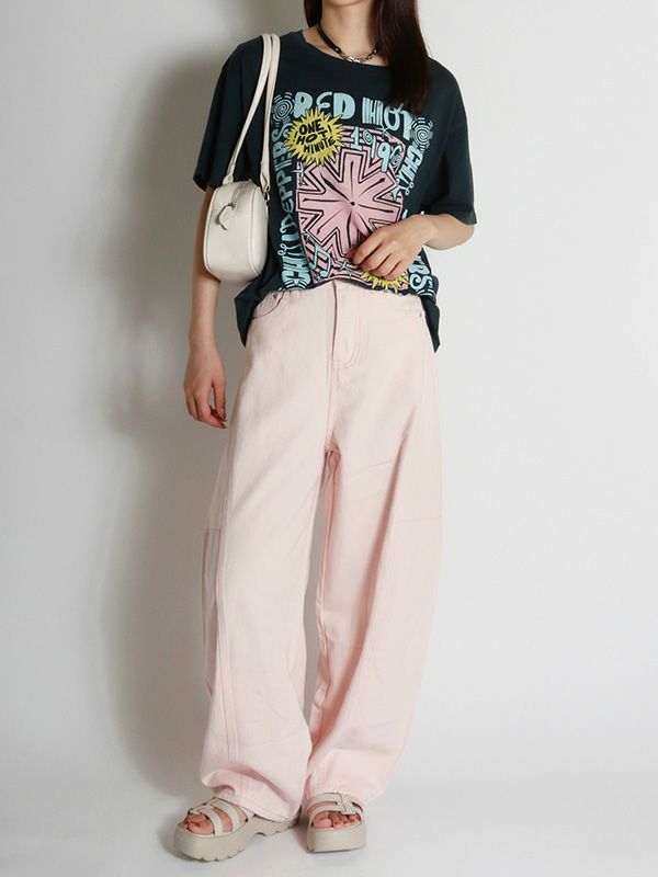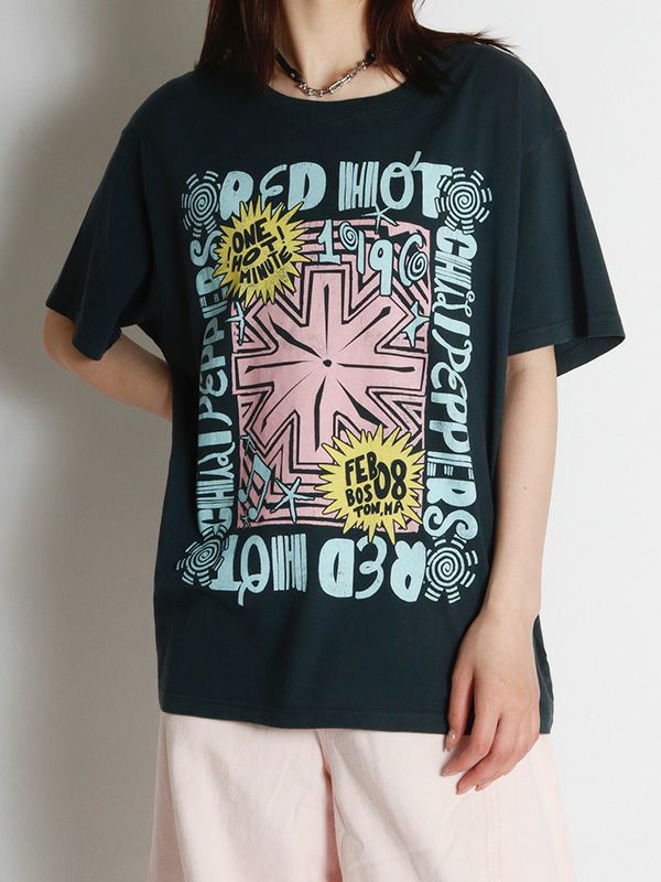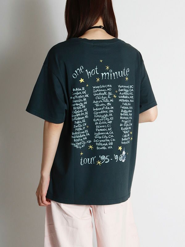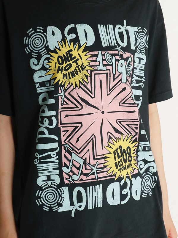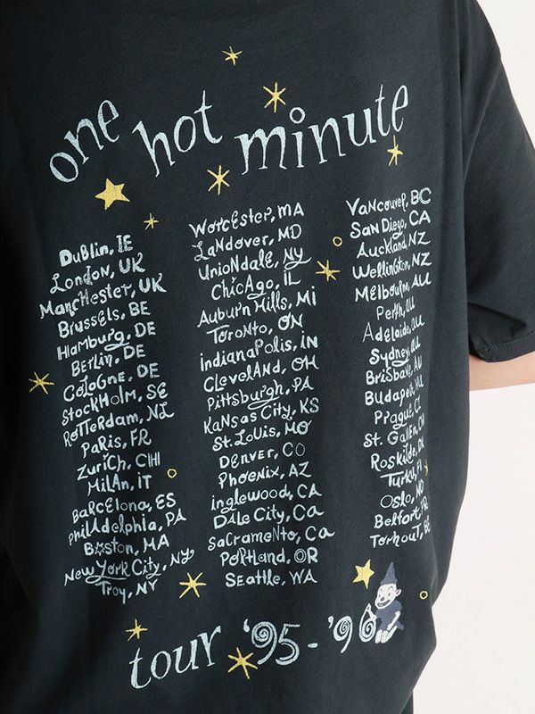 『ワン・ホット・ミニット - One Hot Minute』/レッド・ホット・チリ・ペッパーズの6枚目のアルバムを掲げたワールドツアーをフィーチャーしたグラフィック。バンドのシンボルアイコンをトレンド感のあるパウダーカラーでプリント。DAYDREAMERならではの染色加工、ユーズド感のあるブラックカラー、大胆なプリントを施したバックスタイルもオシャレにキマります。程よく軽い素材でドレープが出る質感と、ルーズな抜け感が出るように柔らかな肌触りで独特の風合いに仕上げたTシャツです。