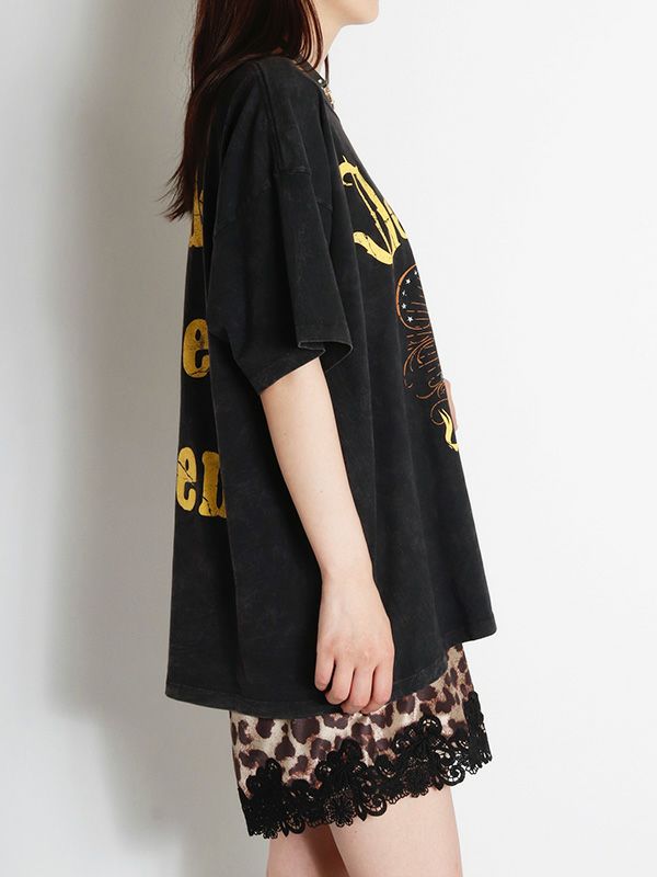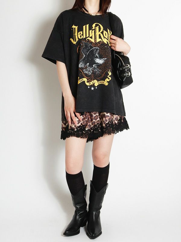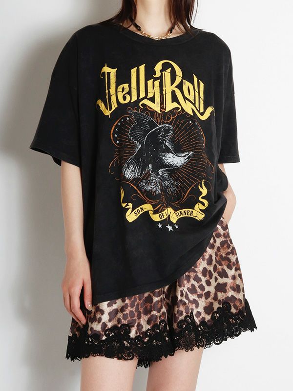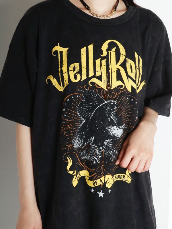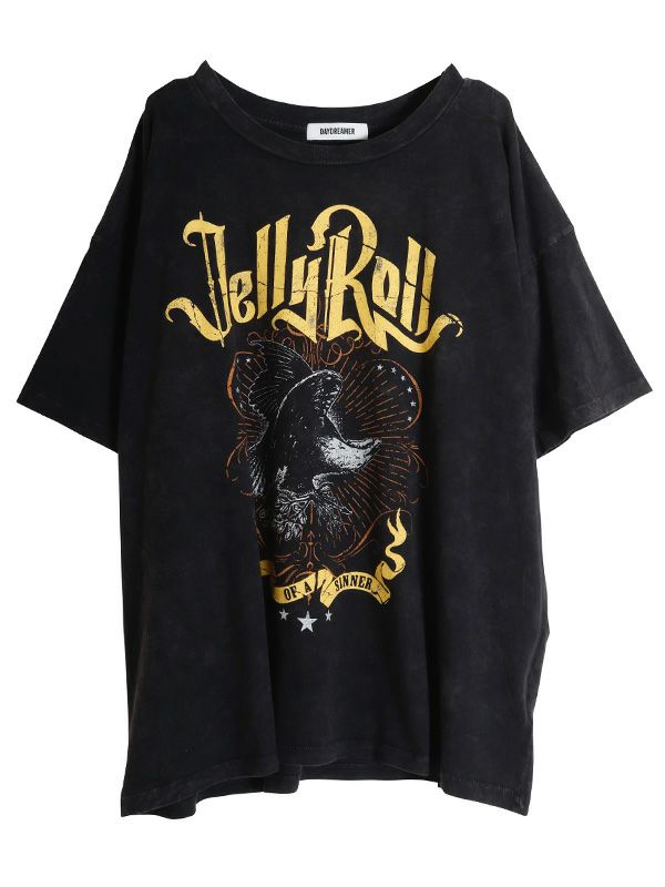 心温まるストーリーテリングで音楽シーンを席巻するカントリーラップ会のセンセーション、Jelly Roll/ジェリー・ロール。彼の代表曲「Song of a Sinner」がイーグルのグラフィックで描かれ、バックプリントには大きくアルバム名をプリント。DAYDREAMERならではの染色加工、ユーズド感のあるブラックカラー、程よく軽い素材でドレープが出る質感と、ルーズな抜け感が出るように柔らかな肌触りで独特の風合いに仕上げたTシャツです。