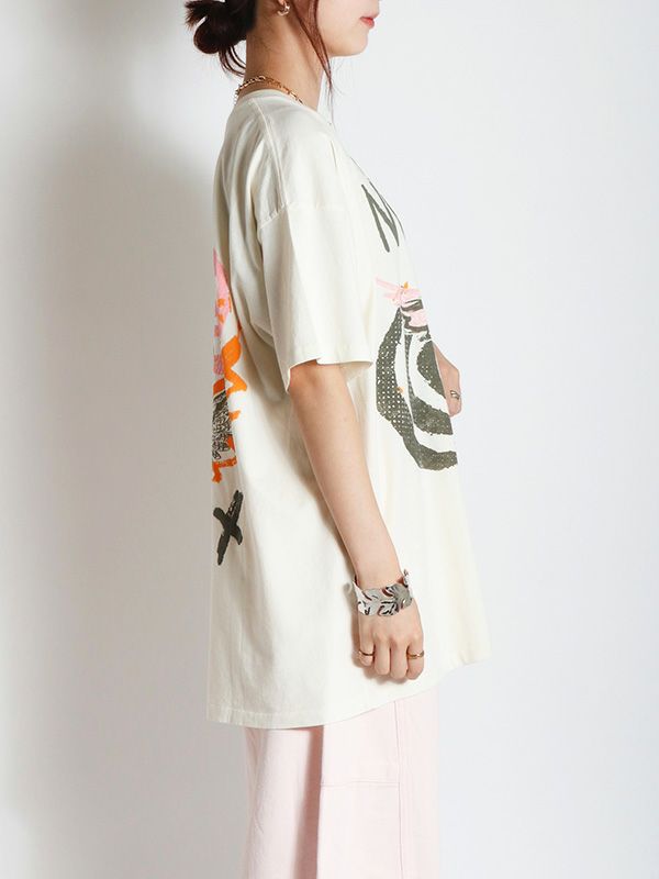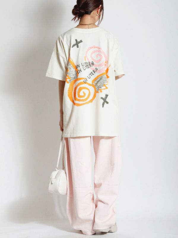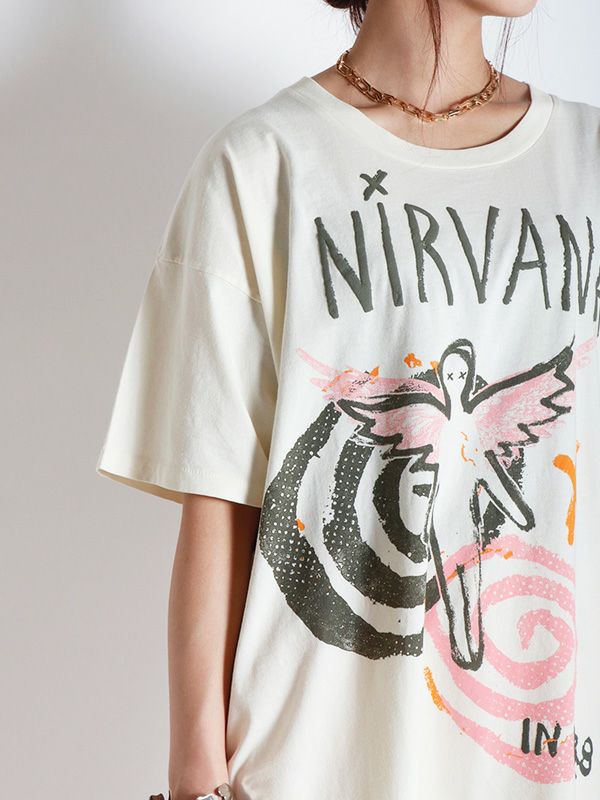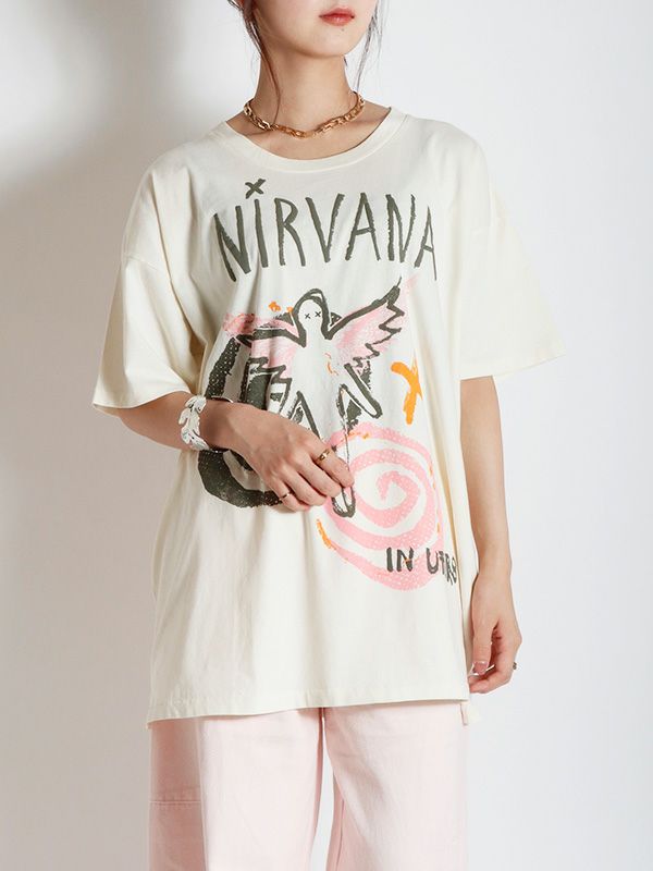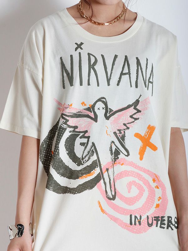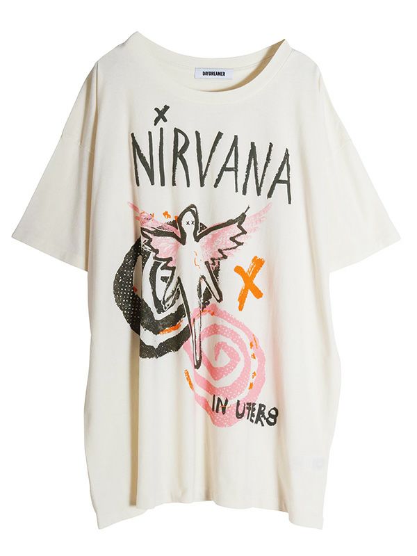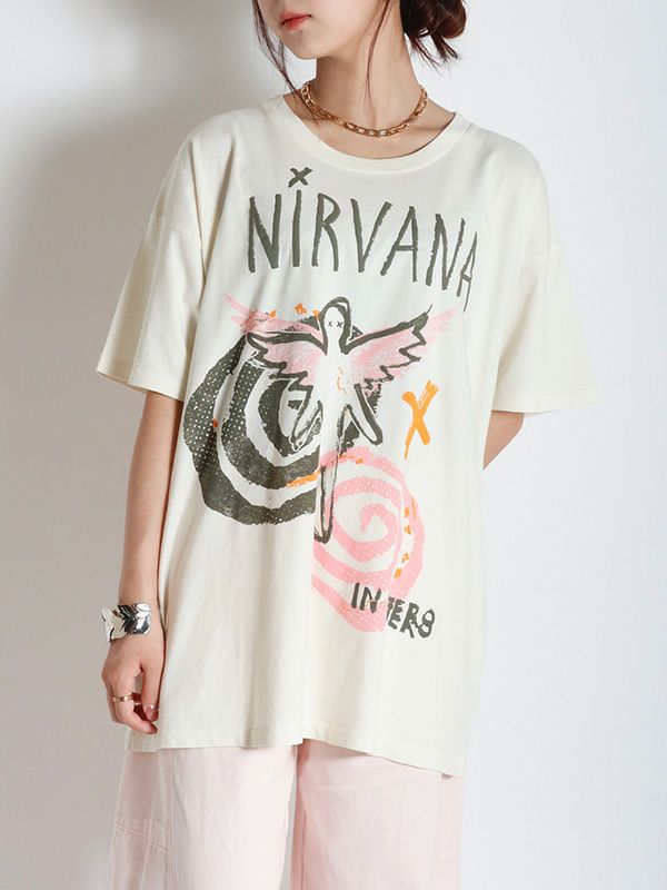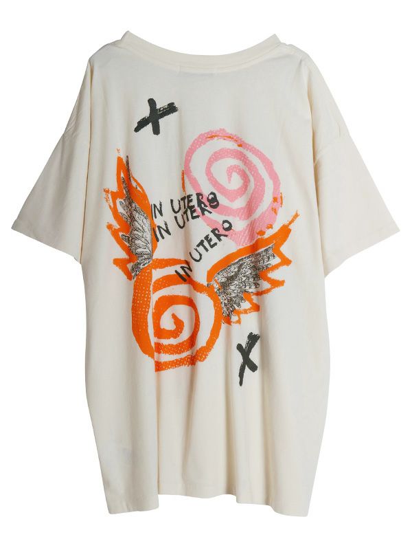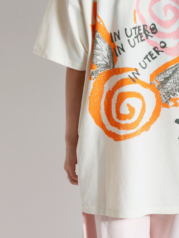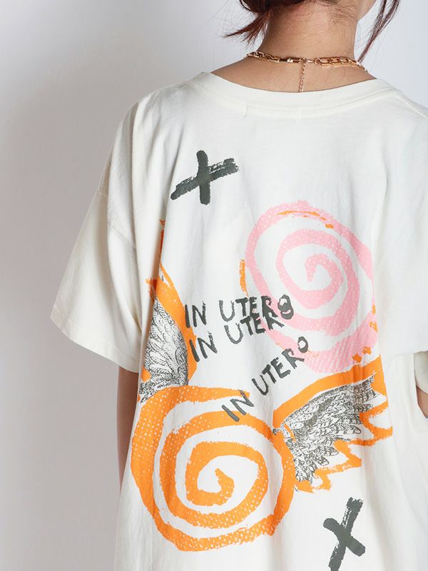 1993年に発売されたNIRVANA/ニルヴァーナのスタジオ・アルバム『IN UTERO/イン・ユーテロ』のジャケットに使われているアート画が、落書きのようにラフに描かれたグラフィックをプリント。ロゴには発砲プリントを施しさり気ないアクセントを添えた仕上がりです。大胆なプリントを施したバックスタイルもオシャレにキマります。スカートでもパンツでも着まわせるアイテム。ルーズな抜け感が出るように、柔らかなコットン100%の肌触りで独特の風合いに仕上げたTシャツです。