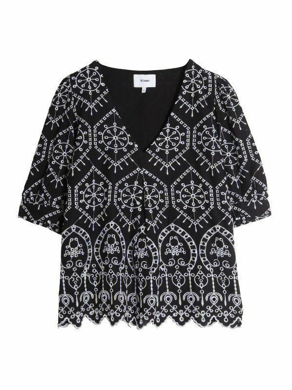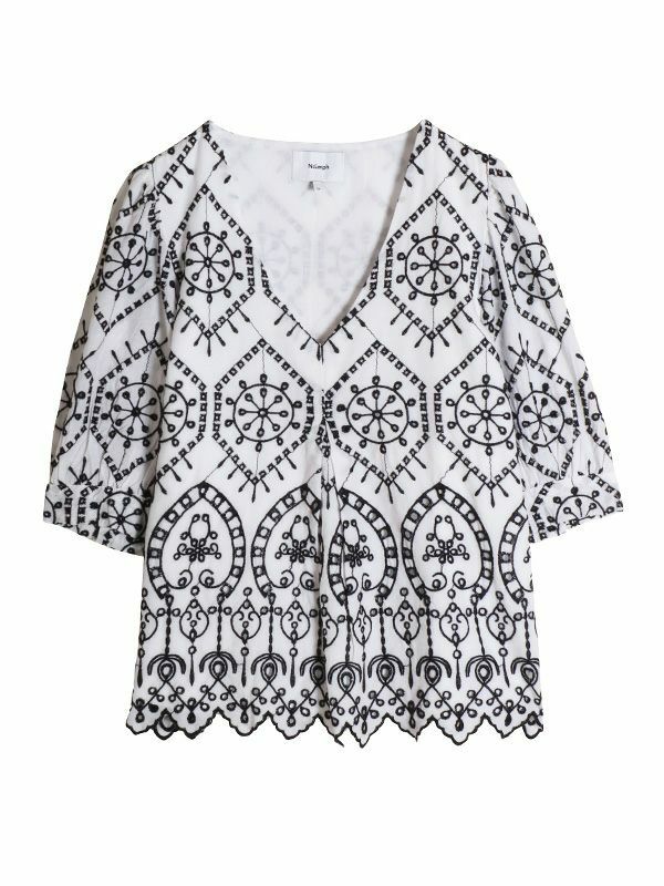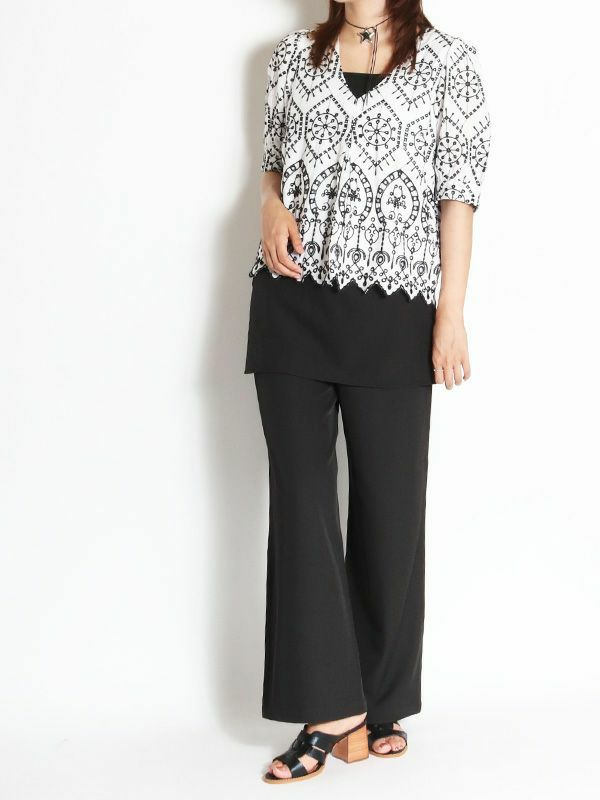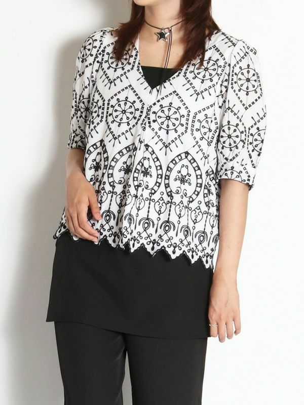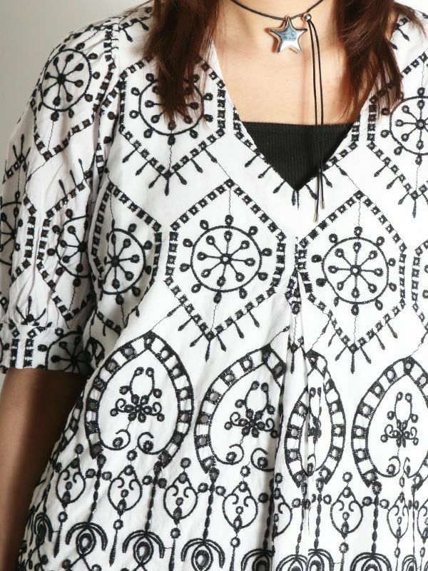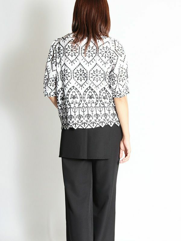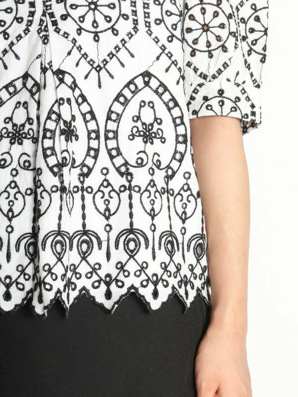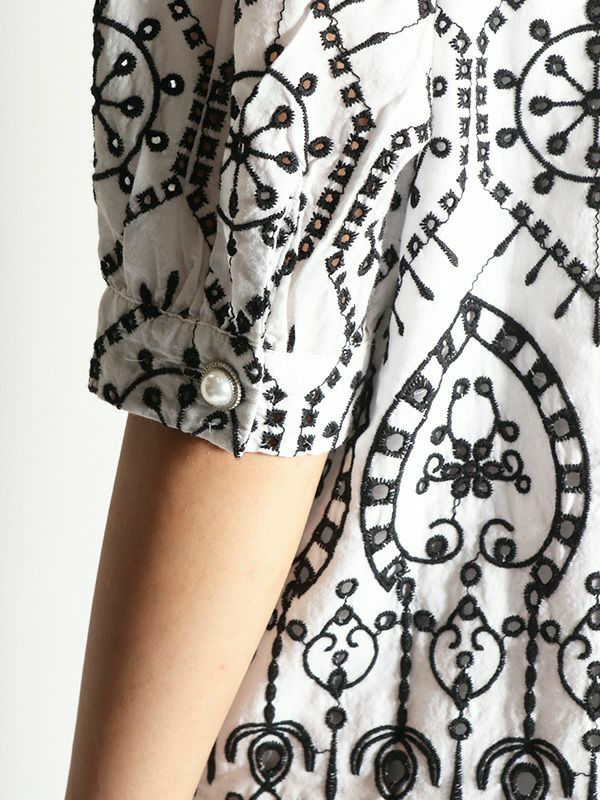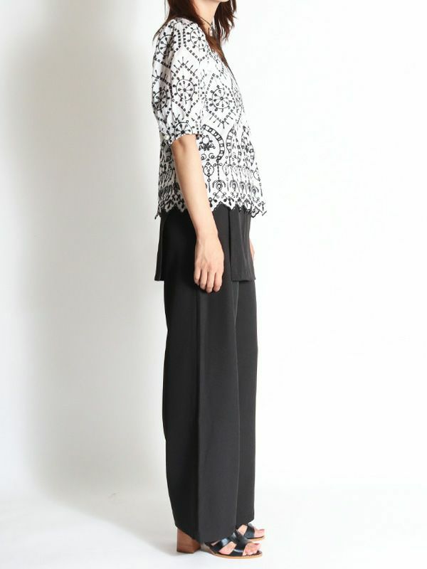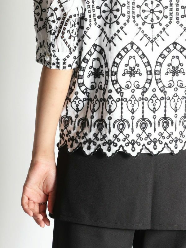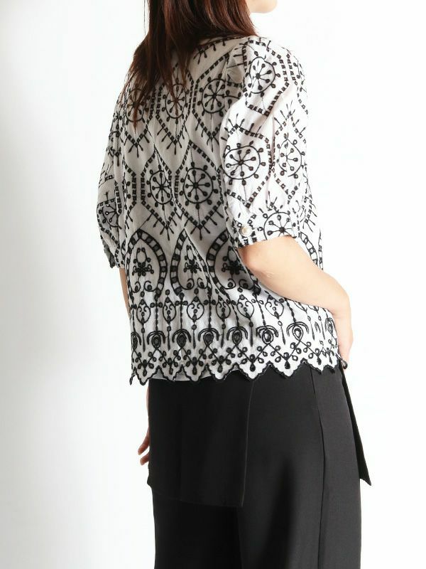 さらっとした涼し気な風合いの綿100%素材に、配色で大胆刺繍が施された5分袖ブラウス。品の良さと華やかな雰囲気を味わえる主役級の1枚です。ほんのり丸みを持たせたパフスリーブに施されたパールボタンもポイント。甘さのあるブラウスなのでパンツやタイトなスカートで合わせた大人可愛い印象がおすすめ。バランスの良い着丈でボトムスを選びません。シンプルなボトムスとの合わせでも存在感は抜群です。同素材のパンツと合わせたセットでの着こなしもおすすめです。