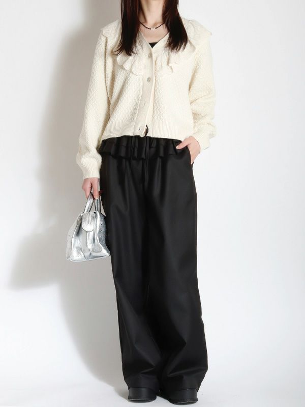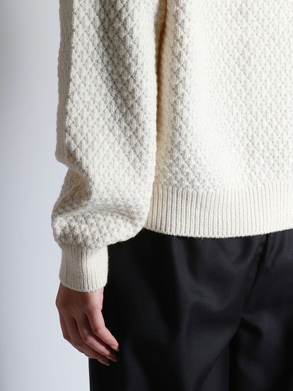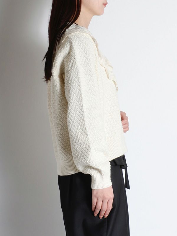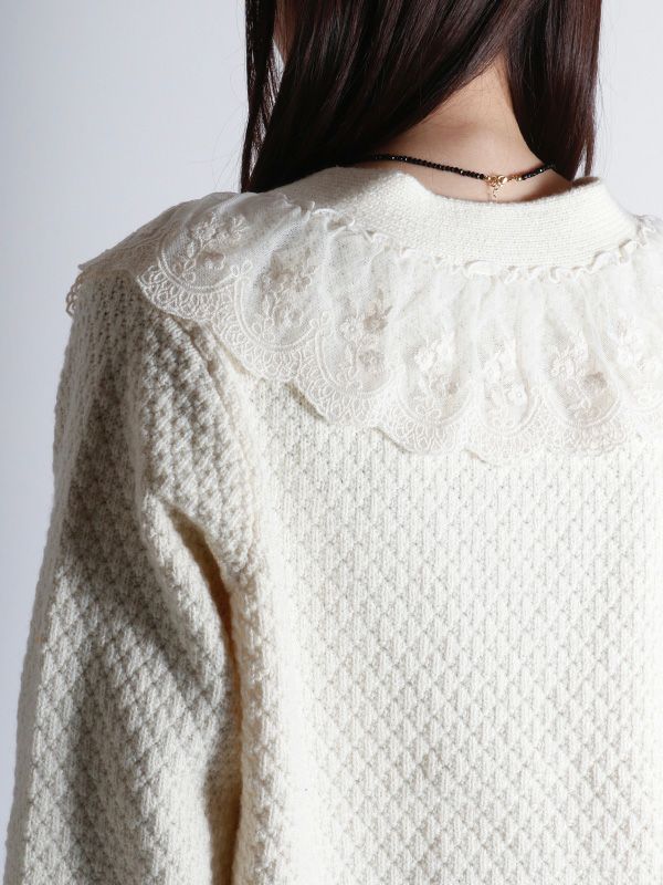 凹凸のある立体的なニット地の襟もとに大胆なレースカラーを施したニットカーディガン。フェミニンな印象ながらどこかヴィンテージ感も併せ持ったデザインです。襟付きのデザインが程よくクラシックで、ボタンを閉じてプルオーバーニットトップスとしても活躍します。デニムやカーゴでカジュアルに仕上げたり、スカートやワイドパンツと合わせて、甘さのある大人可愛いスタイルに纏めたコーディネートもおススメです。