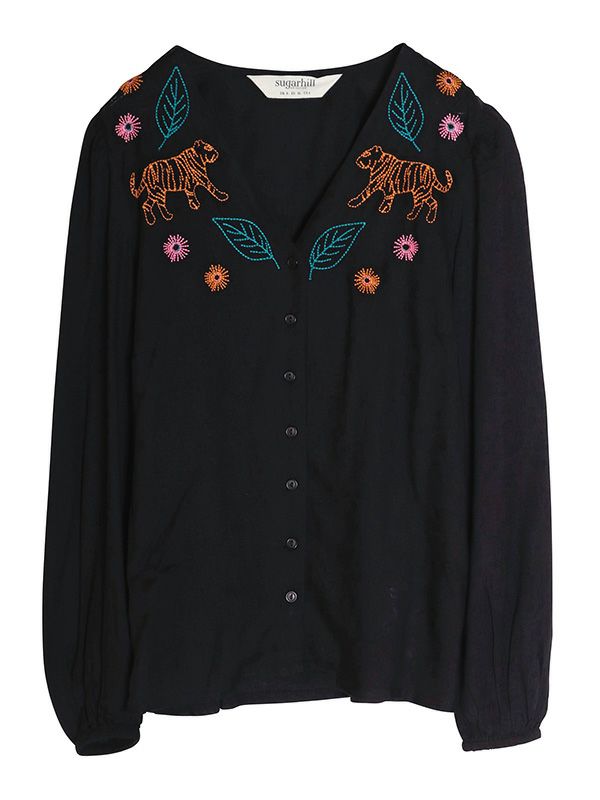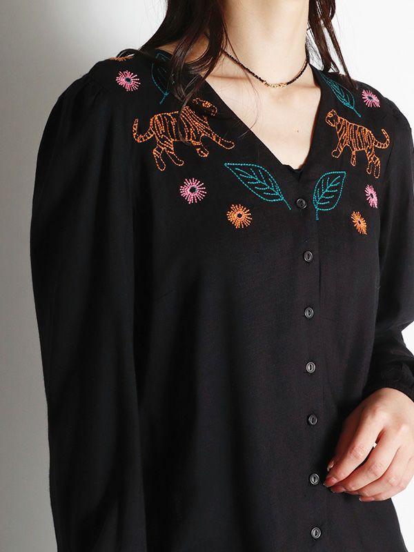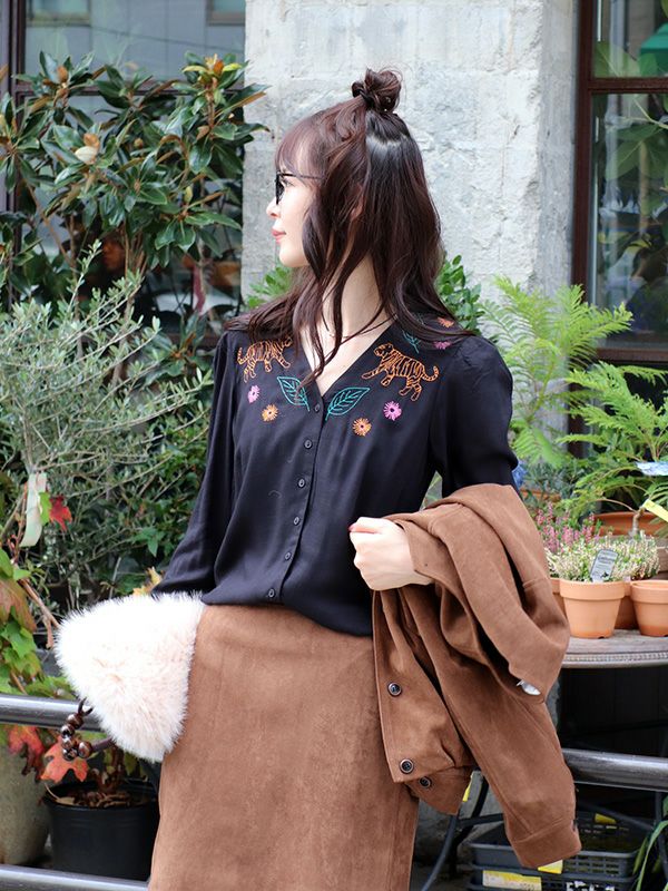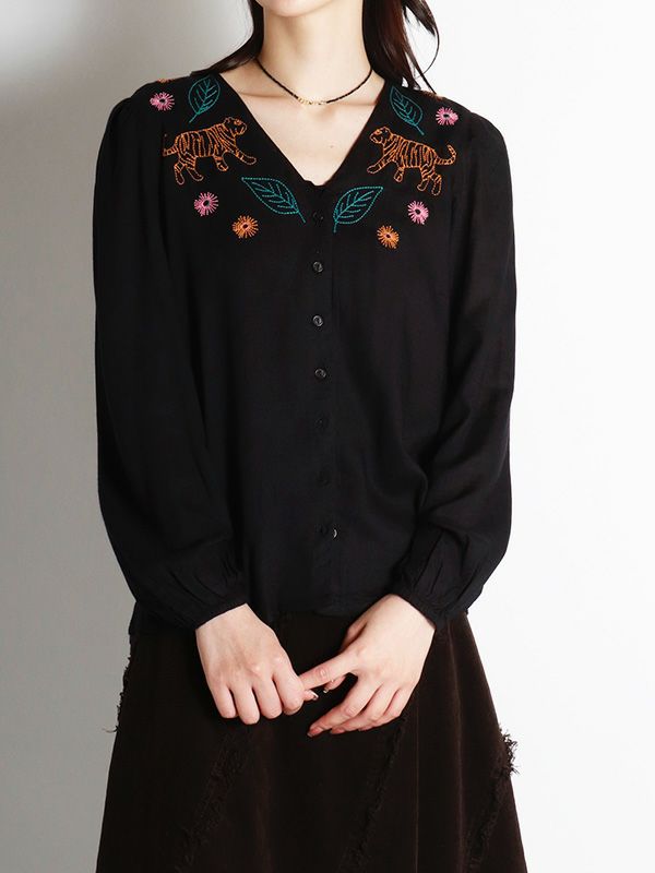 〈SUGARHILL(シュガーヒル)〉らしい刺繍が目を引くブラウス。ボタニカルとアニマル柄の刺繍が、胸元を華やかに彩ります。女性らしいVネックラインとゆるやかなパフスリーブが優雅なロマンティックムードを演出。バックにもタックを施しどこから見ても大人可愛いデザインです。インでもアウトでもバランスの良い着丈なのでデニムと合わせてデイリーに、スカートと合わせて上品にと、幅広い着こなしが楽しめます。