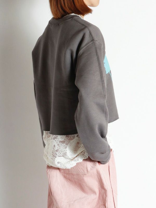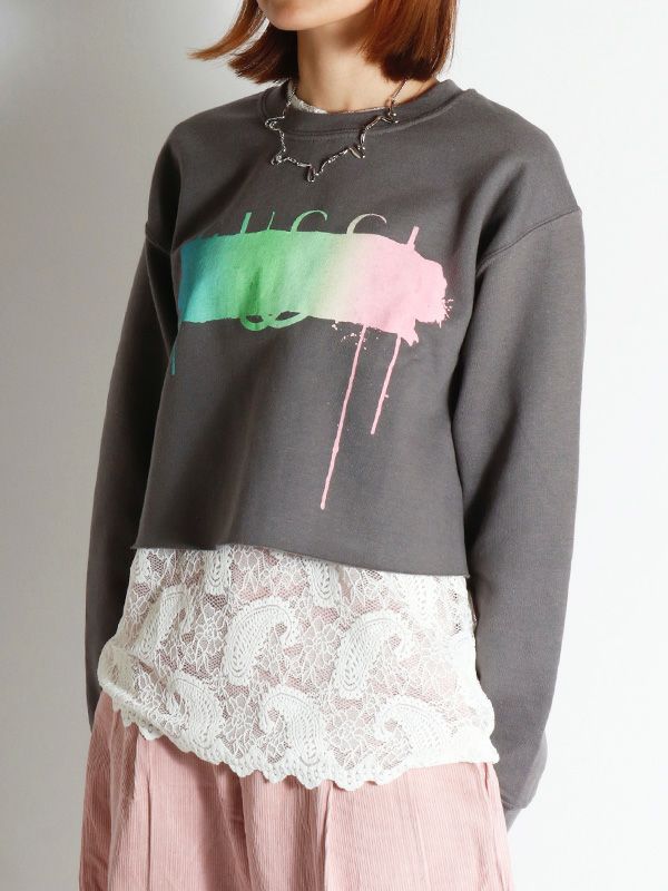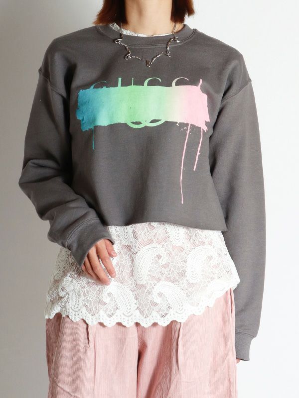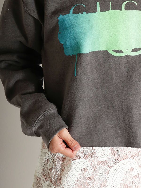 BLACK SCORE(ブラックスコア)から届いた新作のクロップドスウェット。グラフィックは人気の《GUCCI/CROSS》をプリント。ニュアンス感のあるグラデーションカラーが雰囲気のある仕上がりです。ボディはトレンド感のあるクロップド丈。着るだけでトレンド感を演出できますが、丈の短さが気になる方は、中にインナー、シャツなどをあわせるのがオススメ。大人カジュアルにも取り入れやすく、着心地も◎。インパクトがありながら女性らしさもあるので、ボトムはベーシックなアイテムで合わせるだけでサマになります。