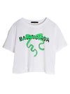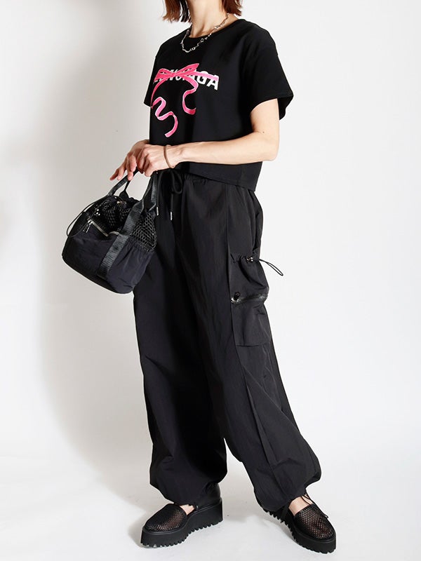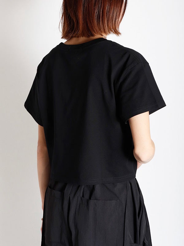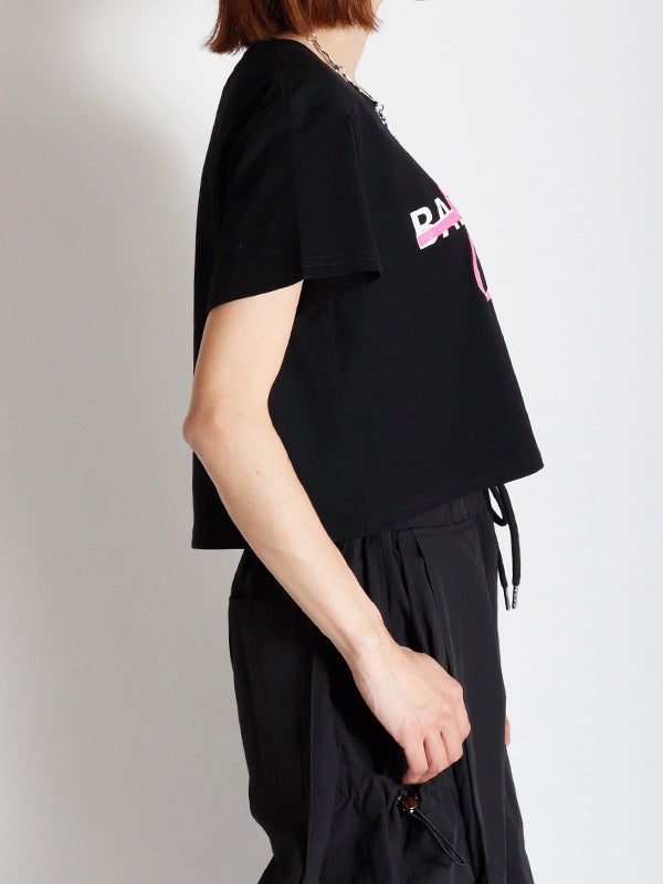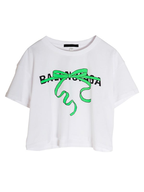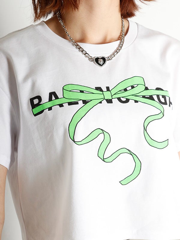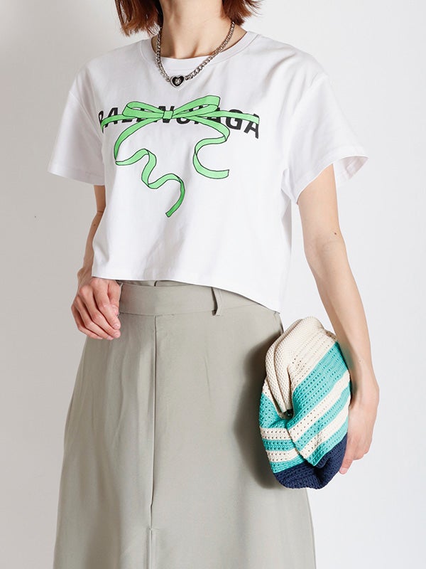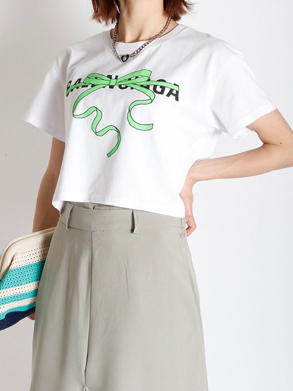 今回の新しいグラフィックは、あの有名ラグジュアリーブランドのネームにギフトラッピングのリボンをブランドカラーらしいネオンカラーでアクセントを施したデザイン。サラッとした柔らかく1枚でも着やすいコットン天竺を使用。トレンド感のあるクロップド丈で着丈が短く、身幅はゆったりシルエットなのでボトムスを選ばず幅広いコーディネートを楽しんでいただけます。