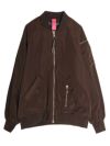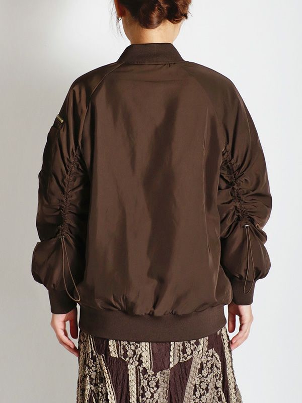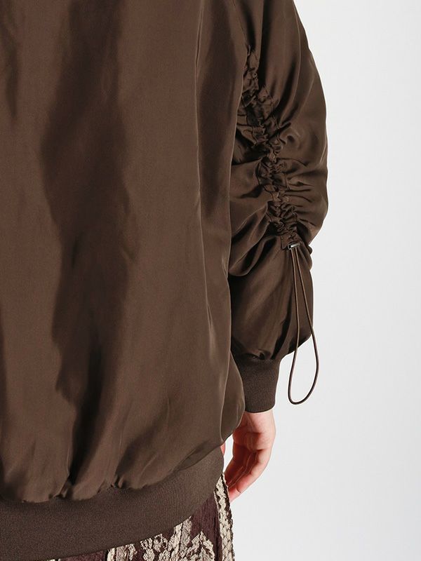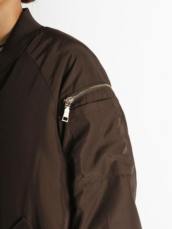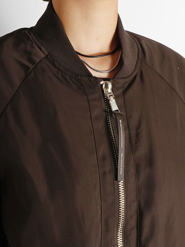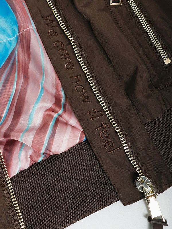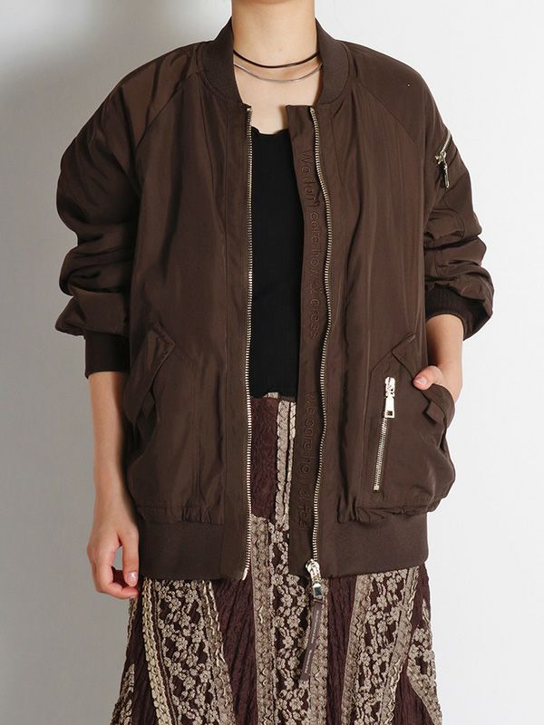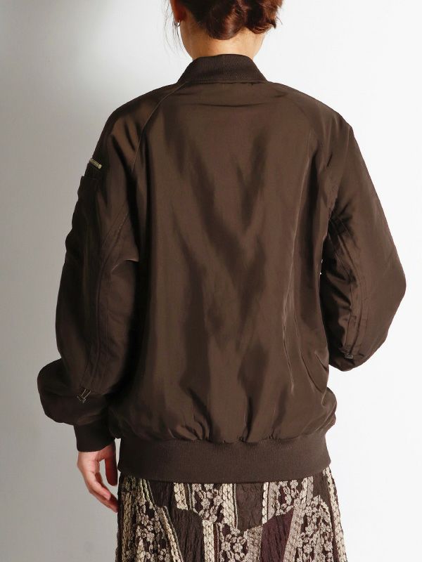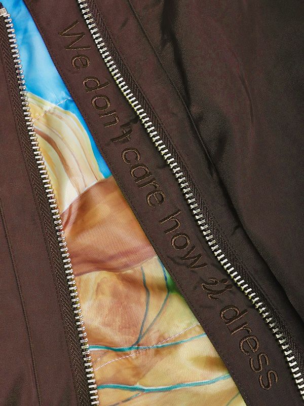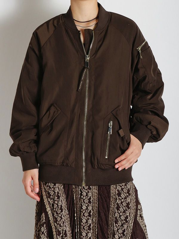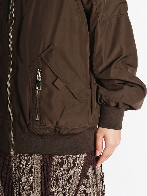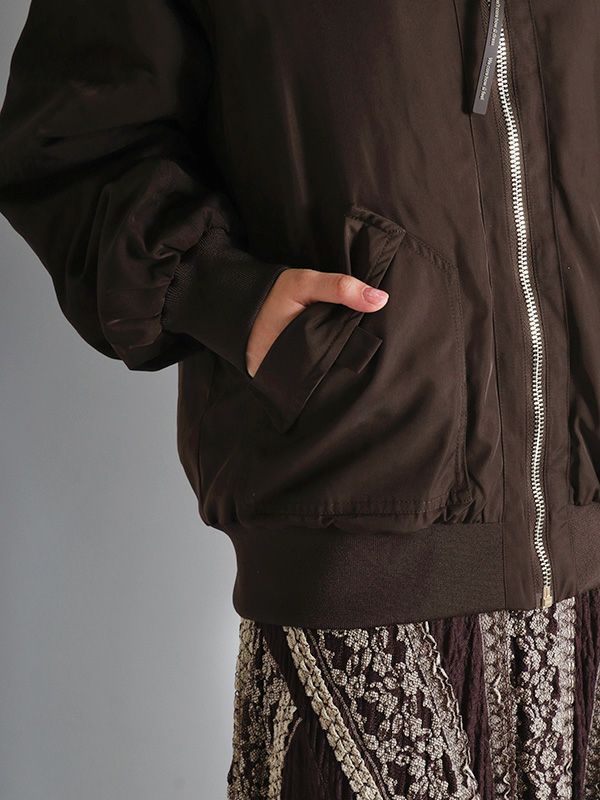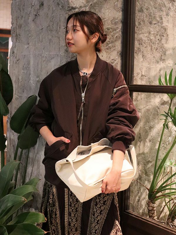 MA-1の作りを参考にしながらも、これまでのNUMPHのアーカイブをもとに仕様やディテールを仕上げた中綿ブルゾン。構築的なポケットや丸みを持たせた肩から袖にかけてのライン、ジップデザインなど個性あふれる存在感を放つ1着です。ボリュームのあるブルゾンなので、タイトスカートや細身のパンツと合わせてメリハリのあるモードなスタイルに。ワイドパンツやロングスカートと合わせれば、全体的にリラックス感のあるカジュアルスタイルを楽しめます。チラリと見せたくなるオリジナルプリントの裏地もさりげないポイントです。