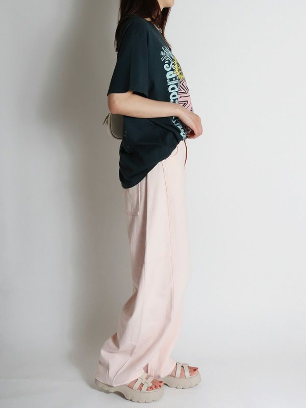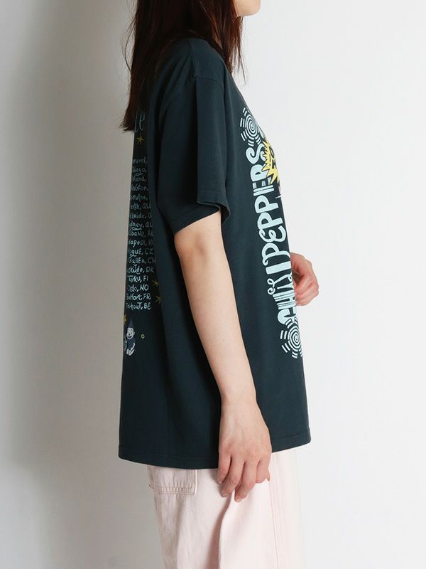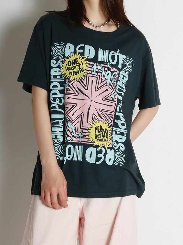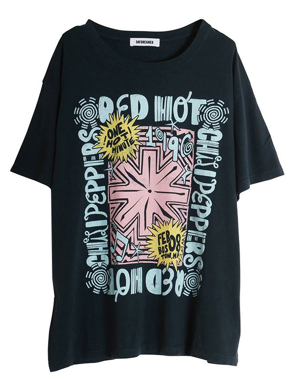 『ワン・ホット・ミニット - One Hot Minute』/レッド・ホット・チリ・ペッパーズの6枚目のアルバムを掲げたワールドツアーをフィーチャーしたグラフィック。バンドのシンボルアイコンをトレンド感のあるパウダーカラーでプリント。DAYDREAMERならではの染色加工、ユーズド感のあるブラックカラー、大胆なプリントを施したバックスタイルもオシャレにキマります。程よく軽い素材でドレープが出る質感と、ルーズな抜け感が出るように柔らかな肌触りで独特の風合いに仕上げたTシャツです。