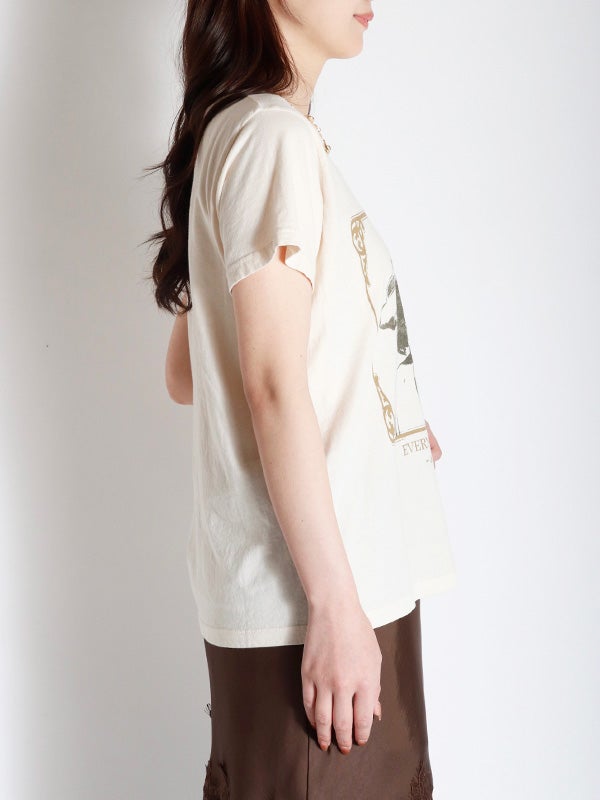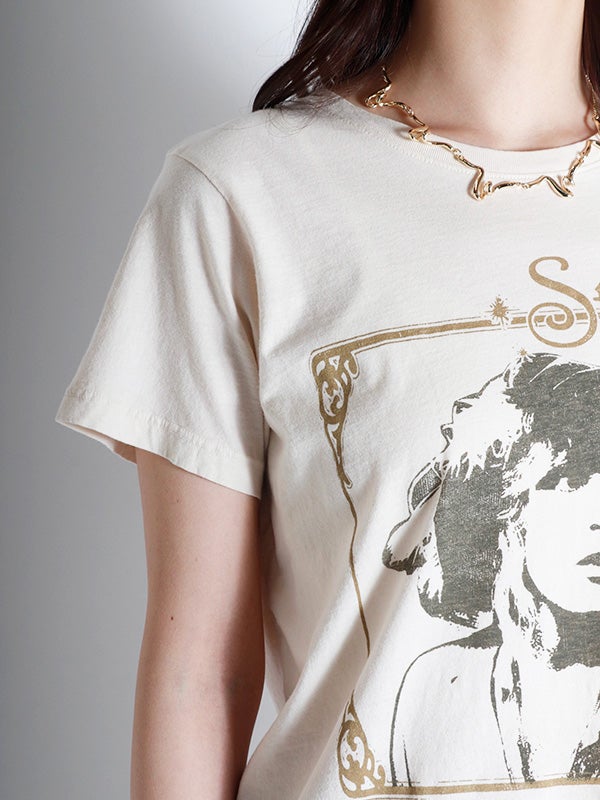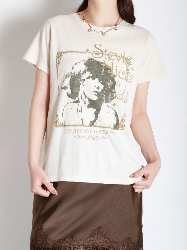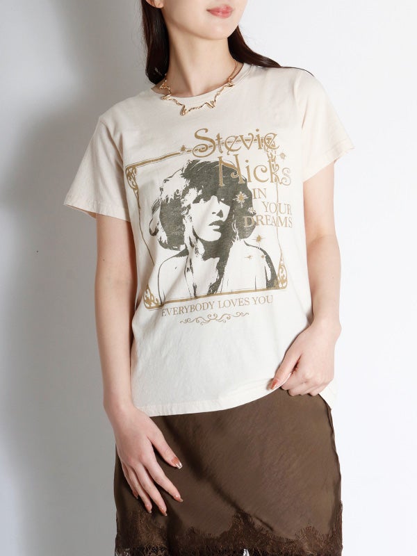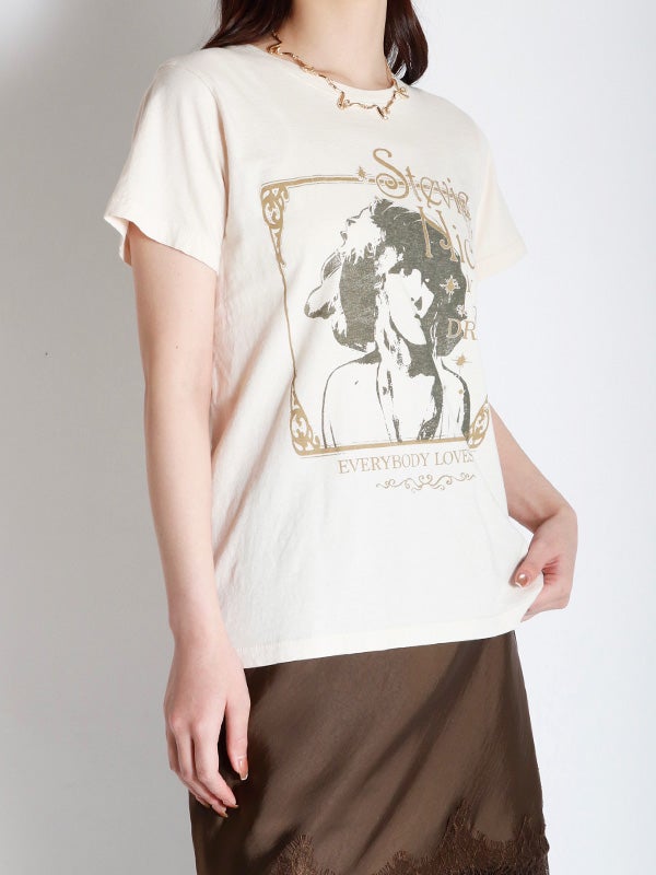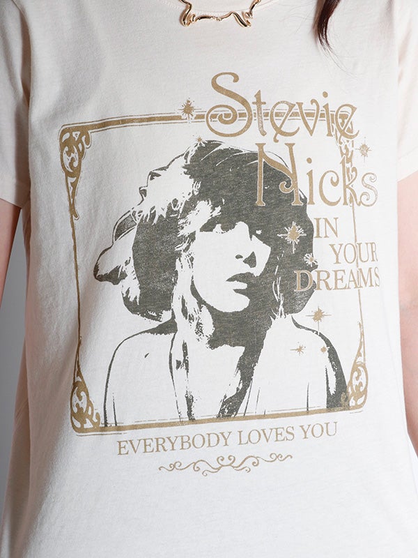 瞬く間に成功を収めたソロスター、スティーヴィー・ニックスのヒットアルバム『IN YOUR DREAMS/イン・ユア・ドリームス』と収録曲「エヴリバディ・ラヴズ・ユー」を、愛されるヒロインの象徴的なポートレートと共に額装。メタリックインクでアクセントを添えています。通気性に優れた軽量コットンを使用した、クラシックなフィット感。どんな体型にも似合う、普遍的なシルエットが特徴のTシャツです。