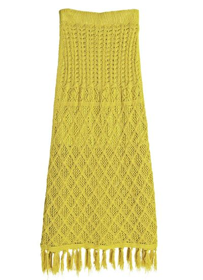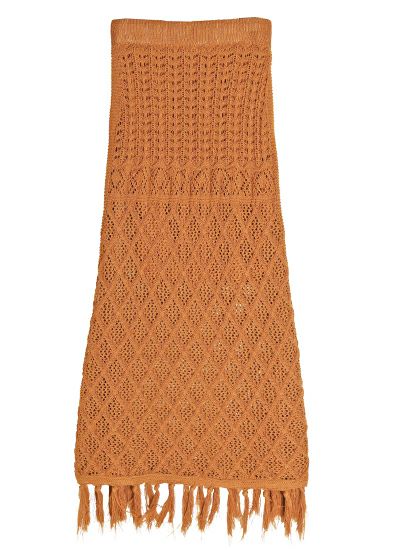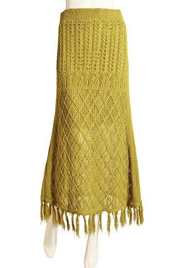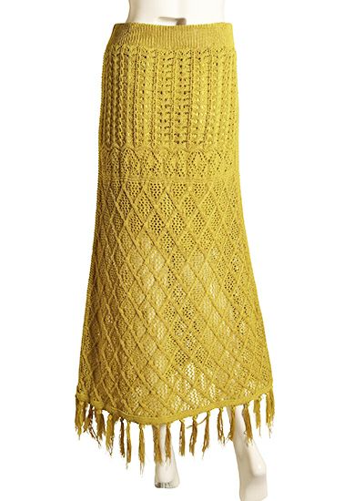 フリンジデザインのロングニットスカート。裾に広がるフレアシルエット。いつものトップスに合わせてオシャレ度を上げてくれるニットスカートです。 これからの季節にもぴったりなカラーリング展開です☆