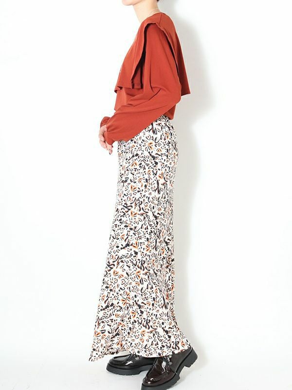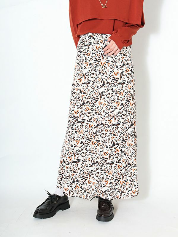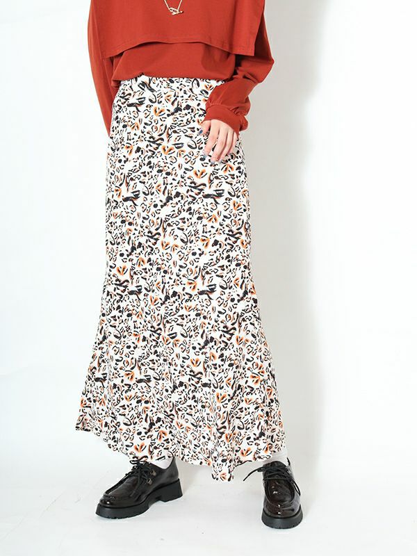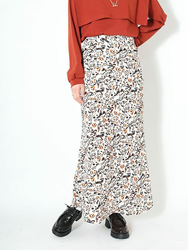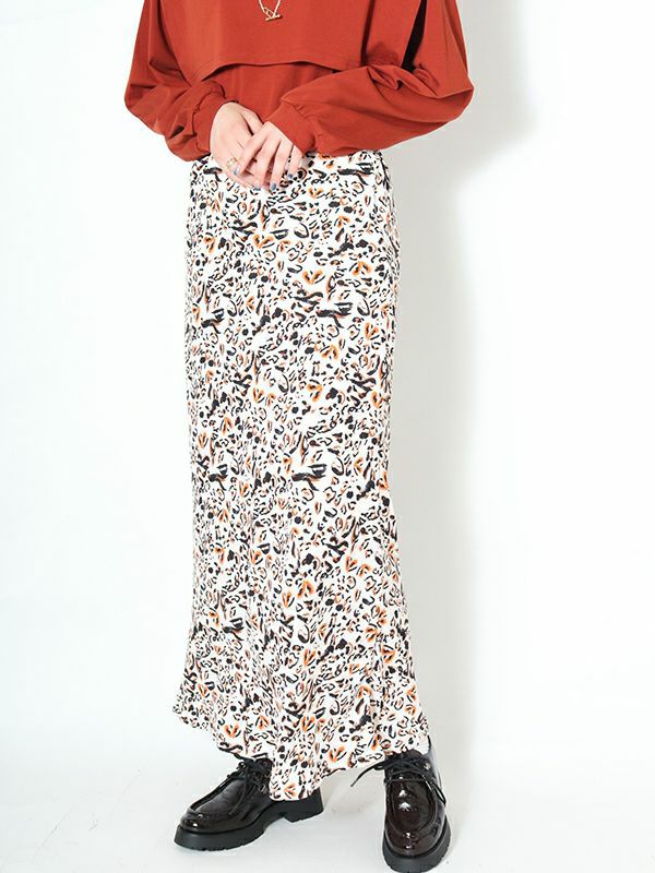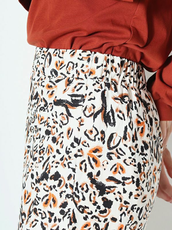 多彩なレオパード柄がインパクトがあり、コーデのポイントになるロングスカート。裾にかけて広がるナローシルエットで、後ろウエストがゴムになって履き心地も良いです。トップスにはシンプルなカットソーやニットなどの合わせがおすすめです。裏地もついているので、安心して履いていただけます。