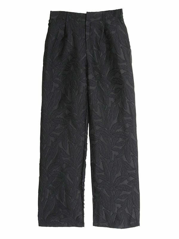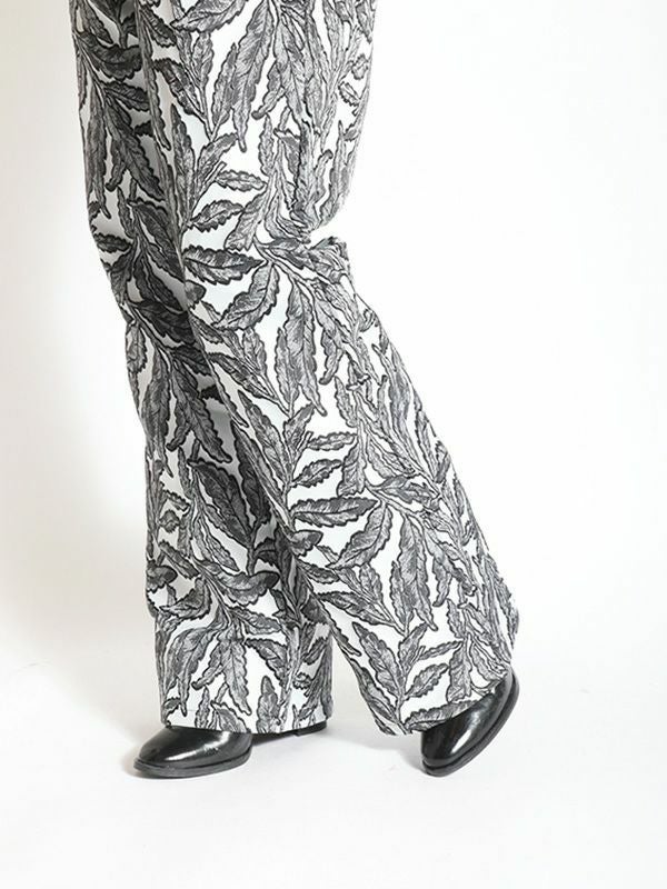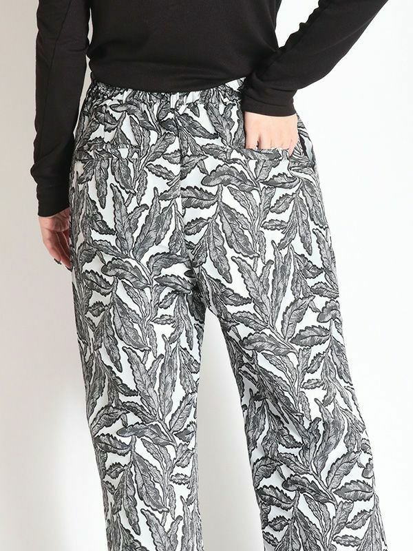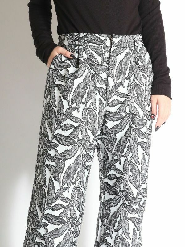 フラワーモチーフのジャカード織素材が特別感のある仕上がりになっているパンツ。トレンド感あるセミフレアデザインになっています。後ウエストには平ゴムを通しているのでリラクシーな着心地で着用出来ます。華やかなシーンにはブラウス合わせでドレスアップして、カジュアルなシーンにはスウェットやカットソー、Tシャツ合わせでおしゃれアイテムとして、様々なシーンで活躍できる主役級のアイテムです。同素材のロングトップと合わせたセットでの着こなしもおススメです。
