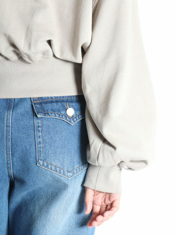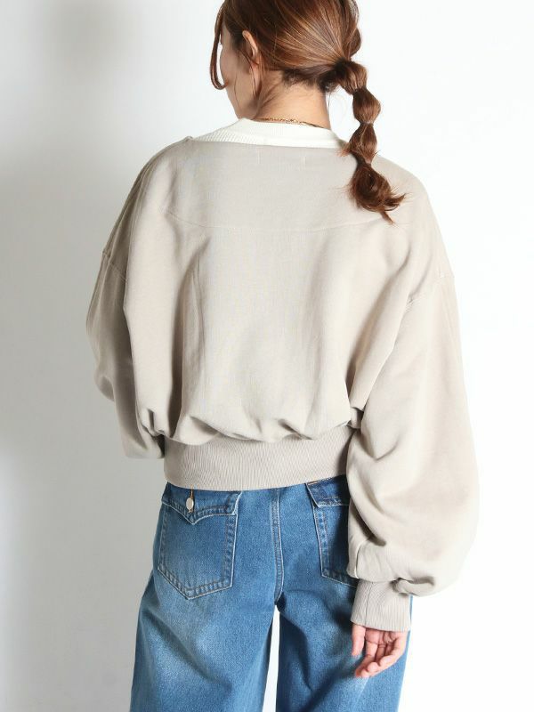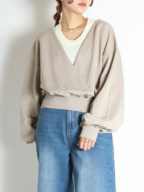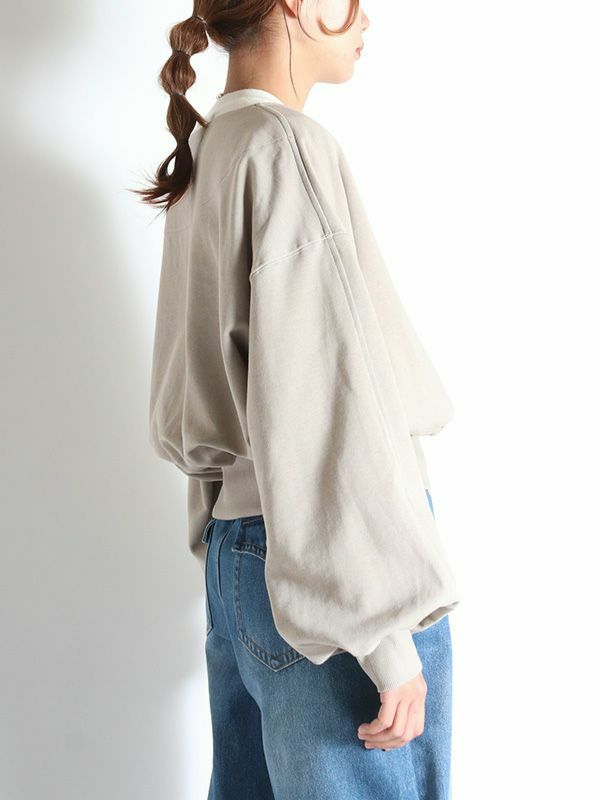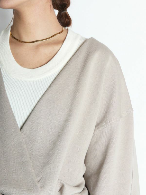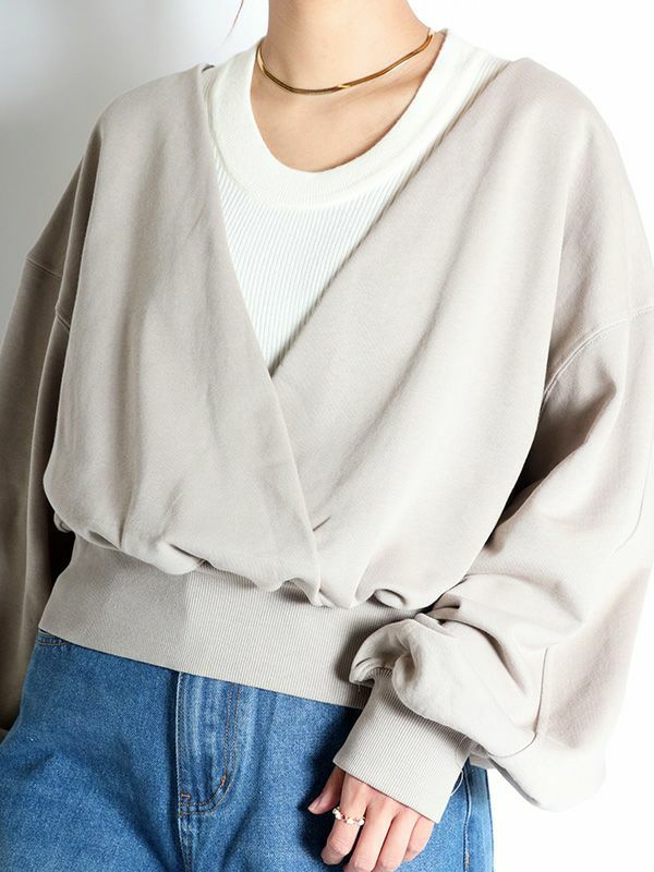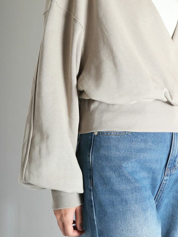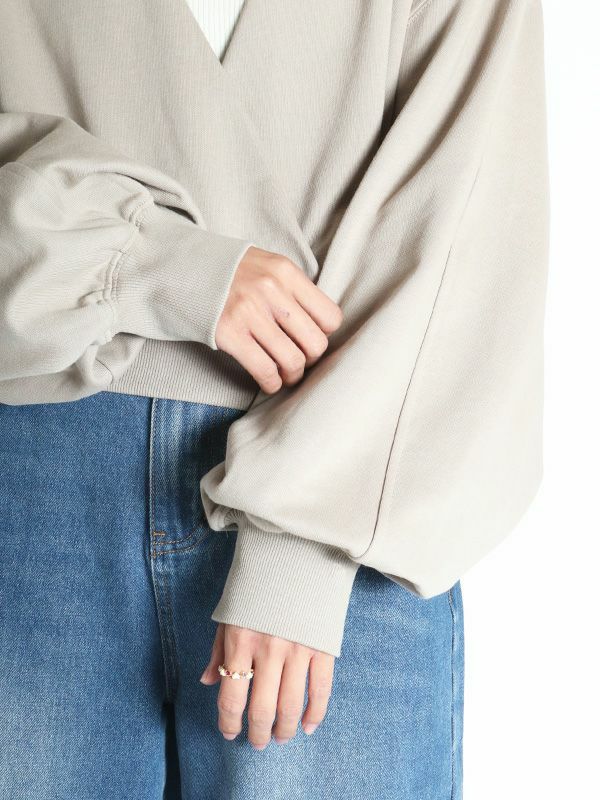裏毛素材のカシュクールデザインスウェット。カジュアルに傾きがちなスウェットですが女性らしい印象で着ていただけます。ボリュームスリーブが、さらにトレンド感のあるデザイン性をプラス。しなやかな風合いのテキスタイル。くたっと柔らかな風合いが着心地の良さをもたらします。パンツとのコーディネートはもちろん、きれいめなスカートと合わせた女性らしいスタイリングもおすすめです。