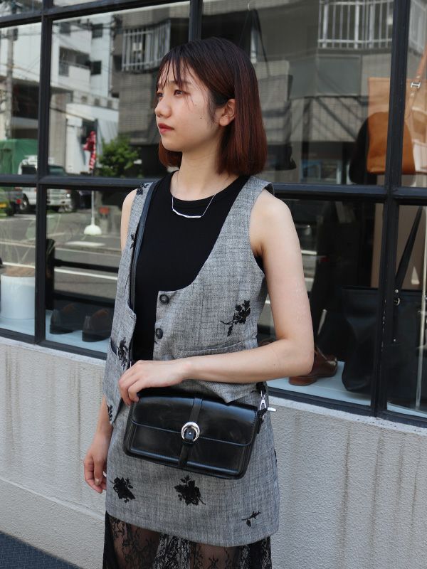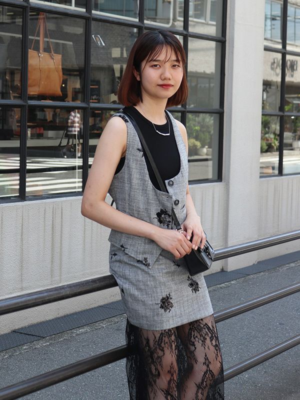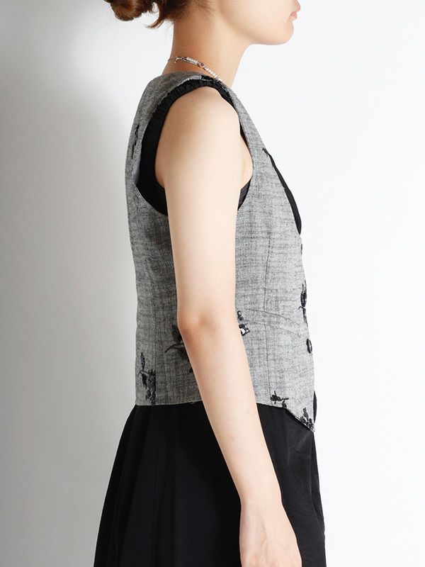ホルタ―ネックのようなネックラインとUネックに開いたデコルテが女性らしさを引き出すベスト。細やかな刺繍が絶妙なアクセントになっており、コンパクトなサイズ感でありながら上品なデザインが魅力です。シンプルなトップスやシャツの上に重ねたり、カジュアルからエレガントまで幅広く着こなせます。同素材のスカートとセットアップでの着用も可能で統一感のあるスタイリングをお楽しみいただけます。