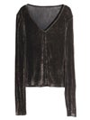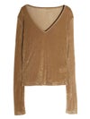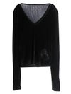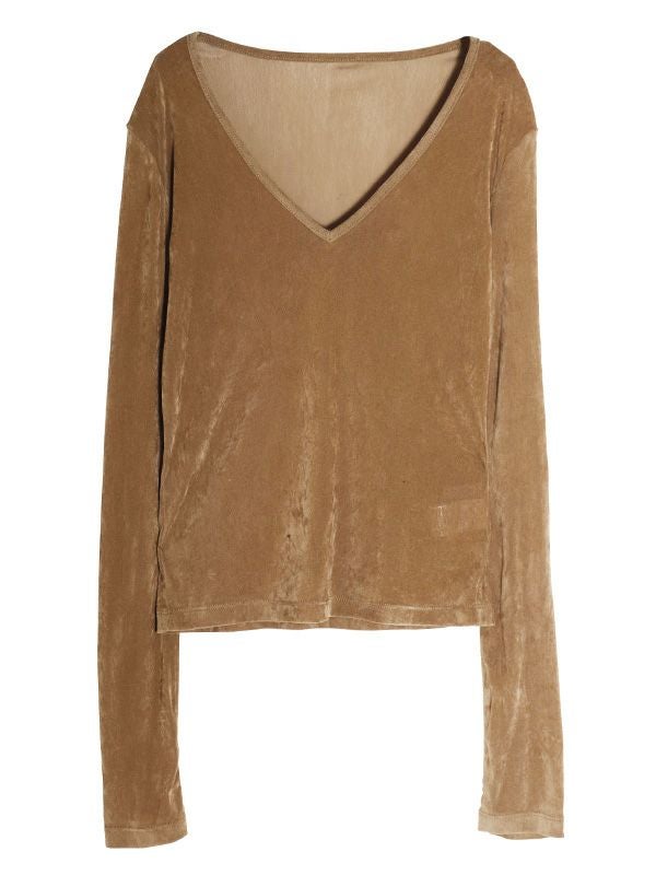 微光沢のあるベロア調素材のVネックプルオーバー。コンパクトフィットなサイズでトレンド感満載。伸びが良く、程よい薄手で肌触りも良く着心地も抜群です。シンプルなボトムスと合わせても主役になるひと品。着回し力も抜群でジャケットやカーディガンのインナーとしてももちろん、ビスチェやベストと合わせると、こなれたレイヤードスタイルが完成します。シンプルなデザインながら、さりげない光沢とトレンド感のあるシルエットでコーディネートに華やかさをプラスしてくれるトップスです。