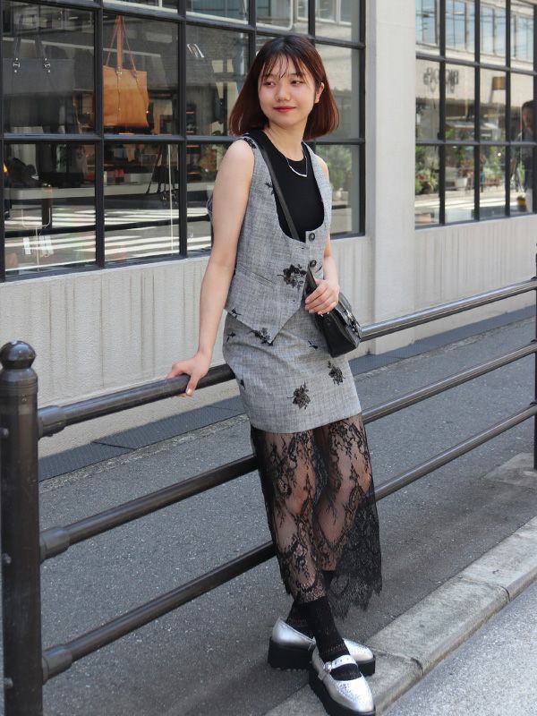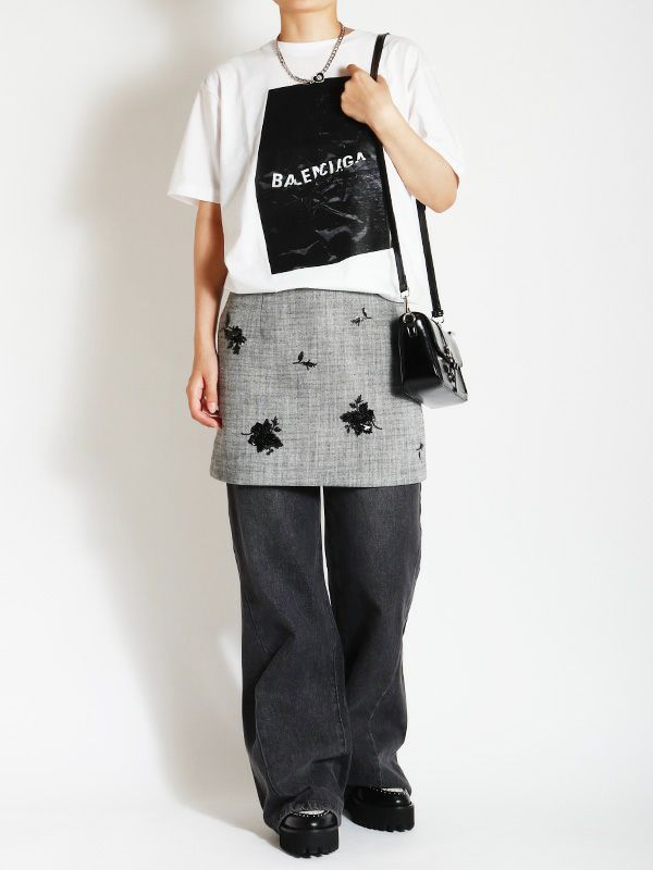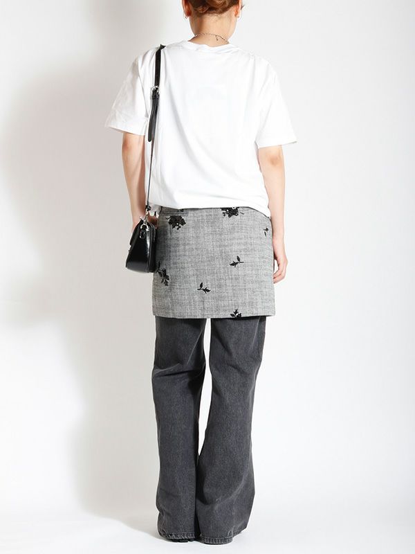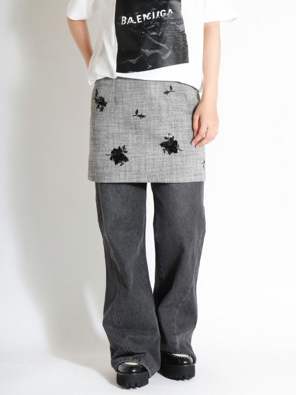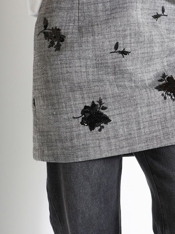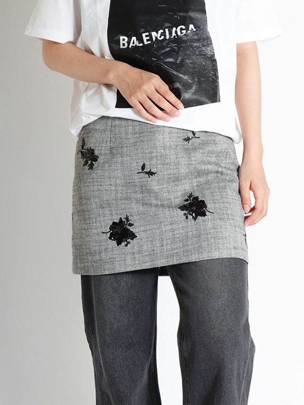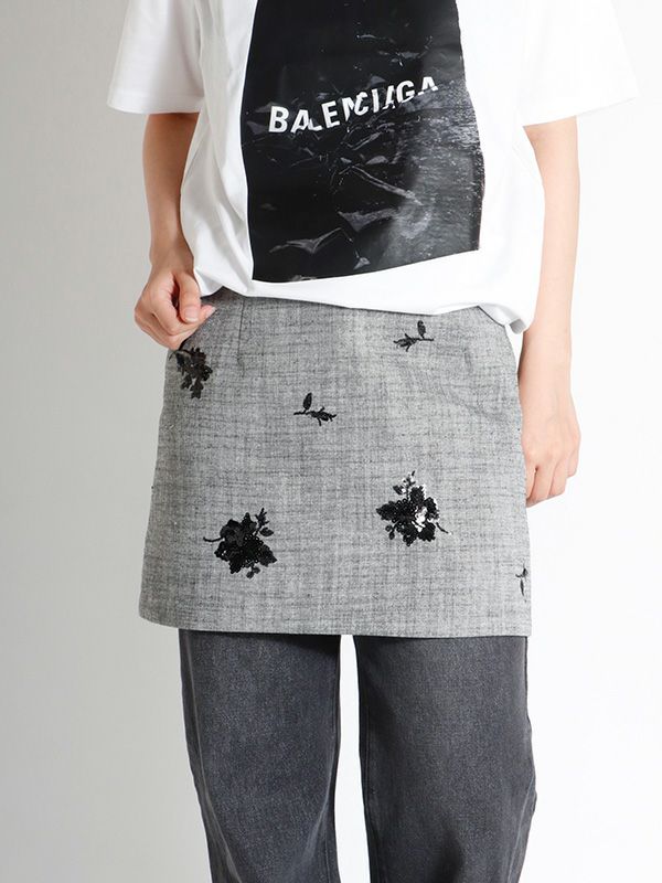 スパンコールのフラワー刺繍が配されたボックスミニスカート。タイト過ぎずレイヤードも楽しめる程よいゆとりのあるシルエットなので、1枚はもちろん、パンツやレーススカートの上に重ねるレイヤードスタイルもおすすめです。デイリーからドレスシーンまで幅広いコーディネートを楽しめます。同素材のベストとセットアップでの着用も可能で統一感のあるスタイリングをお楽しみいただけます。