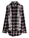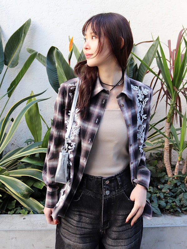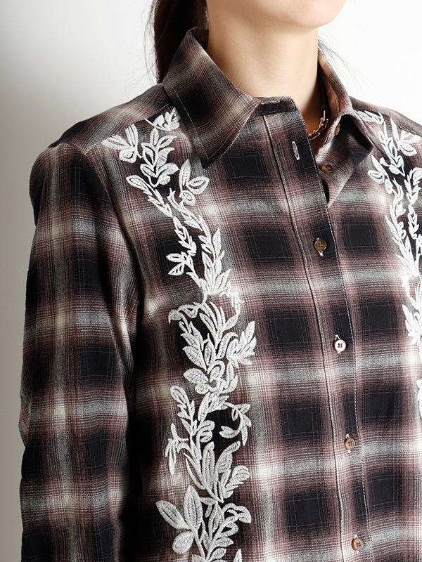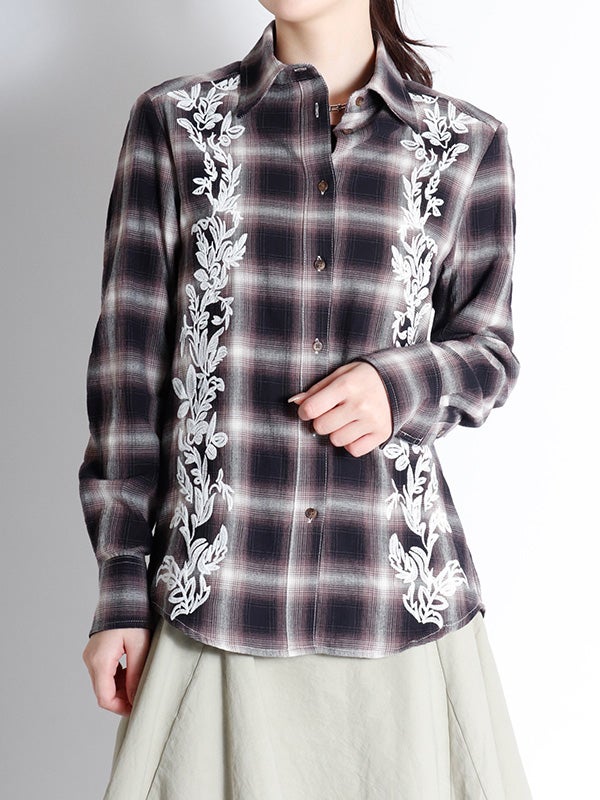 大胆に配置されたフラワーの刺繍が目を引くチェック柄のシャツ。トレンド感のあるダークトーンのオンブレチェックが装いに遊び心と品格をプラスしてくれ、1枚でコーディネートの主役になるデザイン性の高いアイテムです。ラフにデニムパンツと合わせるのはもちろん、スラックスやフレアパンツと合わせれば、きれいめ大人カジュアルに仕上がります。羽織りとしてレイヤードを楽しむのもおすすめです。