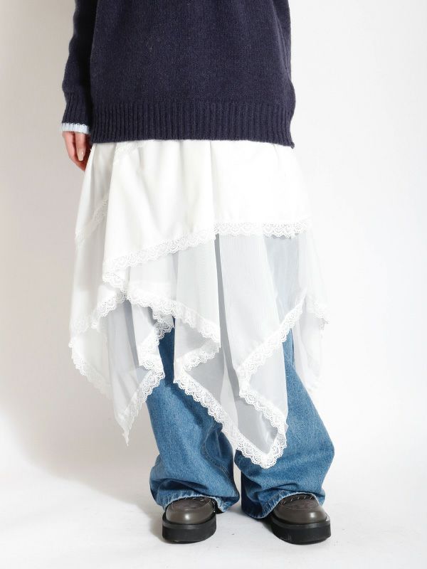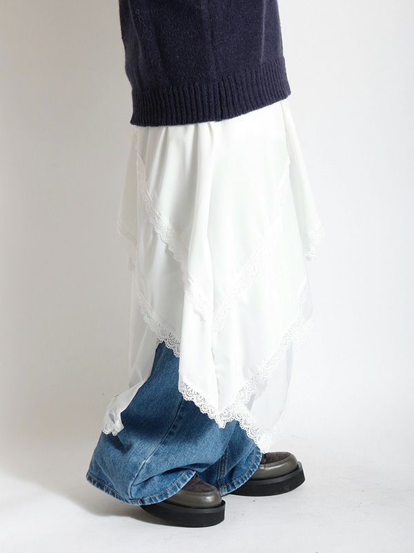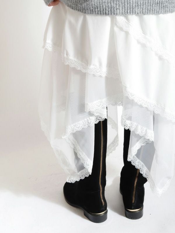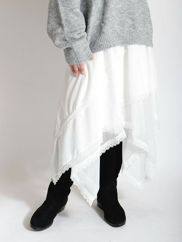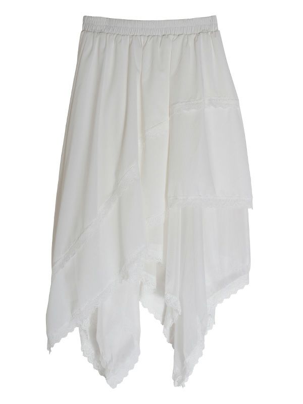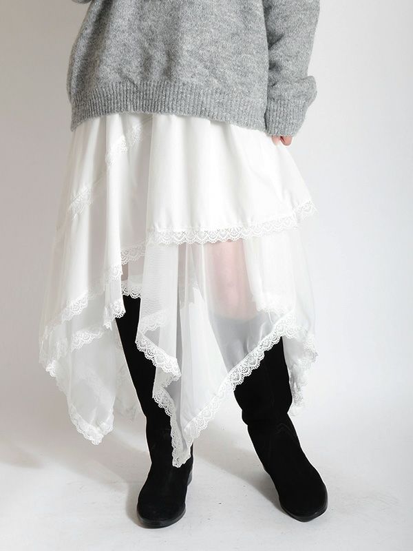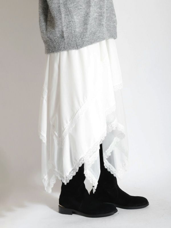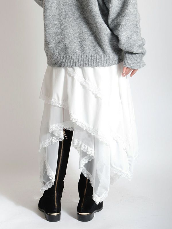 イレギュラーに施されたアシンメトリーなヘムラインがフレッシュな表情をみせるデザインスカート。 動くたびに新しい表情と立体感が生み出され、新鮮な印象に導きます。 ヘムラインにレースを施しフェミニンな印象は保ちながら、アシンメトリーなシルエットにすることで躍動感をプラス。シルエットをキープしてくれる程良いハリ感とインナーチュールの落ち感の異素材を組み合わせたテキスタイルが魅力です。スカートとしてはもちろんパンツとのレイヤードスタイルが特におススメのスカートです。