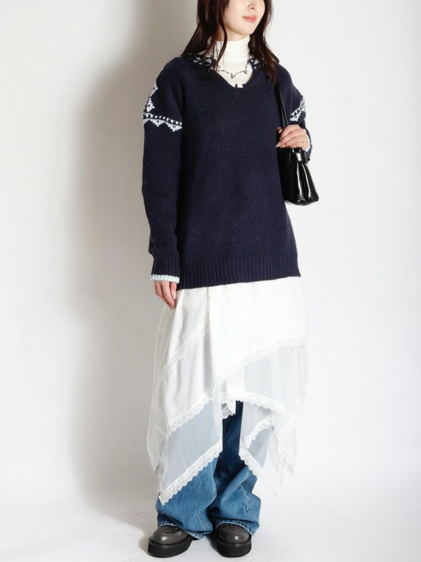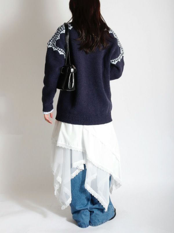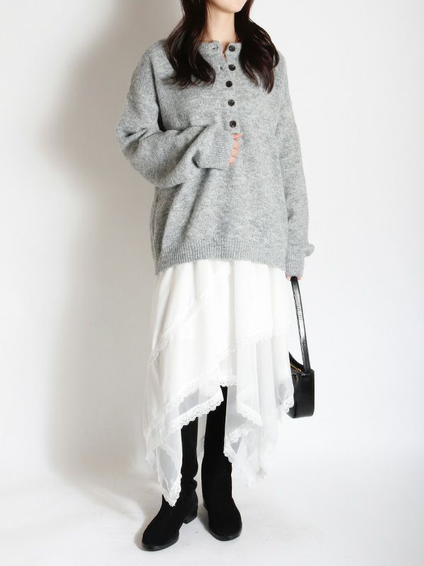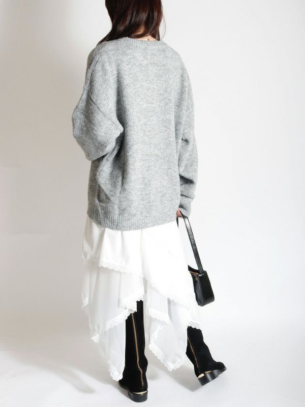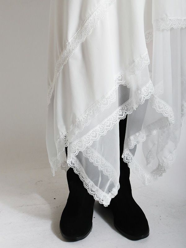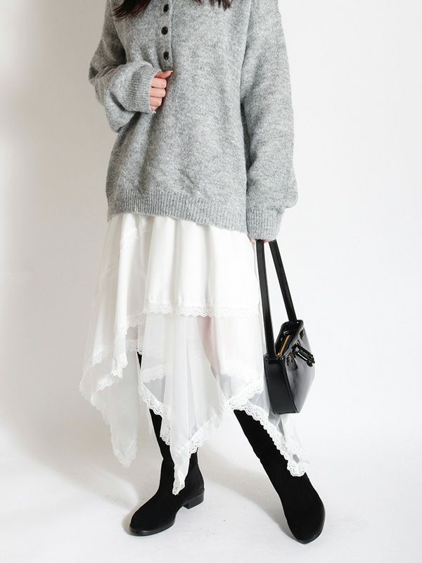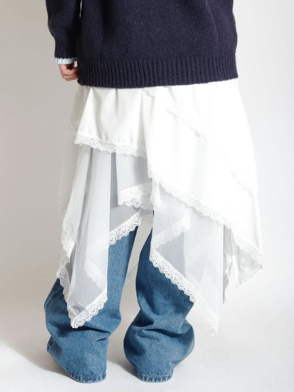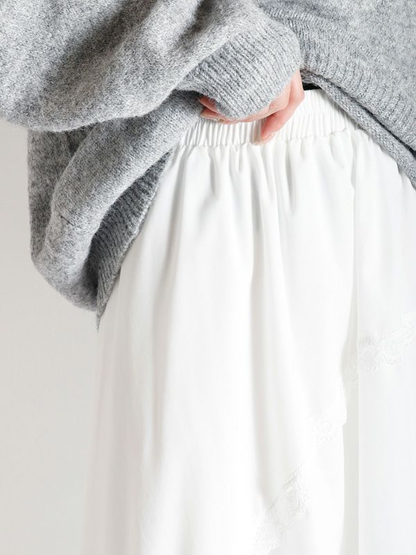 イレギュラーに施されたアシンメトリーなヘムラインがフレッシュな表情をみせるデザインスカート。 動くたびに新しい表情と立体感が生み出され、新鮮な印象に導きます。 ヘムラインにレースを施しフェミニンな印象は保ちながら、アシンメトリーなシルエットにすることで躍動感をプラス。シルエットをキープしてくれる程良いハリ感とインナーチュールの落ち感の異素材を組み合わせたテキスタイルが魅力です。スカートとしてはもちろんパンツとのレイヤードスタイルが特におススメのスカートです。