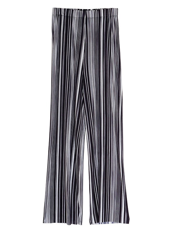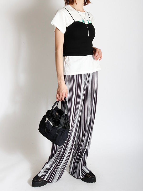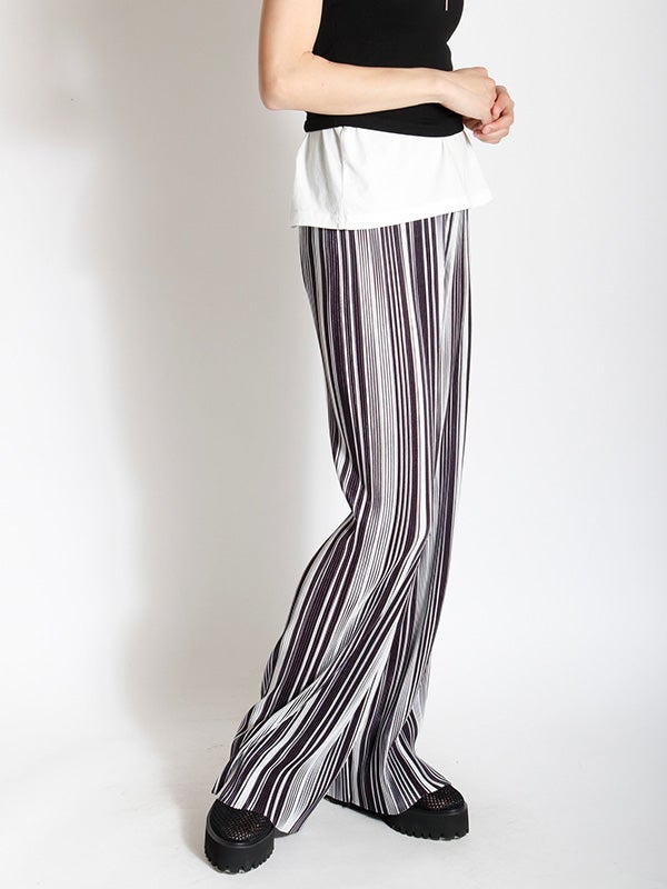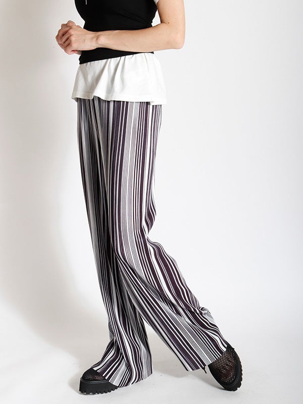 毎年大人気のプリーツパンツの新柄が入荷。ストレートシルエットに落ちつた配色の2トーンストライプが新鮮な1枚。ピッチの違うストライプなのでカジュアルになりすぎずに大人っぽく着ていただけます。カットソーやシャツなど幅広いトップスやワンピースなどとのレイヤードにも好相性。プリーツの縦のラインが美脚効果を叶えてくれ、ウエストはゴム仕様で楽に穿いていただけます。快適さと美脚効果を兼ね備えたパンツです。