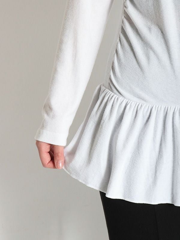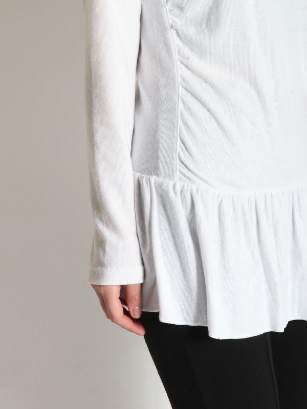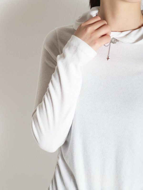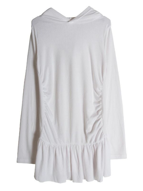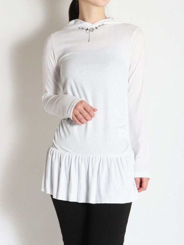 レイヤードスタイルに大活躍間違いなしのフーディ付プルオーバー。女性らしい印象で着用できるよう、ネック周りはやや広めに。レイヤードがしやすい程よいフィット感のあるサイズです。1枚ではもちろん、肌寒い日はスウェットのインナーにしてデザインを活かしたレイヤードスタイルやTシャツとの重ね着、ジャケットを羽織るなど、様々な着こなしが楽しめます。特にスウェットやTシャツとレイヤードをし、フードと裾のフリルを出して着用していただくのがおすすめです。