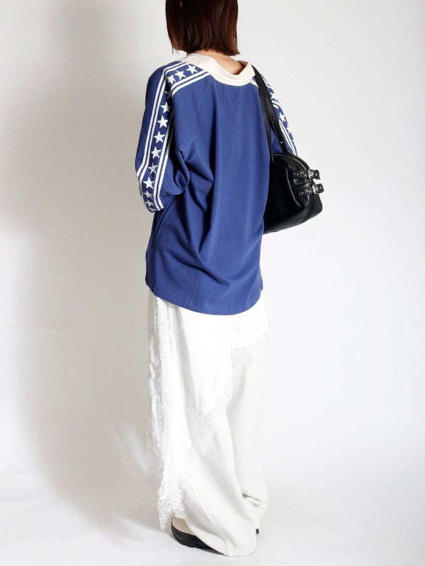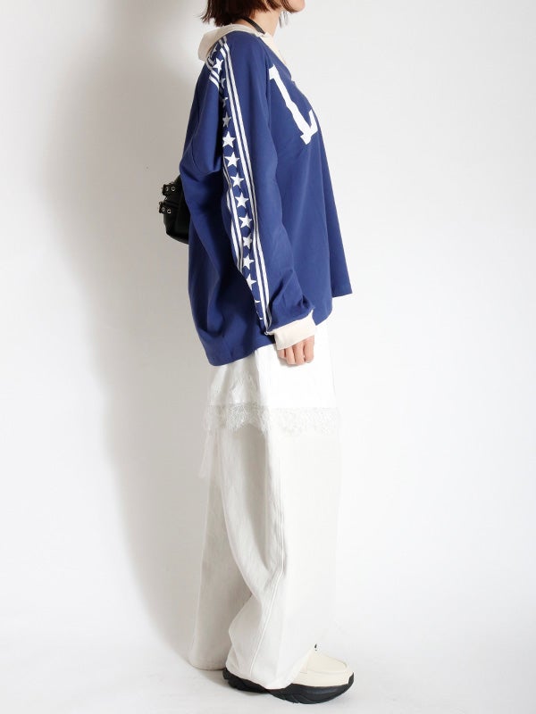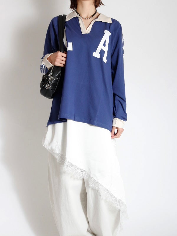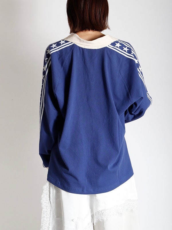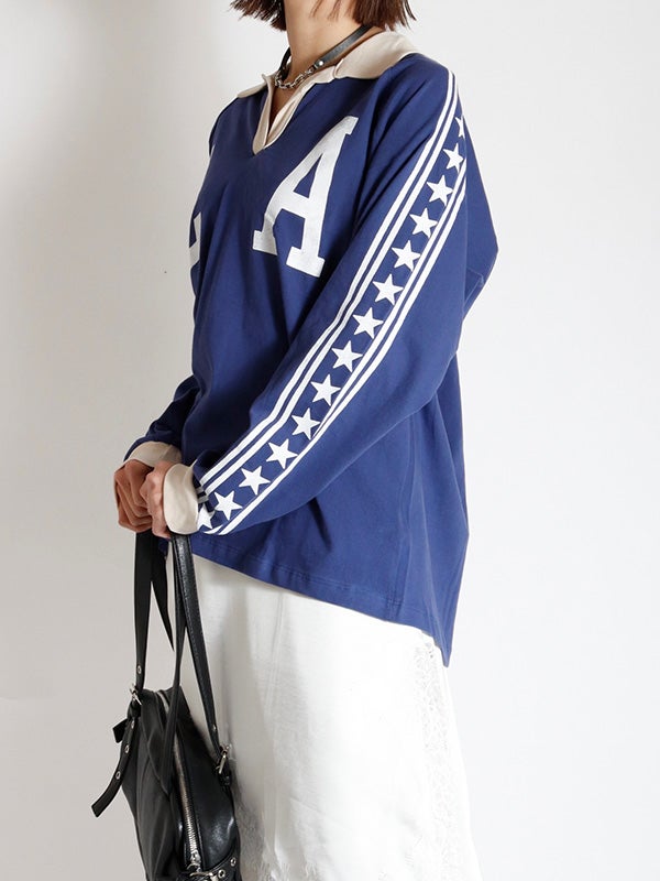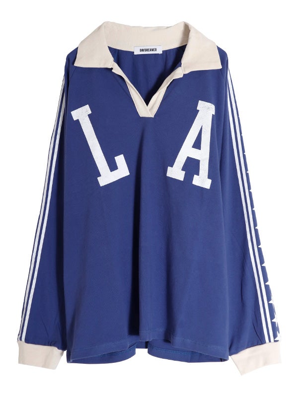 ロサンゼルスへのオマージュとしてデザインされたこのラガーシャツ。大都市ロサンゼルスをフィーチャーしストライプ柄の袖とコントラストのネックカラーとカフスがアクセントになっています。袖はゆったりとしたシルエットが特徴で中厚手のコットン素材を使用し美しいドレープが出るデザイン。ラグランスリーブ、コントラストカラーの襟、ストライプ柄のオーバーレイスリーブがポイントです。トレンドのフェミニンなアイテムと合わせたスタイリングも今季はおススメです。