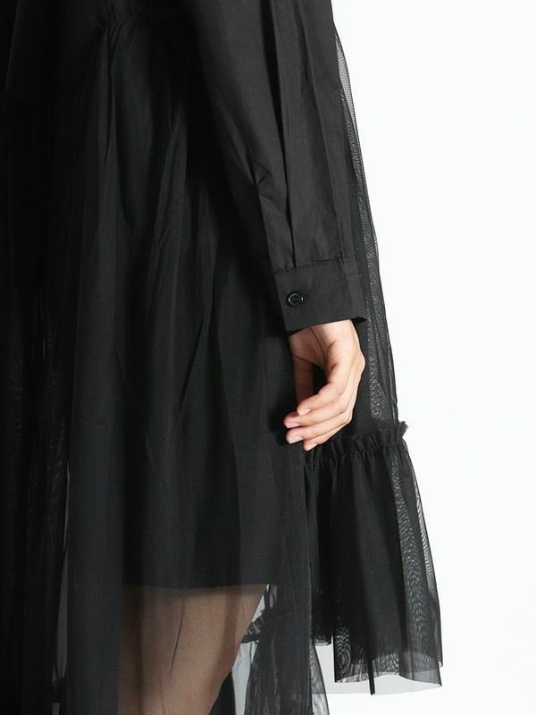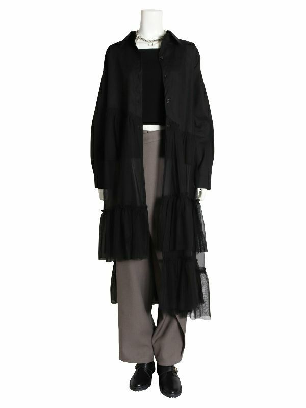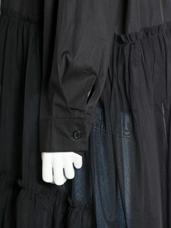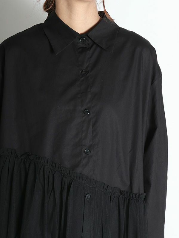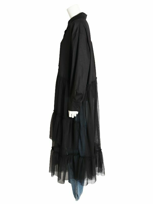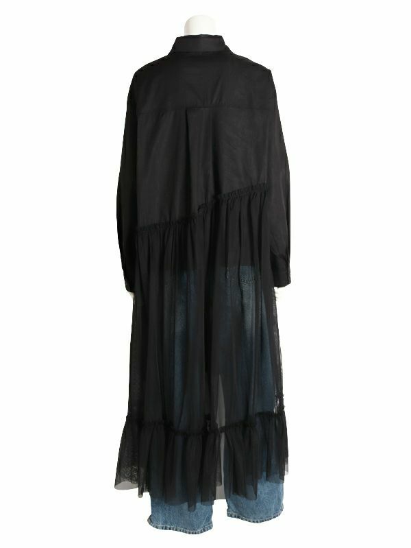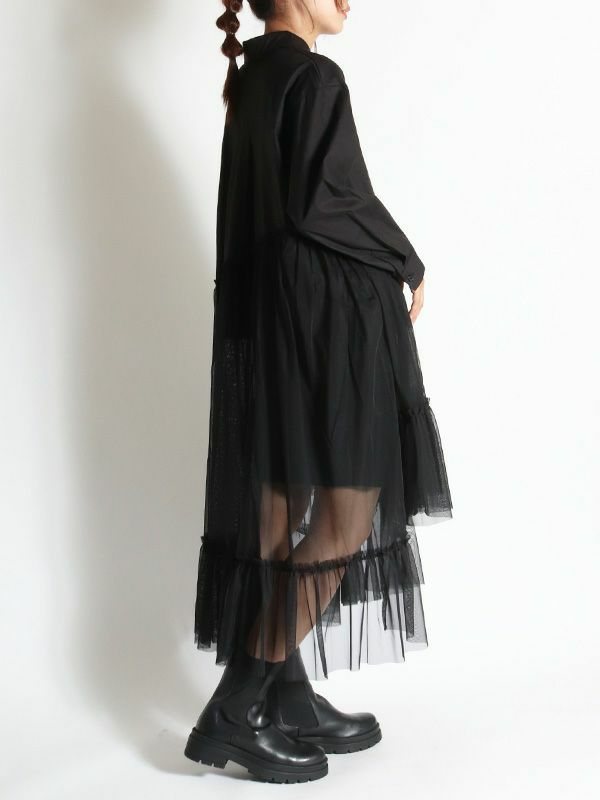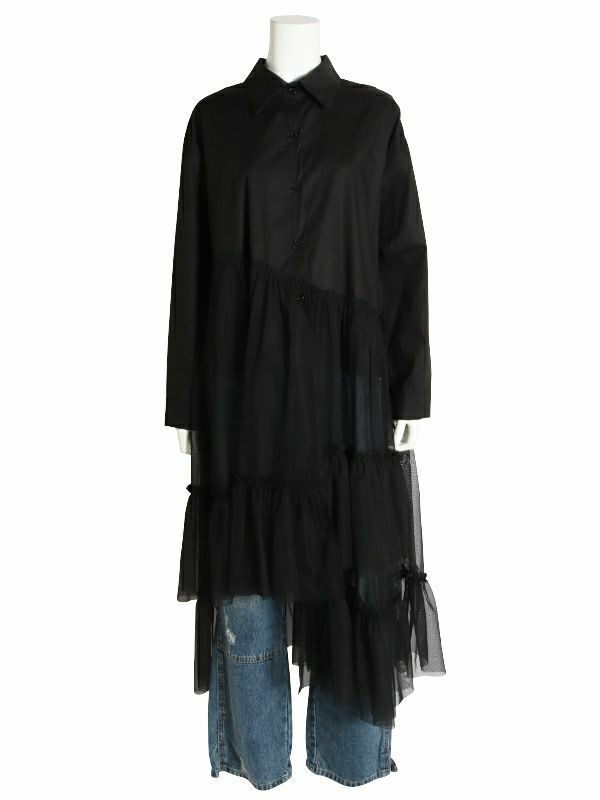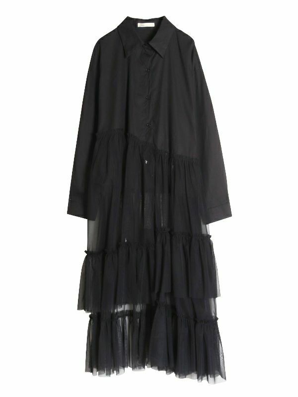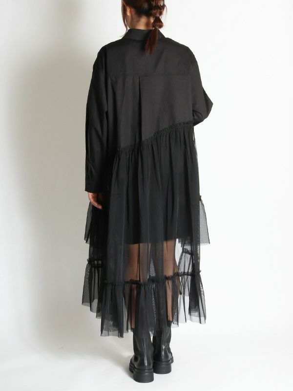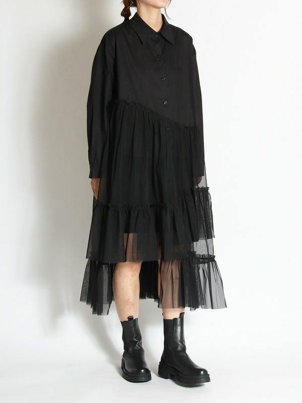 シンプルな長袖シャツをベースに、チュール素材をアシンメトリーなティアードデザインで組み合わせたシャツワンピース。インパクトたっぷりなデザインながらブラックで統一しているのでモードな印象です。身頃はシャツ襟でスッキリとさせており、デニムなどを合わせるだけでコーディネートが今っぽくなり、様々なレイヤードをお楽しみいただけます。1枚で大活躍する存在感抜群なワンピースです。