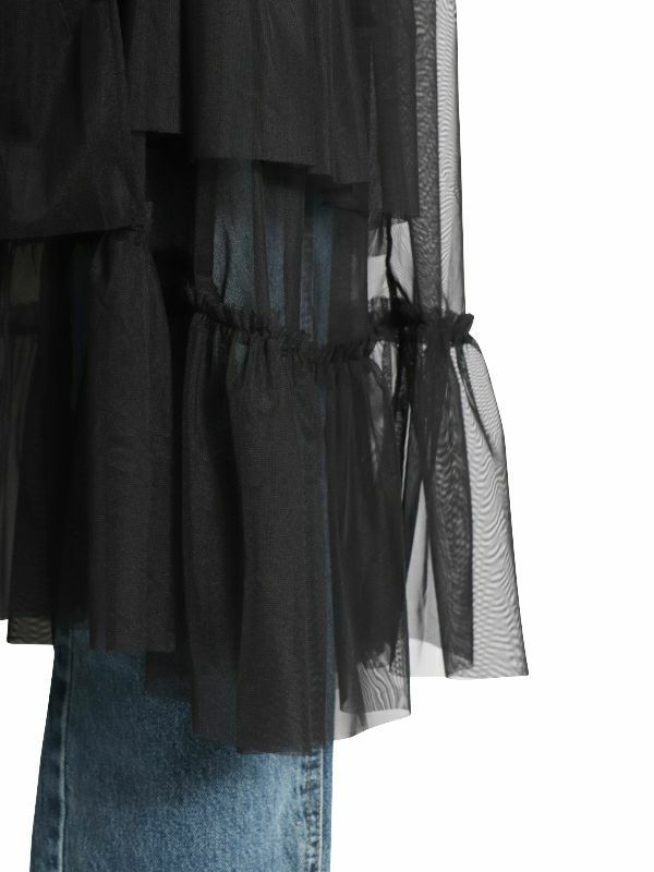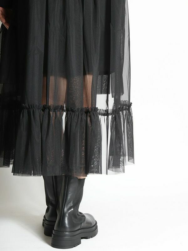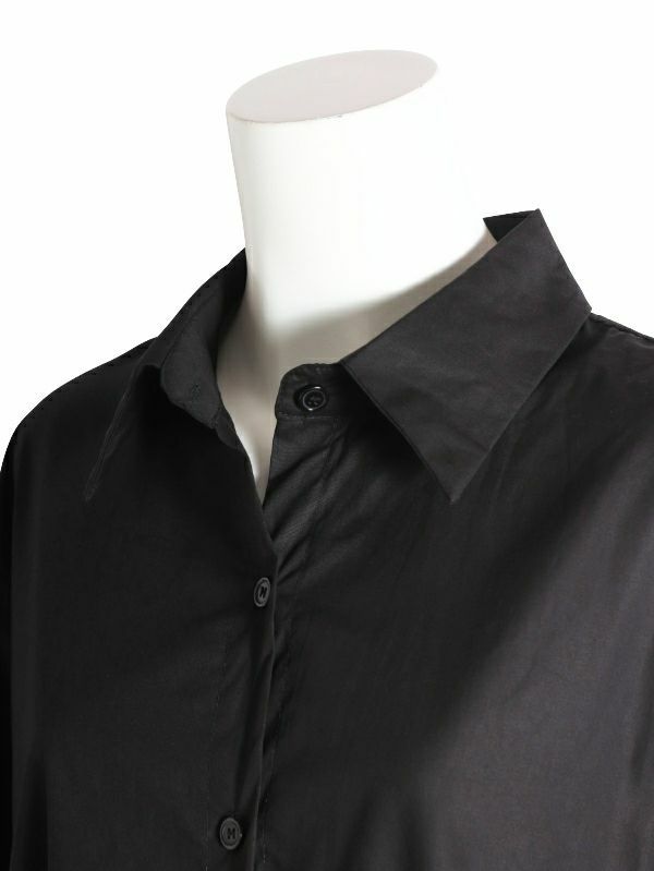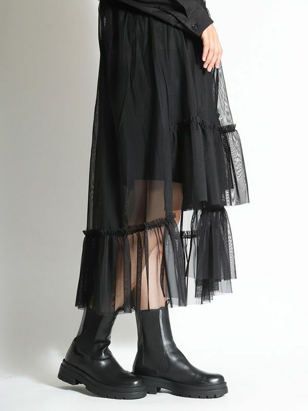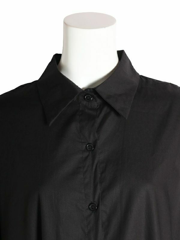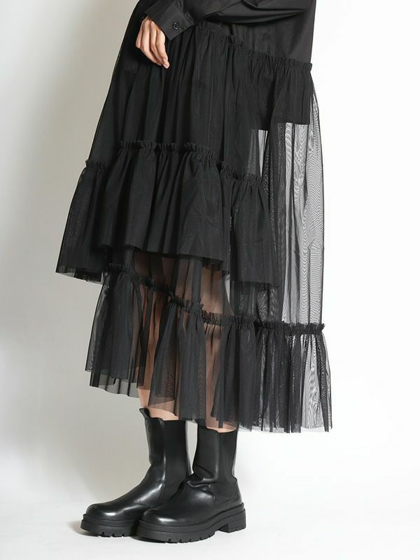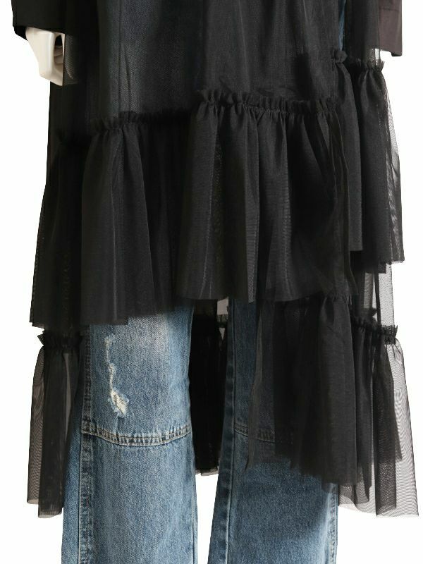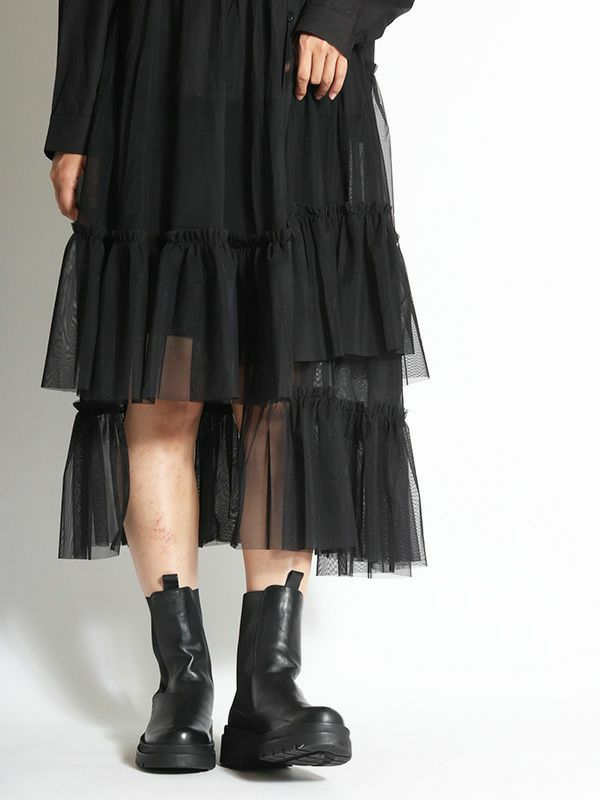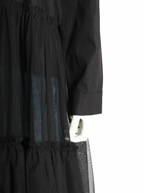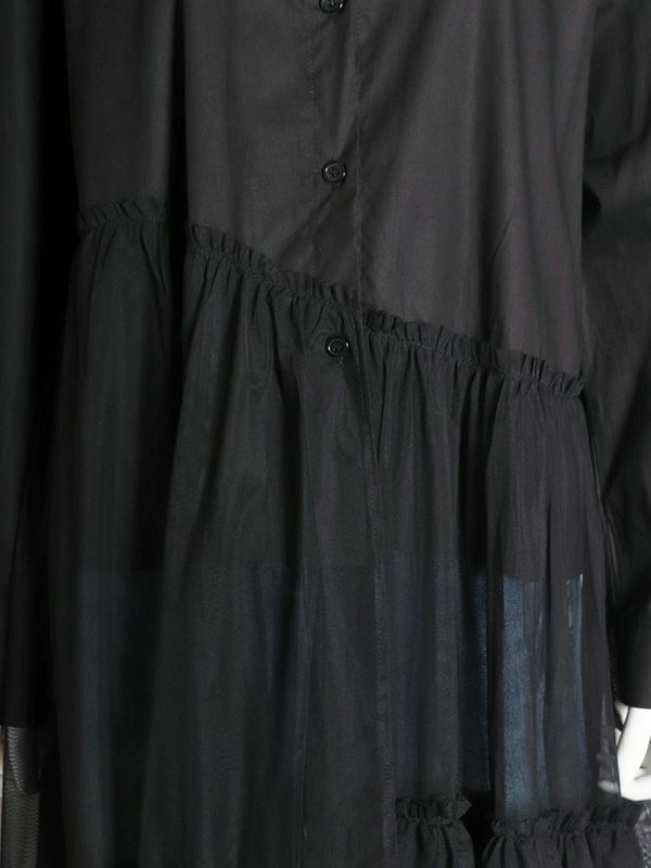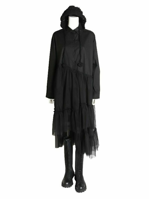 シンプルな長袖シャツをベースに、チュール素材をアシンメトリーなティアードデザインで組み合わせたシャツワンピース。インパクトたっぷりなデザインながらブラックで統一しているのでモードな印象です。身頃はシャツ襟でスッキリとさせており、デニムなどを合わせるだけでコーディネートが今っぽくなり、様々なレイヤードをお楽しみいただけます。1枚で大活躍する存在感抜群なワンピースです。
