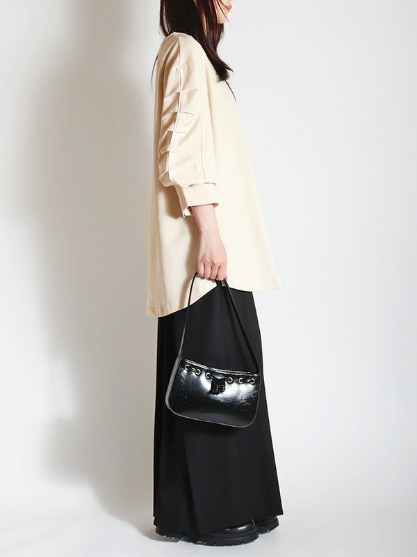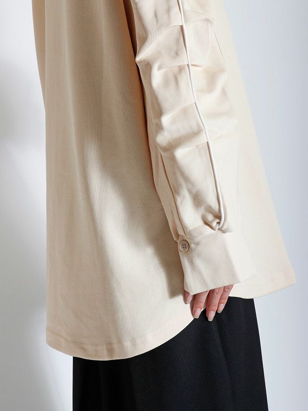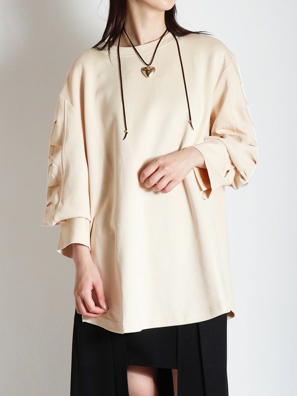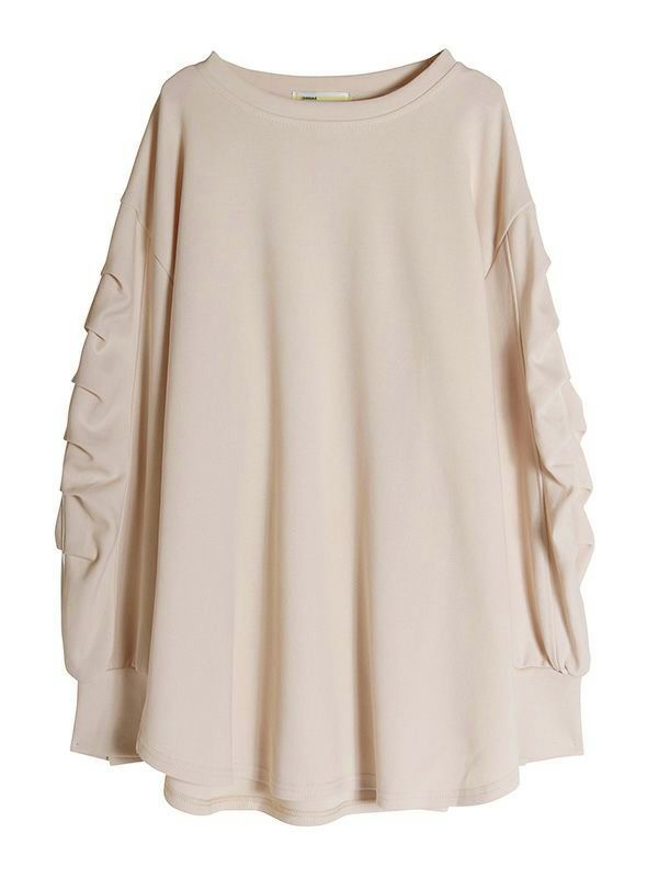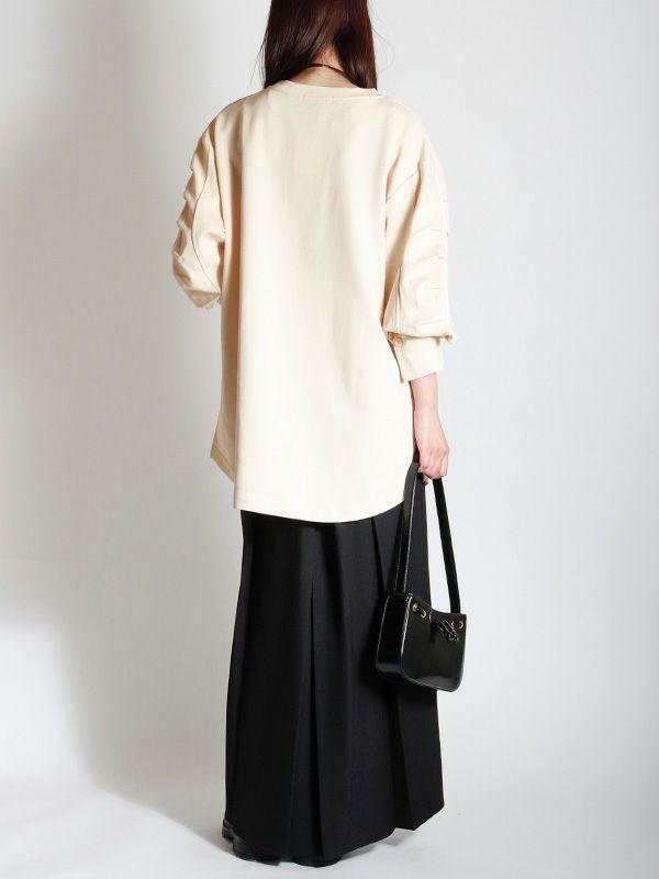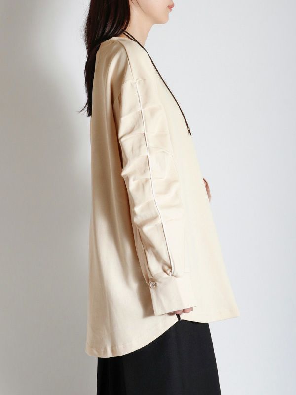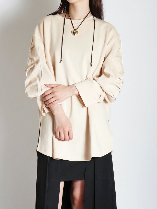 タックデザインがポイントのトップス。袖にたっぷりとタックを施し、カフスボタンを付け、両脇裾にスリットを入れて、ラフな印象のロンTにデザイン性を持たせたひと品。アウトでもインでも着やすい厚みと丈感で着回し力も抜群です。身頃部分はシンプルなデザインなので、ベストやビスチェ、キャミワンピなどとのレイヤードにもおすすめです。
