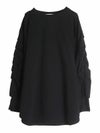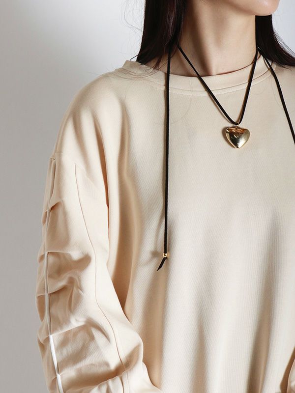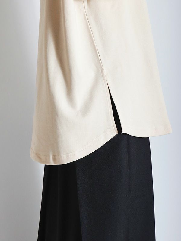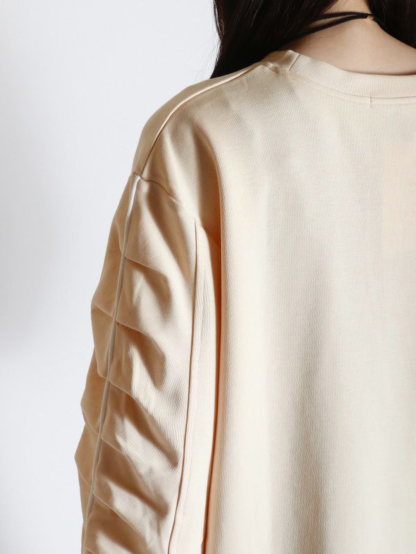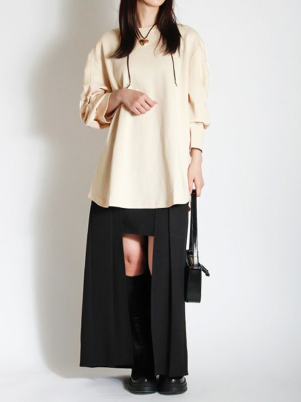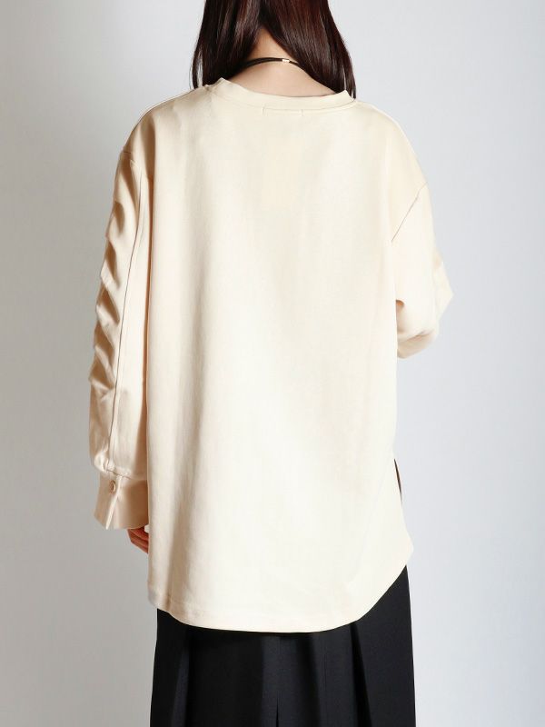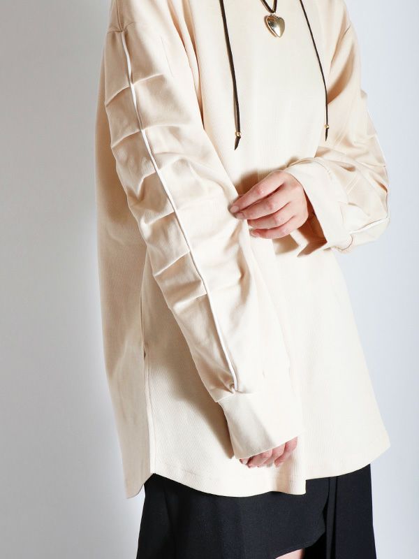 タックデザインがポイントのトップス。袖にたっぷりとタックを施し、カフスボタンを付け、両脇裾にスリットを入れて、ラフな印象のロンTにデザイン性を持たせたひと品。アウトでもインでも着やすい厚みと丈感で着回し力も抜群です。身頃部分はシンプルなデザインなので、ベストやビスチェ、キャミワンピなどとのレイヤードにもおすすめです。