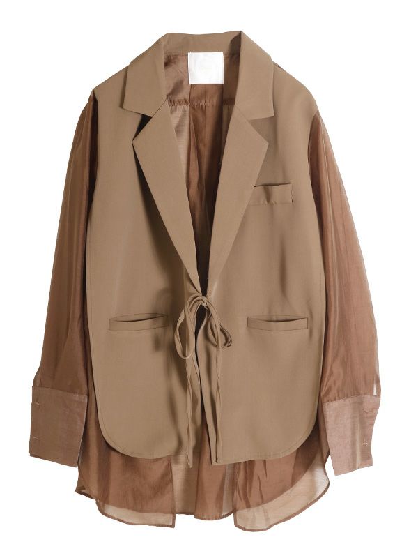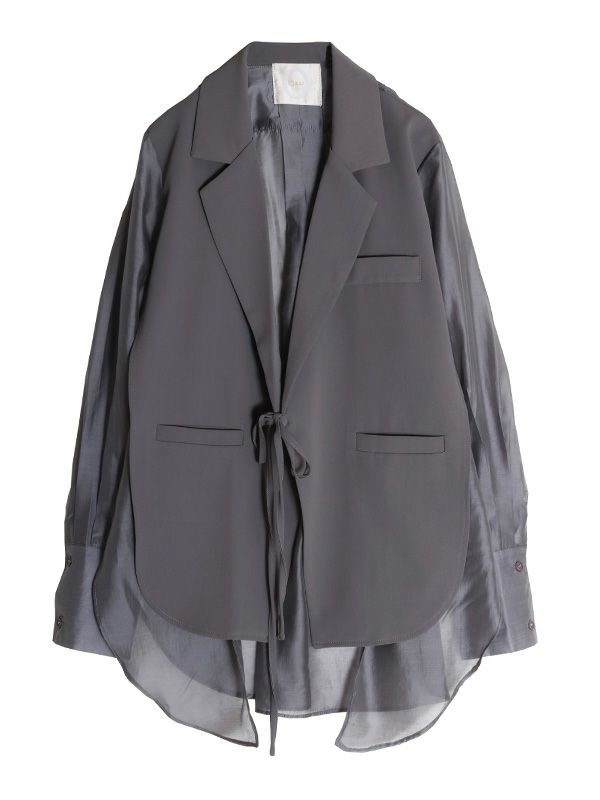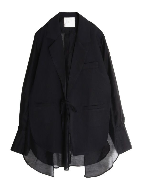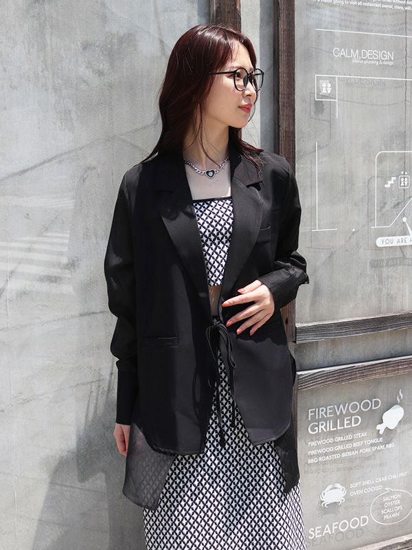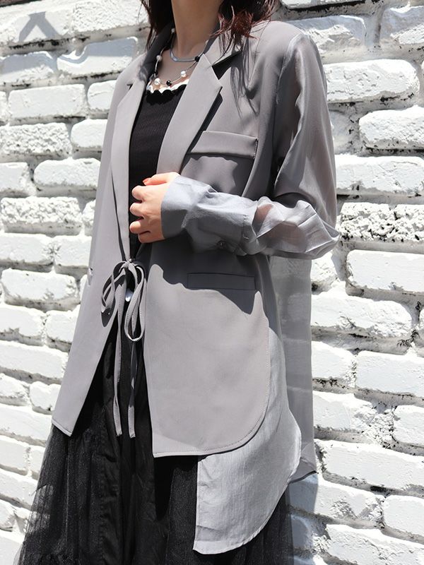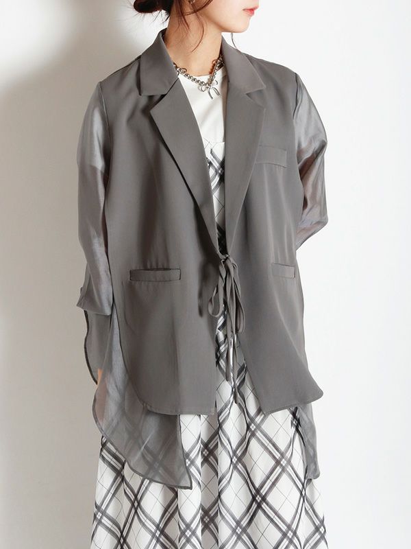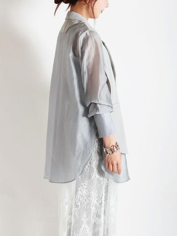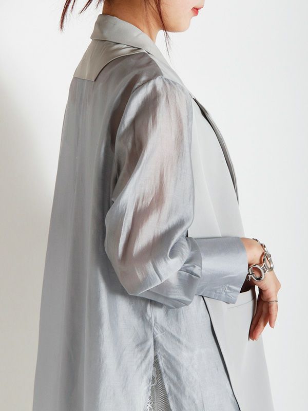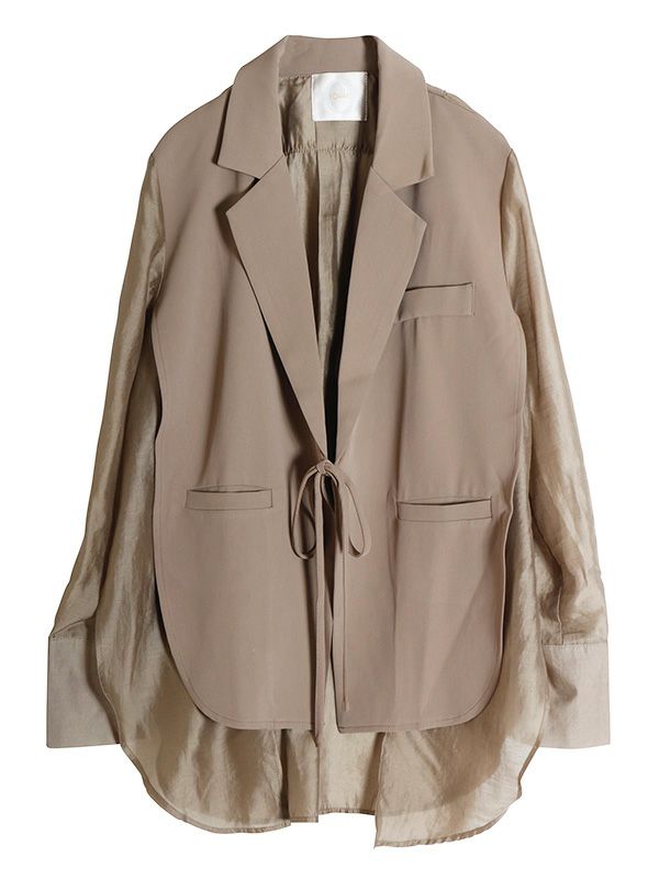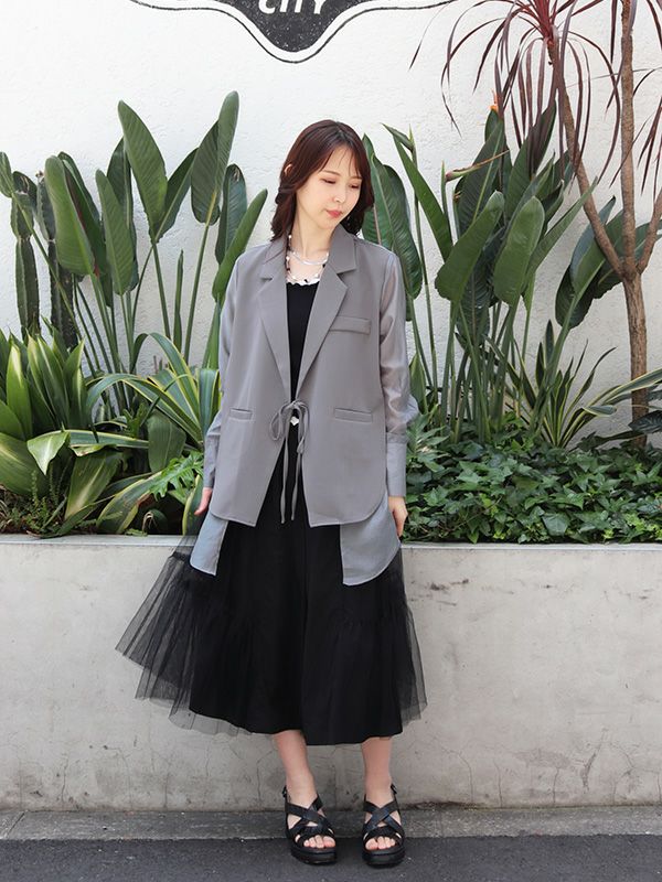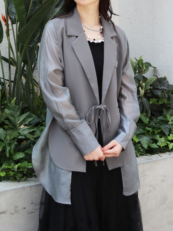 大人気のシアージャケットがバージョンアップ&新色で入荷しました!オーガンジーのシアー感のある素材を使用し、異素材で切り替えた珍しいデザインの変化球ジャケット。フロントのストリングデザインも程よい抜け感をプラスしてくれます。暑くなると質感が気になるジャケットも透け感素材だと重くならないのが◎ オーガンジー素材の張り感があるので形がきれいに出ています。透け感素材なので決まり過ぎず 程良くカジュアルな印象に◎大人女性におすすめのジャケットです。