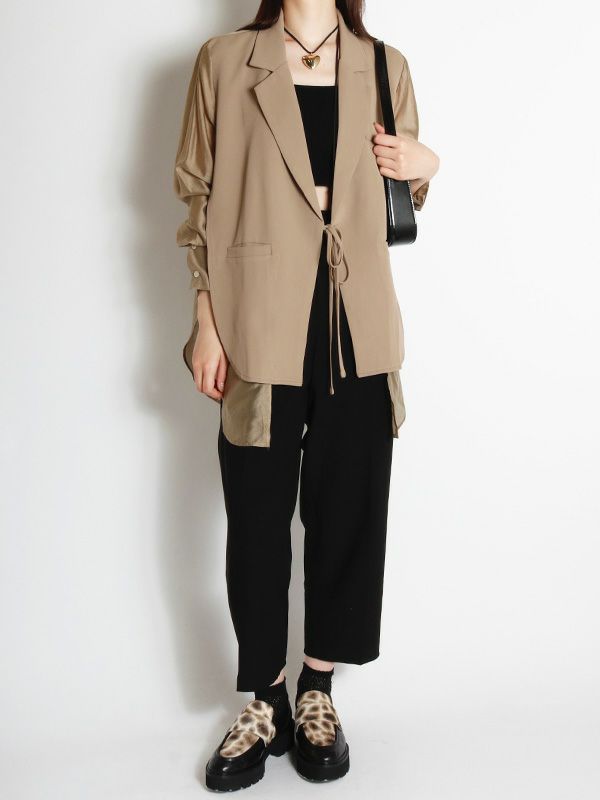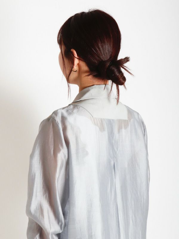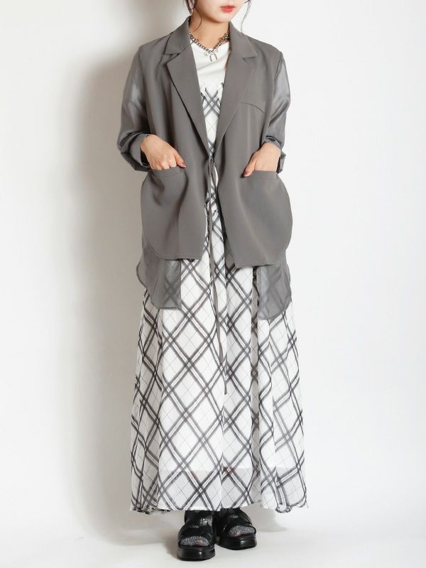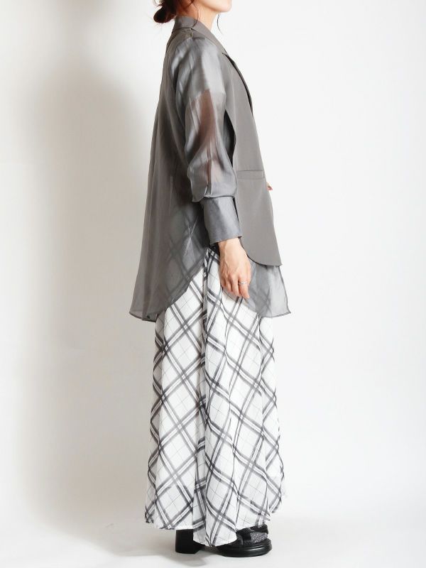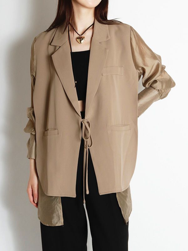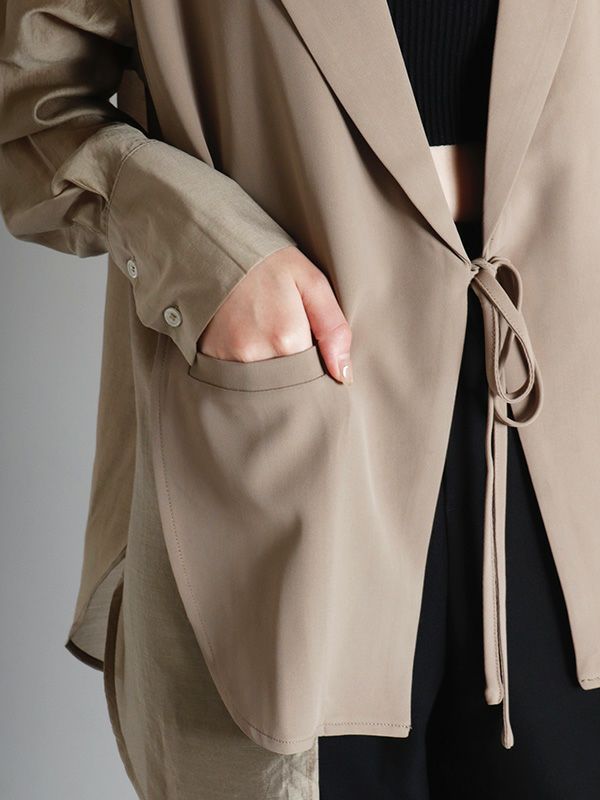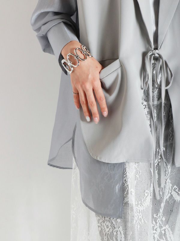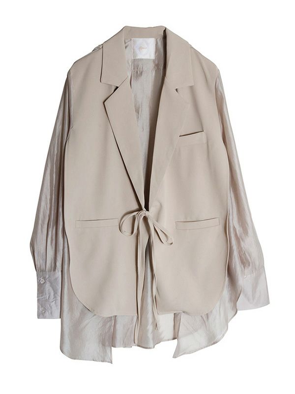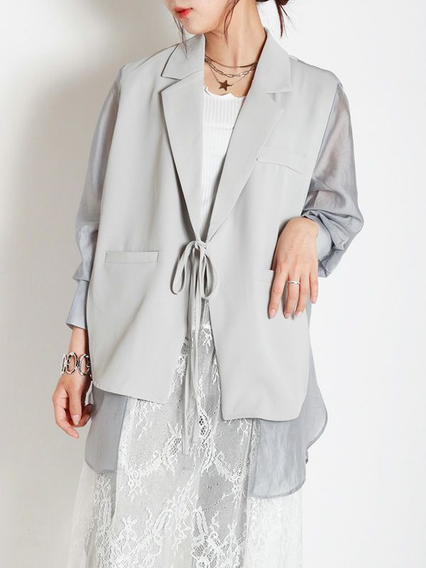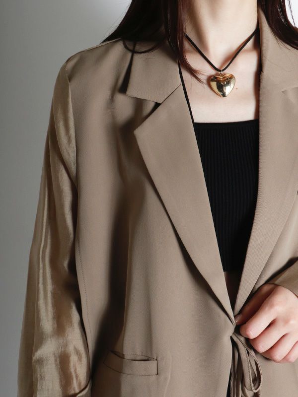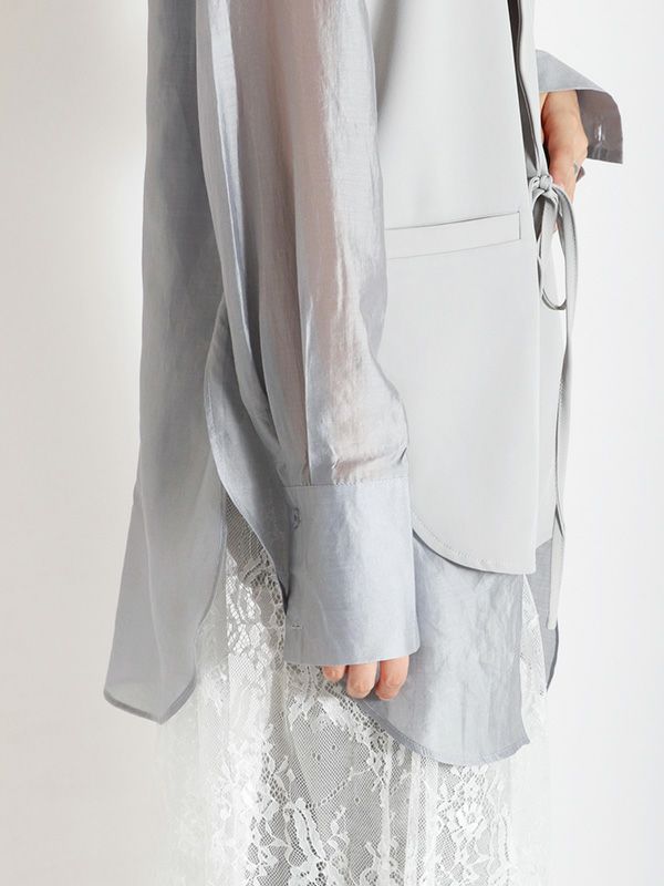 大人気のシアージャケットがバージョンアップ&新色で入荷しました!オーガンジーのシアー感のある素材を使用し、異素材で切り替えた珍しいデザインの変化球ジャケット。フロントのストリングデザインも程よい抜け感をプラスしてくれます。暑くなると質感が気になるジャケットも透け感素材だと重くならないのが◎ オーガンジー素材の張り感があるので形がきれいに出ています。透け感素材なので決まり過ぎず 程良くカジュアルな印象に◎大人女性におすすめのジャケットです。