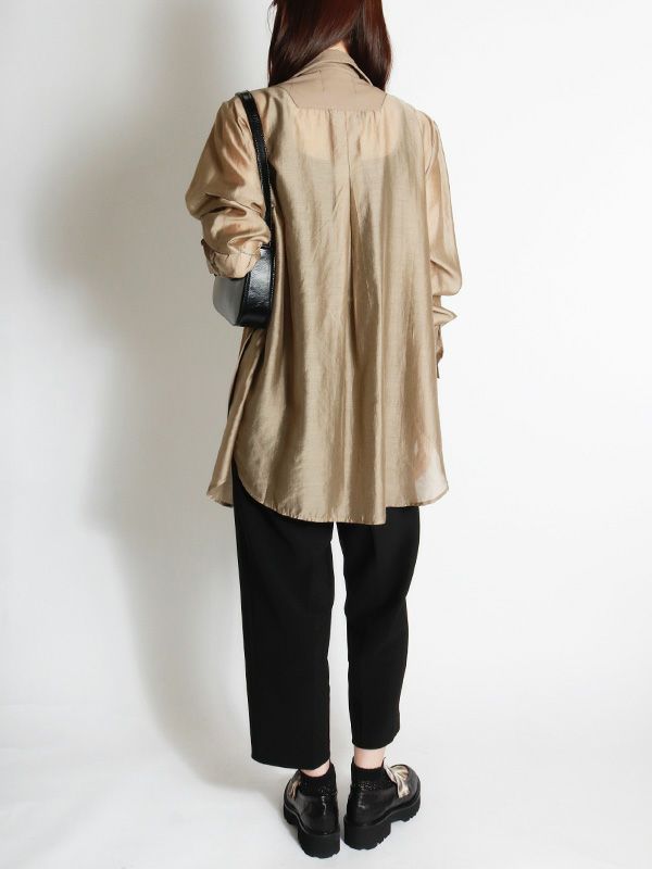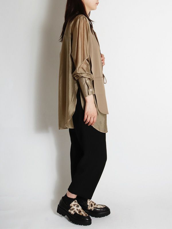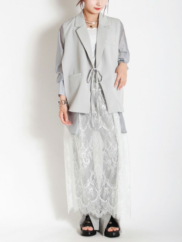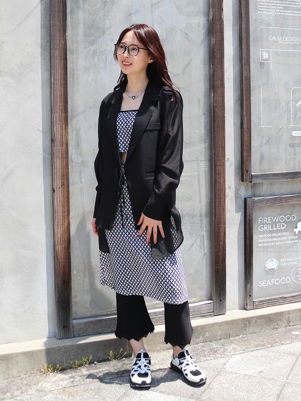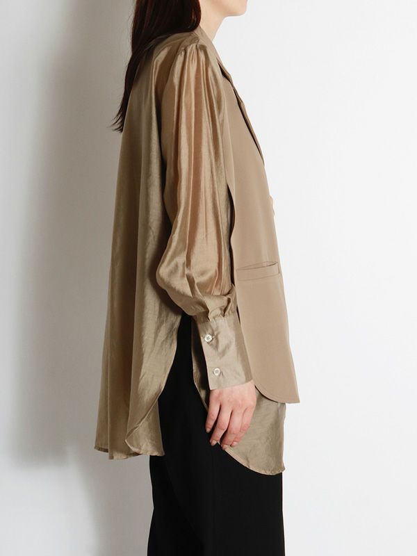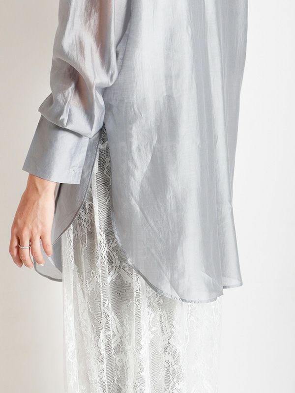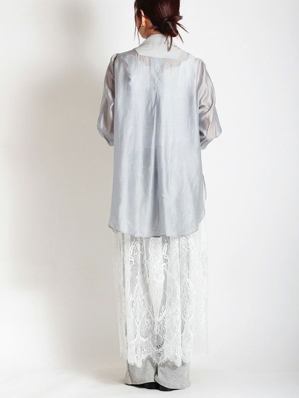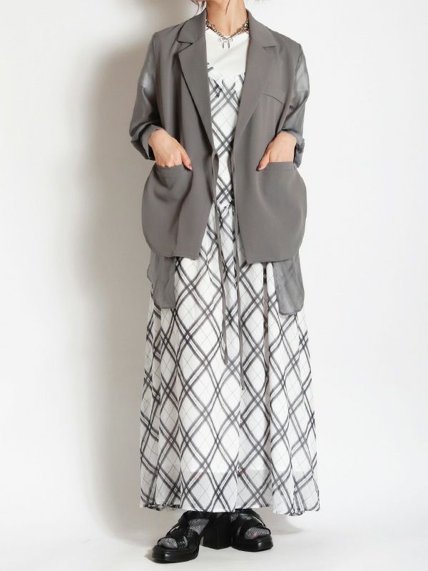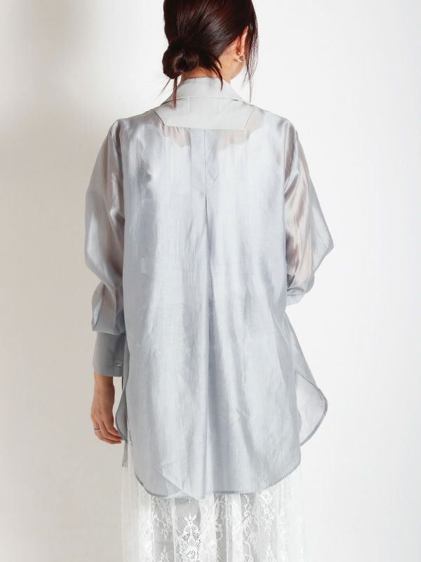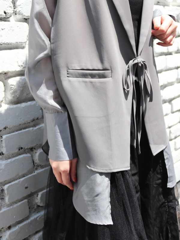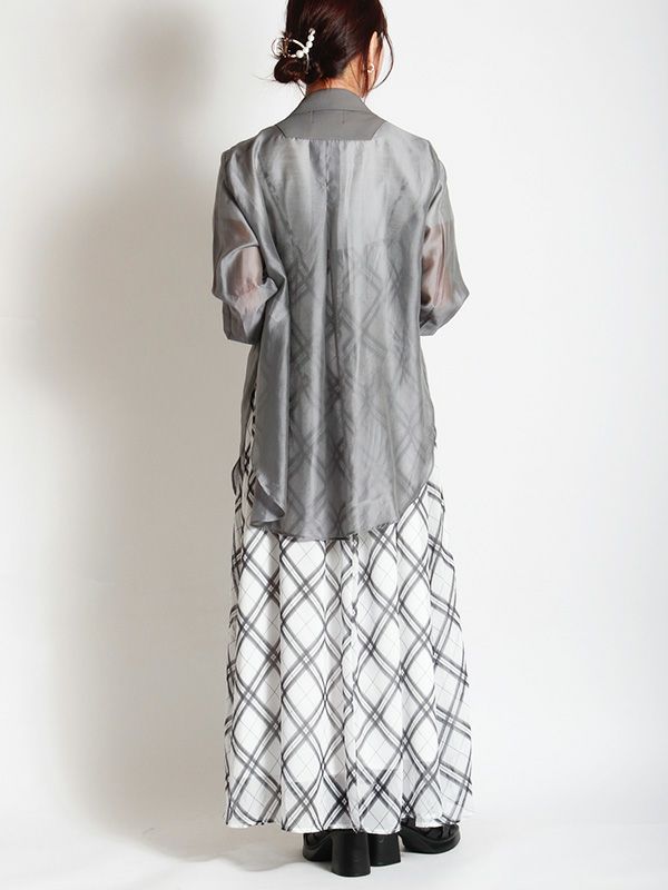 大人気のシアージャケットがバージョンアップ&新色で入荷しました!オーガンジーのシアー感のある素材を使用し、異素材で切り替えた珍しいデザインの変化球ジャケット。フロントのストリングデザインも程よい抜け感をプラスしてくれます。暑くなると質感が気になるジャケットも透け感素材だと重くならないのが◎ オーガンジー素材の張り感があるので形がきれいに出ています。透け感素材なので決まり過ぎず 程良くカジュアルな印象に◎大人女性におすすめのジャケットです。
