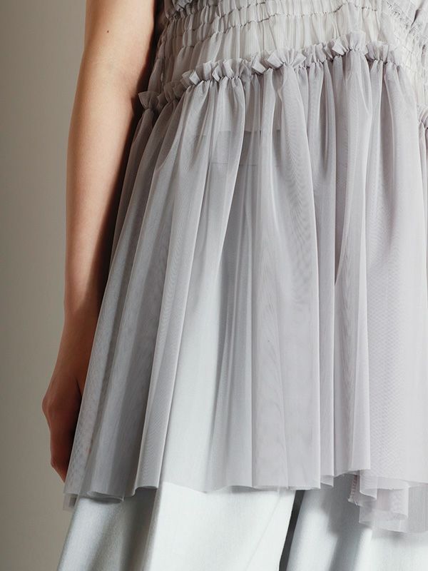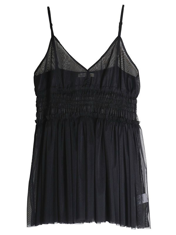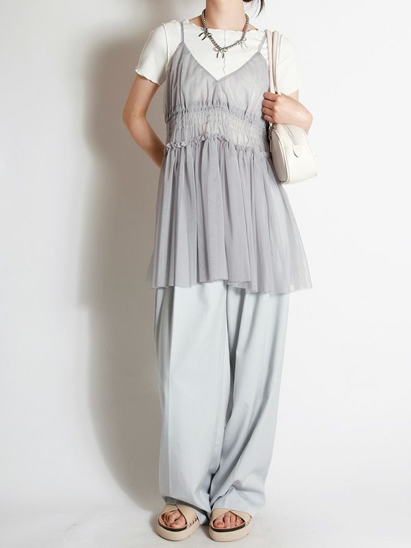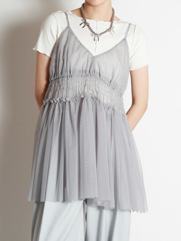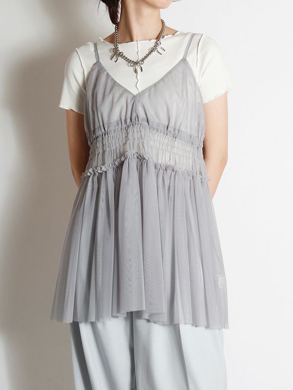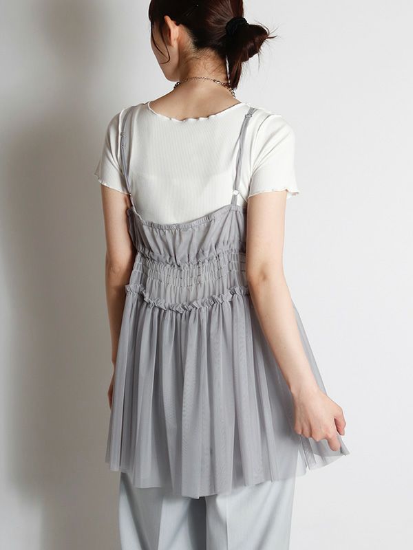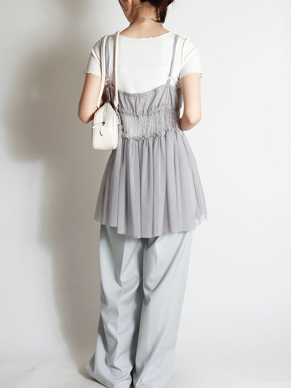 インナー次第で表情が変わる、トレンドのシャーリングキャミソールトップス。チュール素材ならではのフンワリと広がるボトム部分が、華やかで女性らしい印象を与えます。幅広めに施されたシャーリングデザインが、ウエストからヒップにかけてのラインを強調し、美しいメリハリシルエットを際立たせます。ヘルシーな肌見せにはタンクトップ、カジュアルなアクセントを加えるならプリントTシャツ合わせがおススメです◎。