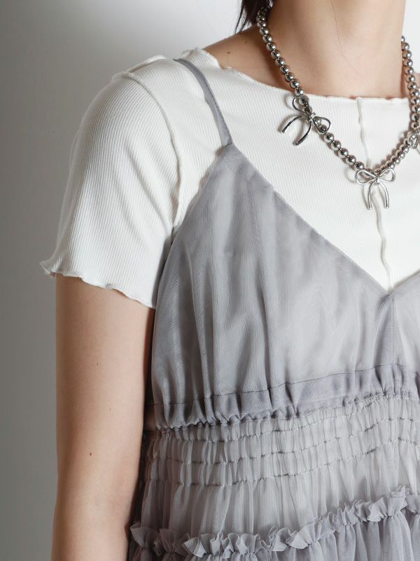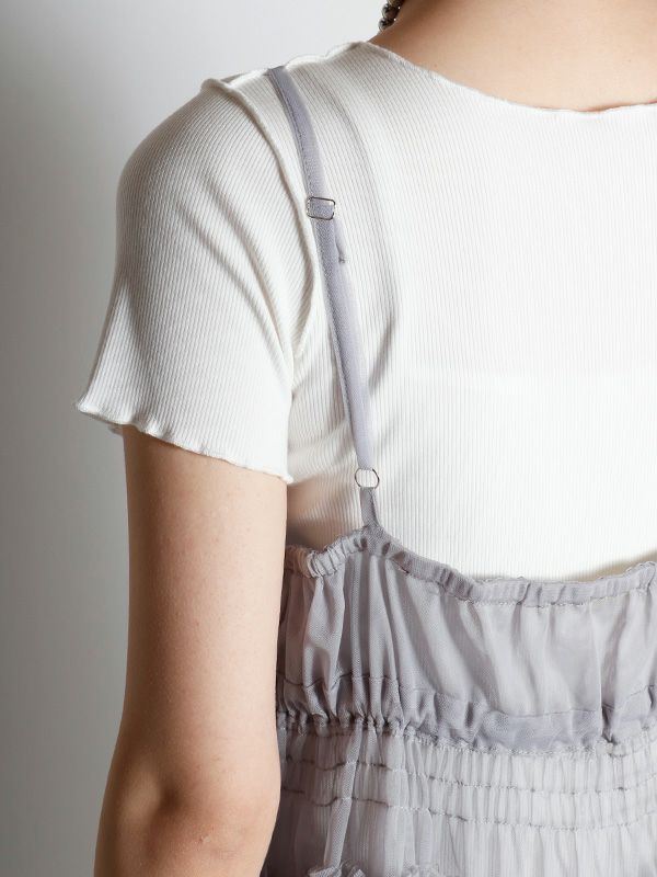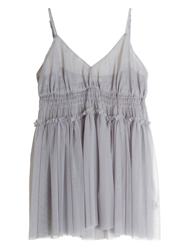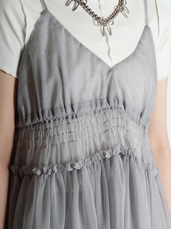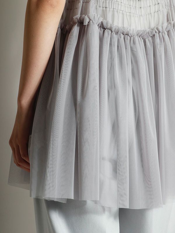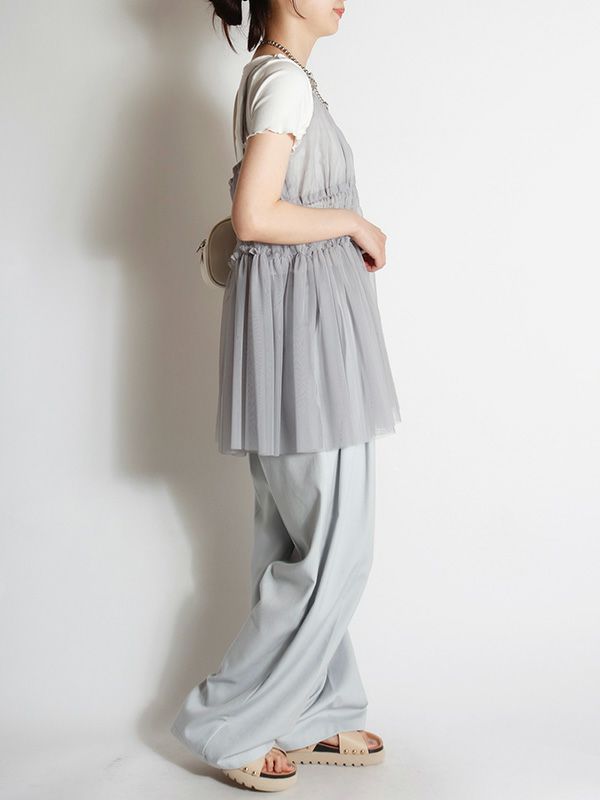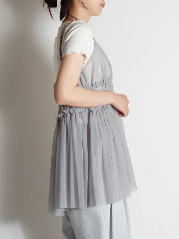 インナー次第で表情が変わる、トレンドのシャーリングキャミソールトップス。チュール素材ならではのフンワリと広がるボトム部分が、華やかで女性らしい印象を与えます。幅広めに施されたシャーリングデザインが、ウエストからヒップにかけてのラインを強調し、美しいメリハリシルエットを際立たせます。ヘルシーな肌見せにはタンクトップ、カジュアルなアクセントを加えるならプリントTシャツ合わせがおススメです◎。