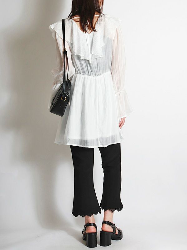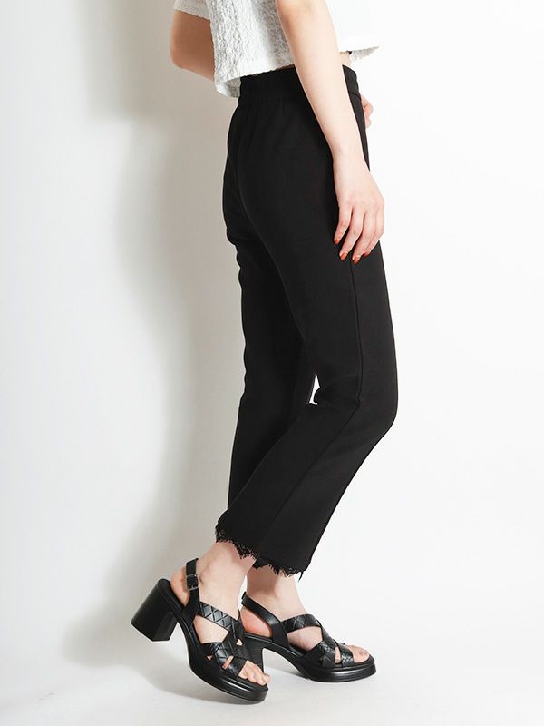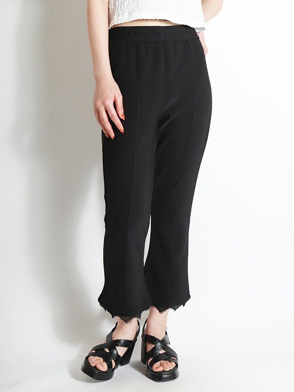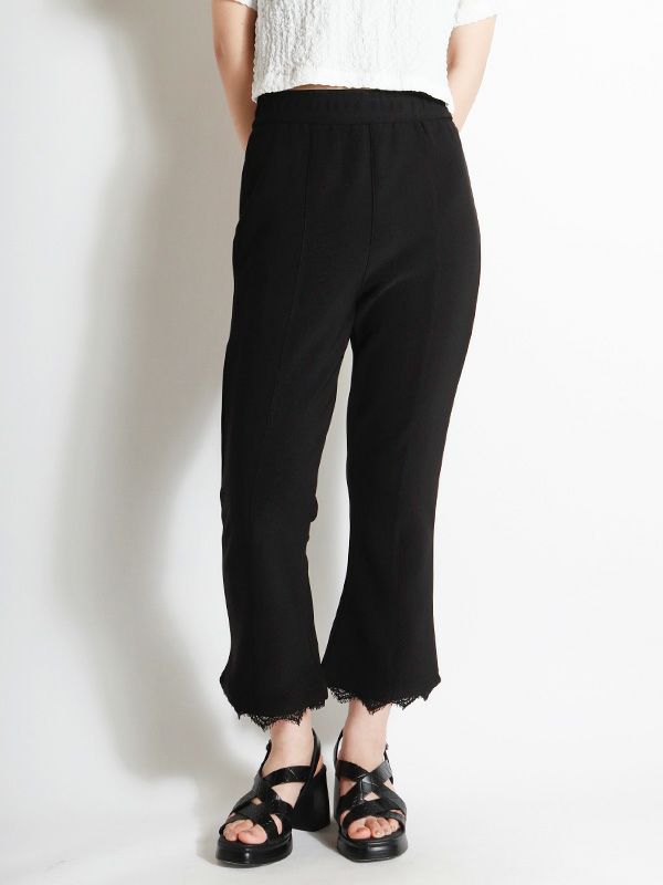 フレアシルエットのカプリパンツが登場。リラックスした穿き心地が魅力です。裾部分にレースを施すことで、フェミニンな要素をプラスしながら、美脚シルエットもキープ。ストレッチの効いた生地で程よく体にフィットするサイズ感。快適な穿き心地を実現し、ロングシャツやミニスカートとのレイヤードにも対応する、機能性とデザイン性を兼ね備えたアイテムです。