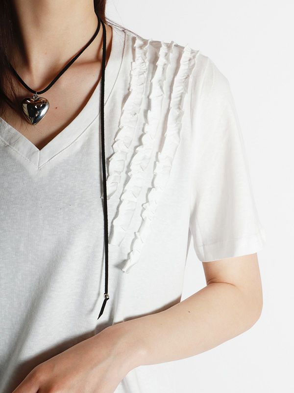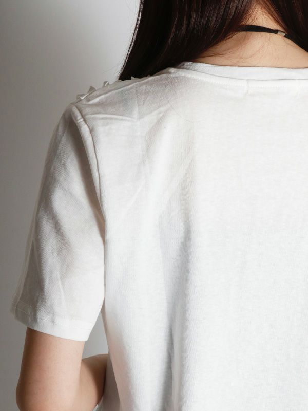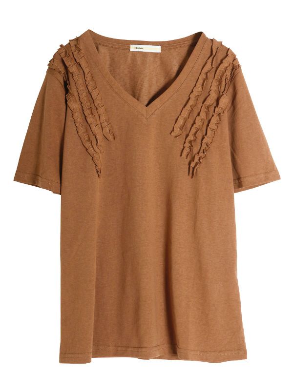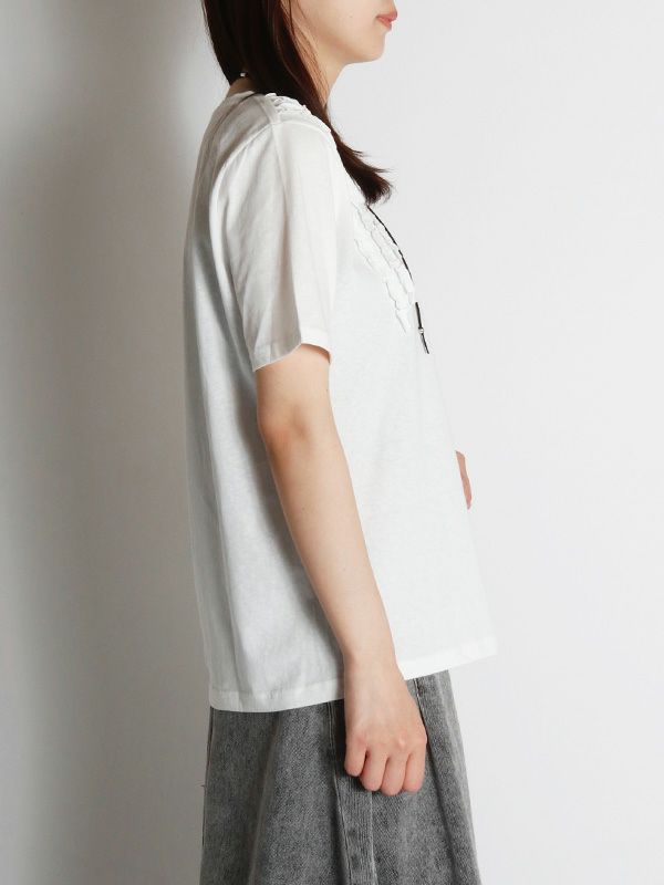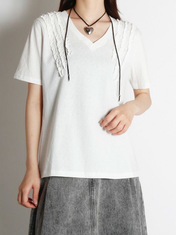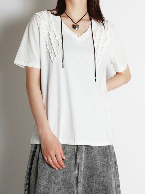 ギャザーを入れたフリルパーツを、ネックラインに沿って取り付けたTシャツ。Vネックで顔周りはスッキリさせながらも華やかな印象に仕上げています。ボディはシンプルにし、甘すぎないデザインに仕上がりました。大人っぽい落ち着いた色味もポイント。フェミニンにもカジュアルにもスタイリングを楽しんでいただけるひと品です。程よくゆとりを持たせたベーシックなサイズ感でパンツからスカートまで幅広いアイテムと合わせていただけます。