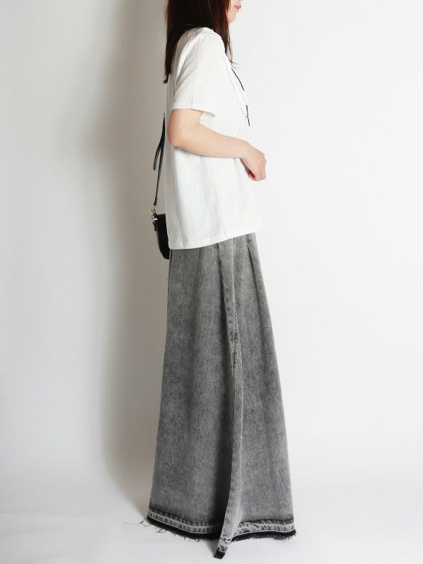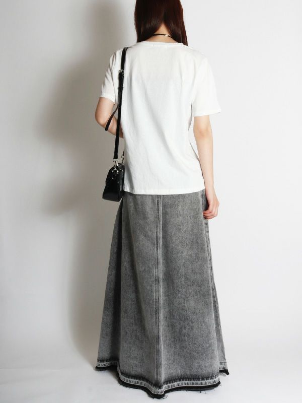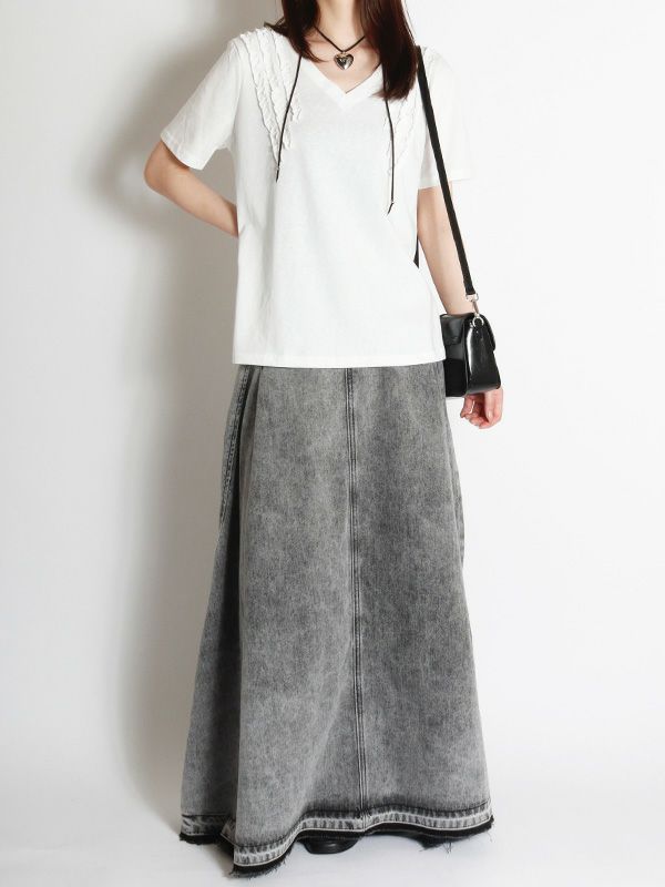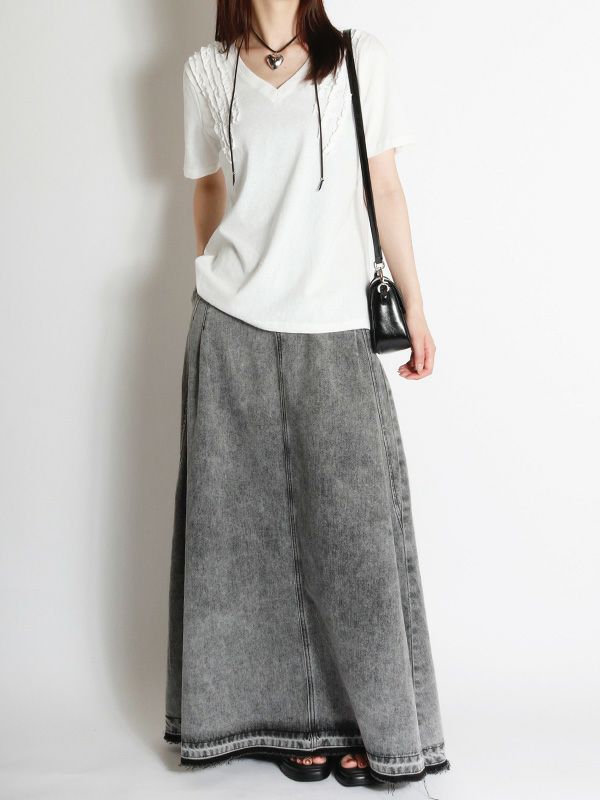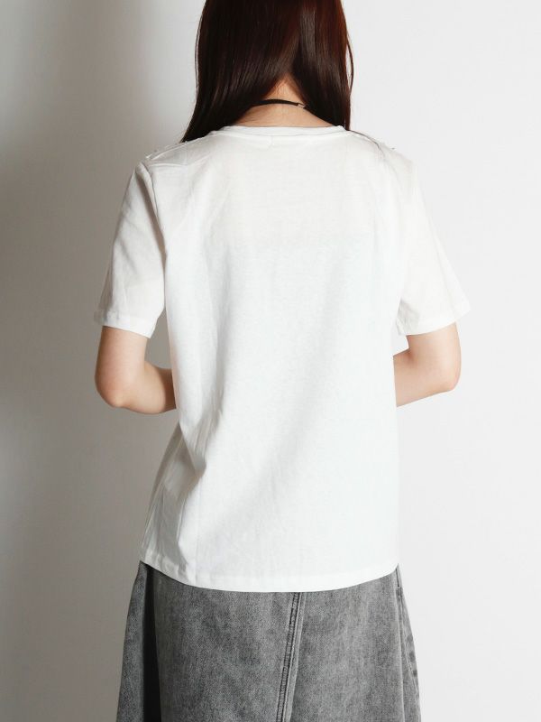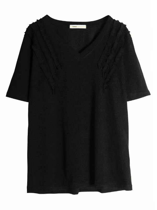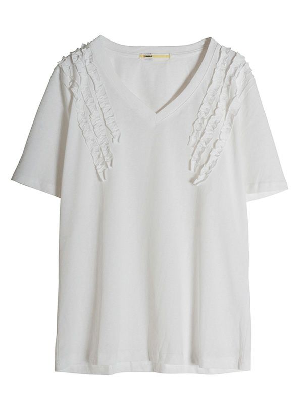ギャザーを入れたフリルパーツを、ネックラインに沿って取り付けたTシャツ。Vネックで顔周りはスッキリさせながらも華やかな印象に仕上げています。ボディはシンプルにし、甘すぎないデザインに仕上がりました。大人っぽい落ち着いた色味もポイント。フェミニンにもカジュアルにもスタイリングを楽しんでいただけるひと品です。程よくゆとりを持たせたベーシックなサイズ感でパンツからスカートまで幅広いアイテムと合わせていただけます。