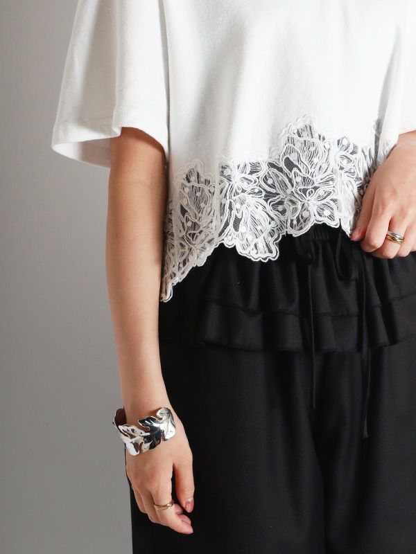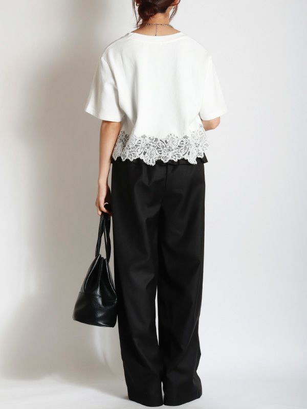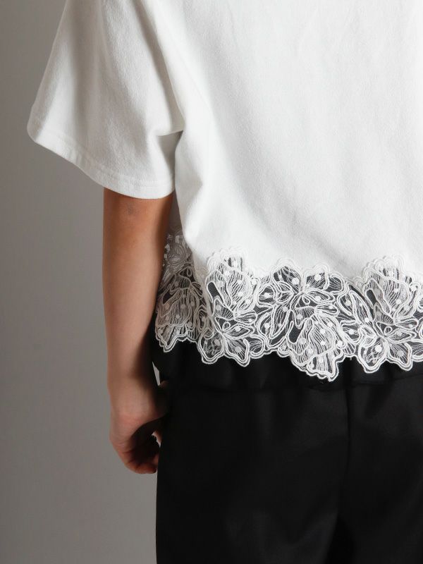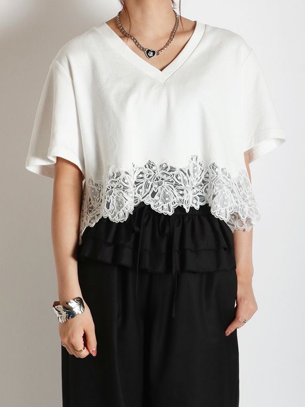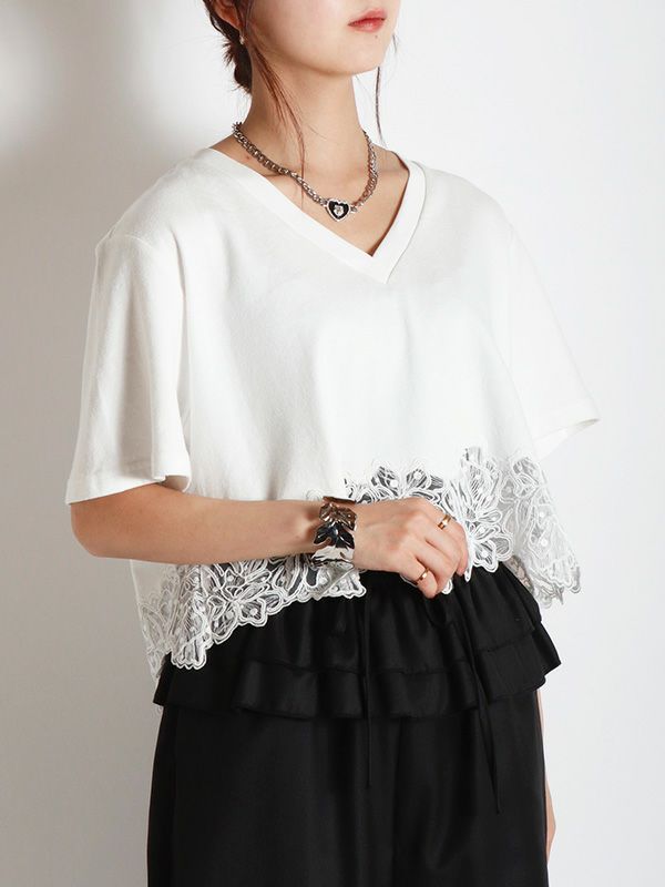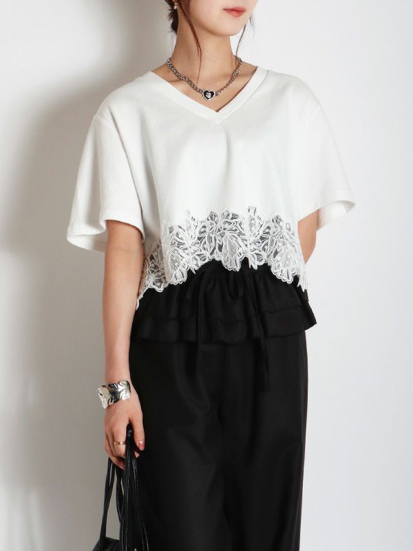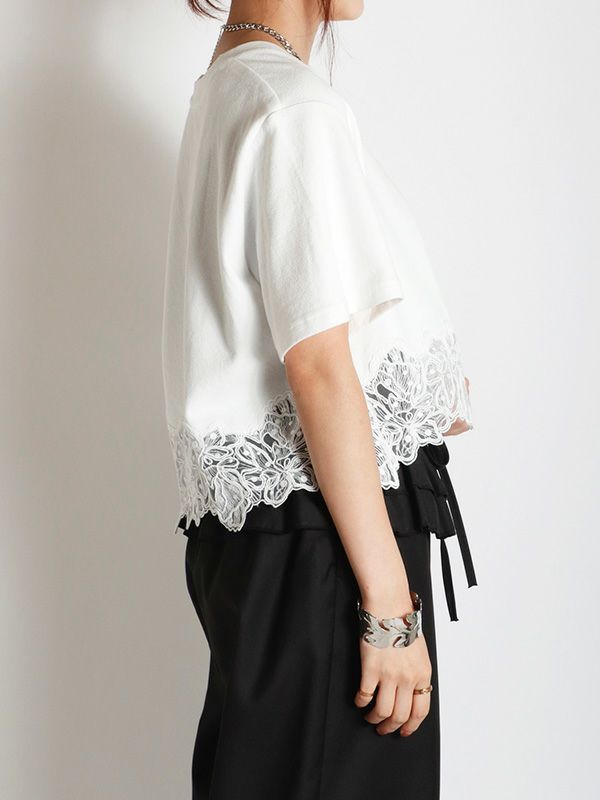 裾のレースデザインとコンパクトな着丈が、フェミニンで軽やかな印象のTシャツ。シンプルながらも異素材のコンビネーションが華やぎを与えてくれます。ゆとりを持たせた身幅で快適な着心地、やや広めに設計されたVネックも顔周りをすっきりも見せてくれます。デニムやワイドパンツとの合わせはもちろん、タイトスカートと合わせたエレガントなスタイルもおすすめです。シンプルなボトムスと合わせることで、Tシャツのデザインが引き立ちます。