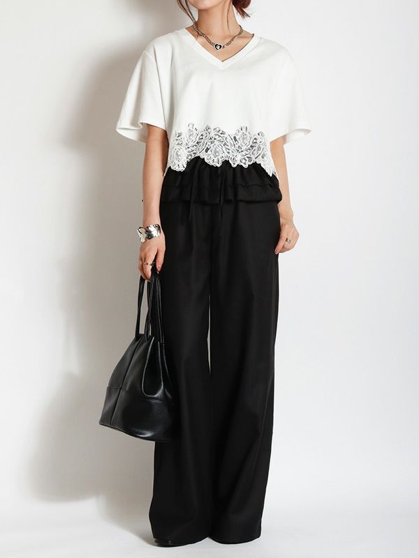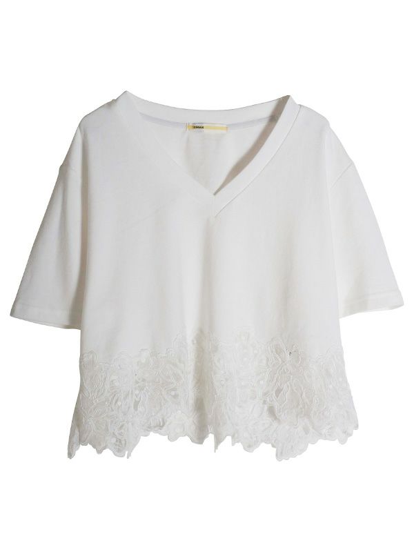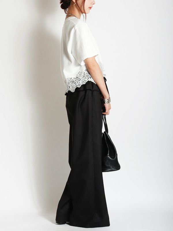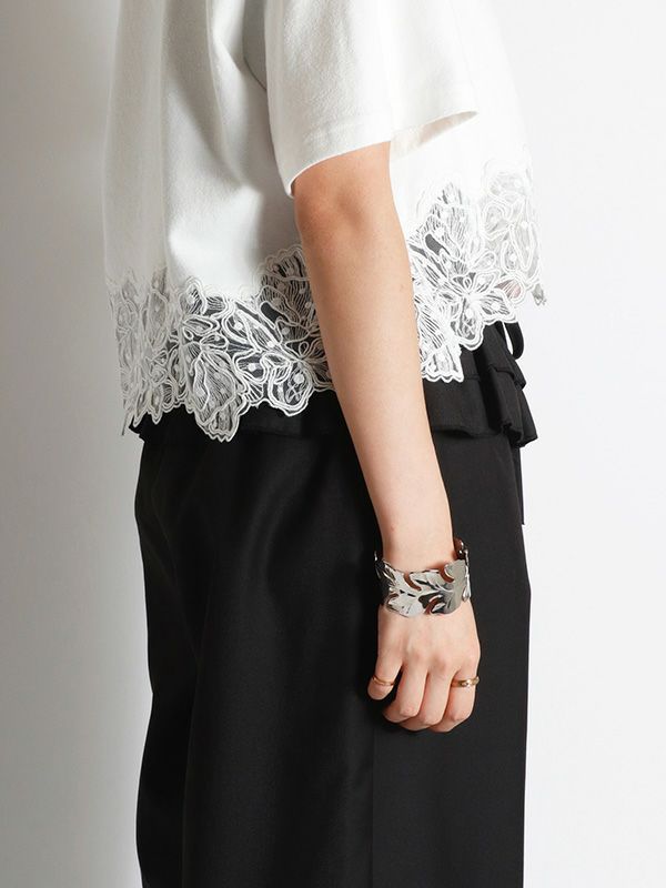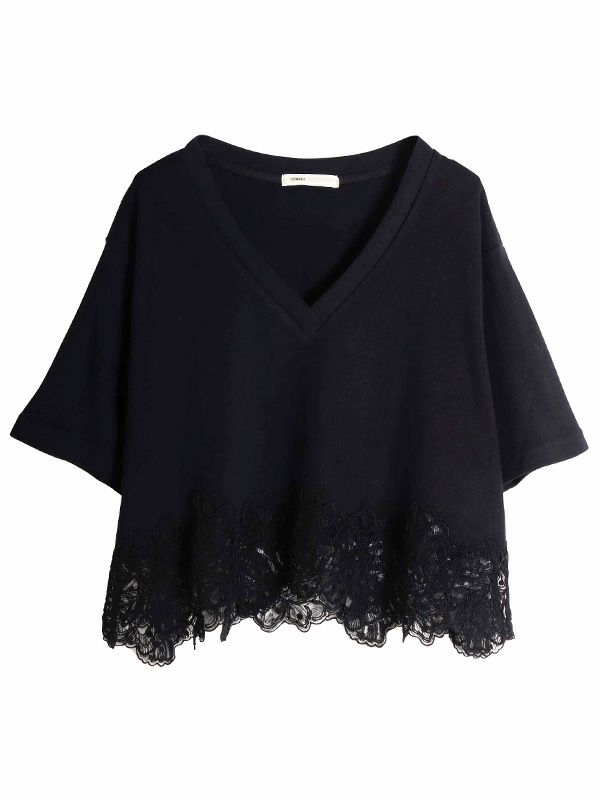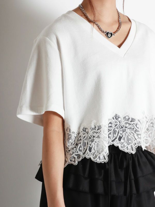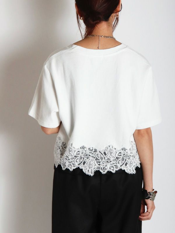 裾のレースデザインとコンパクトな着丈が、フェミニンで軽やかな印象のTシャツ。シンプルながらも異素材のコンビネーションが華やぎを与えてくれます。ゆとりを持たせた身幅で快適な着心地、やや広めに設計されたVネックも顔周りをすっきりも見せてくれます。デニムやワイドパンツとの合わせはもちろん、タイトスカートと合わせたエレガントなスタイルもおすすめです。シンプルなボトムスと合わせることで、Tシャツのデザインが引き立ちます。