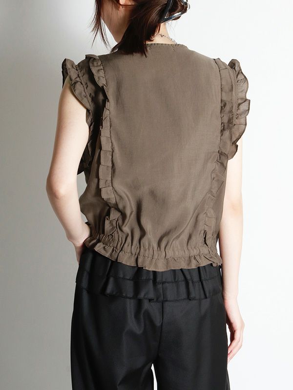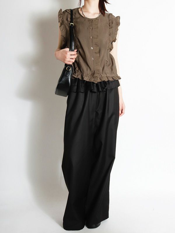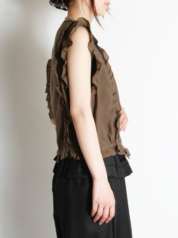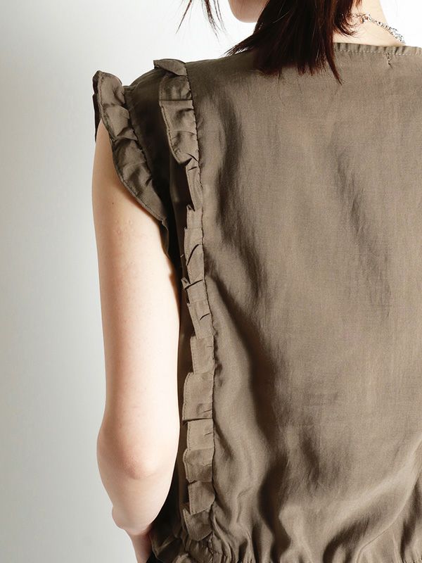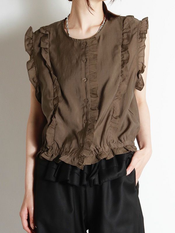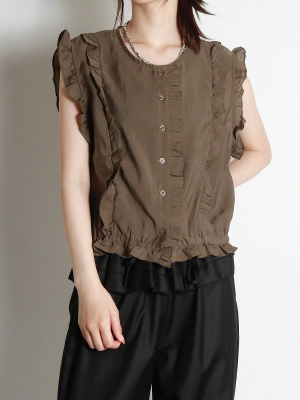 品なフリルデザインが目を引く、ノースリーブのフリルトップス。 甘くなりすぎない落ち着いたダークトーンの色展開が大人の女性らしさを引き立てます。コンパクトながら体のラインを拾わず、程良く体から離れるシルエット。フレアスカートを合わせたフェミニンなコーディネートの他、デニムを合わせたカジュアルスタイルも◎。ジャケットやワイドパンツと合わせてきれいめに着用するのもおすすめです。