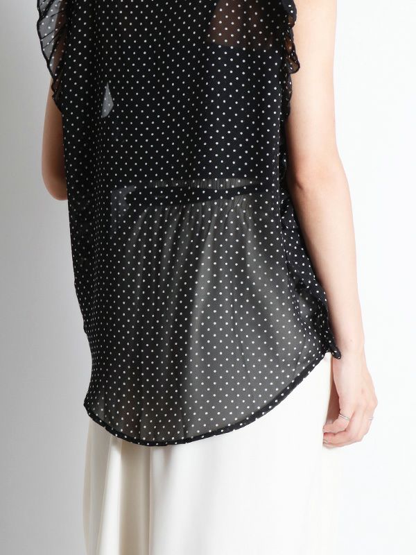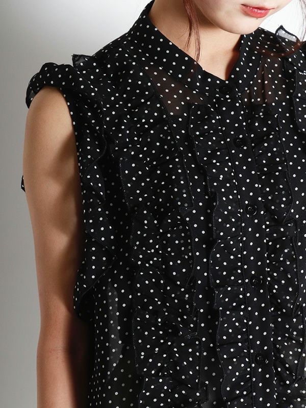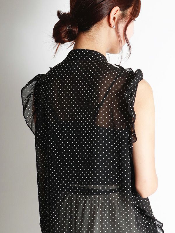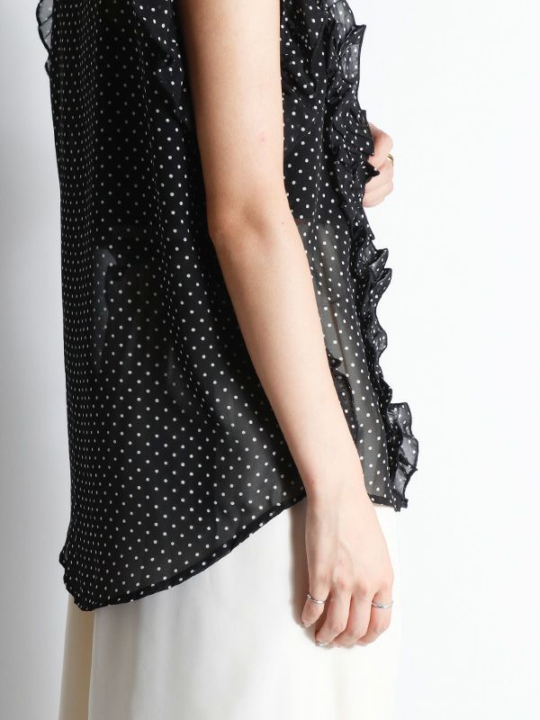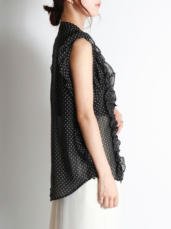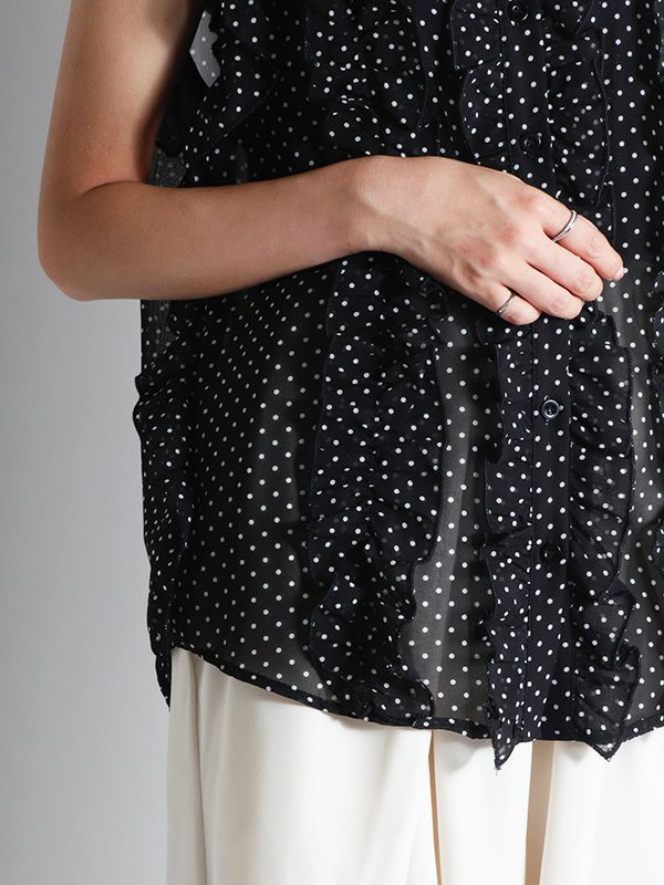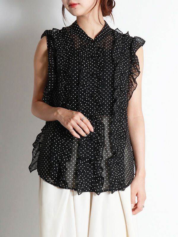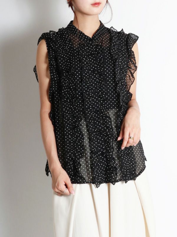たっぷりとした大胆フリルが華やかなスリーブレスブラウス。シンプルながらも存在感があり、トレンドに左右されず長くご愛用いただけます。無地ブラックとドット柄の2色展開で、それぞれ異なる表情をお楽しみいただけます。きれいめコーディネートにも相性抜群。プリーツスカートやフレアスカートを合わせて、クラシカルな雰囲気のオケージョンスタイルにも。デニムを合わせてカジュアルダウンしたスタイルにもマッチします。