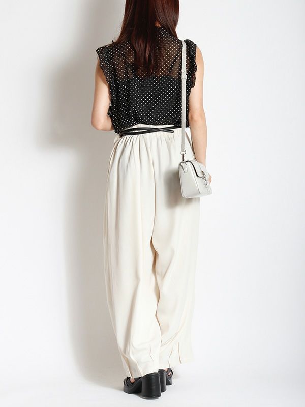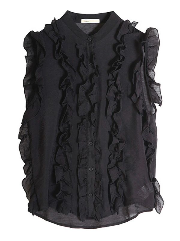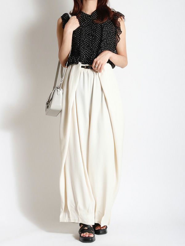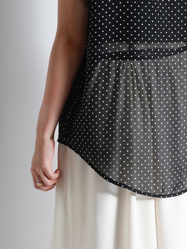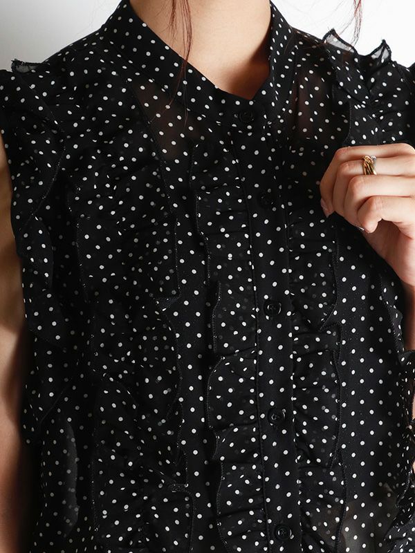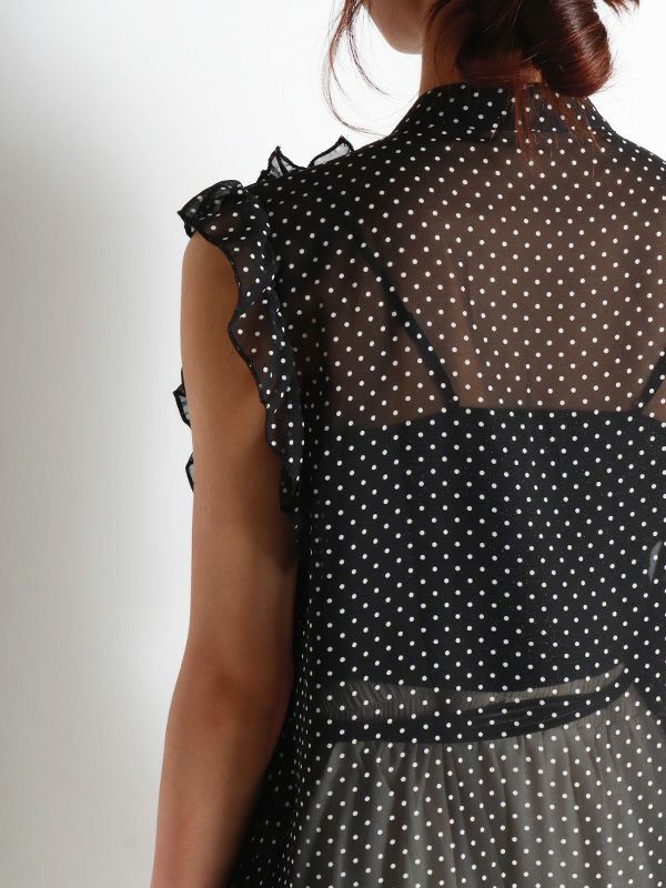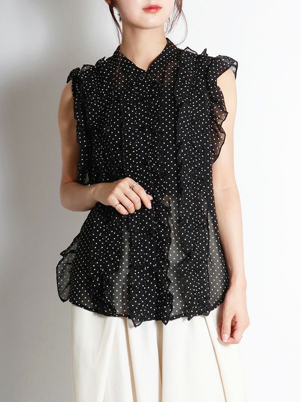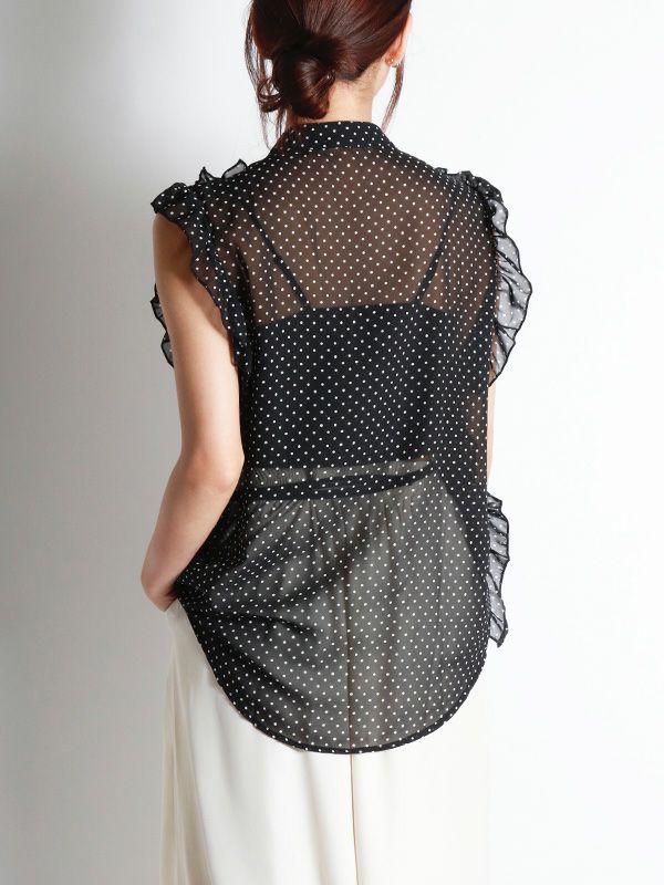 たっぷりとした大胆フリルが華やかなスリーブレスブラウス。シンプルながらも存在感があり、トレンドに左右されず長くご愛用いただけます。無地ブラックとドット柄の2色展開で、それぞれ異なる表情をお楽しみいただけます。きれいめコーディネートにも相性抜群。プリーツスカートやフレアスカートを合わせて、クラシカルな雰囲気のオケージョンスタイルにも。デニムを合わせてカジュアルダウンしたスタイルにもマッチします。